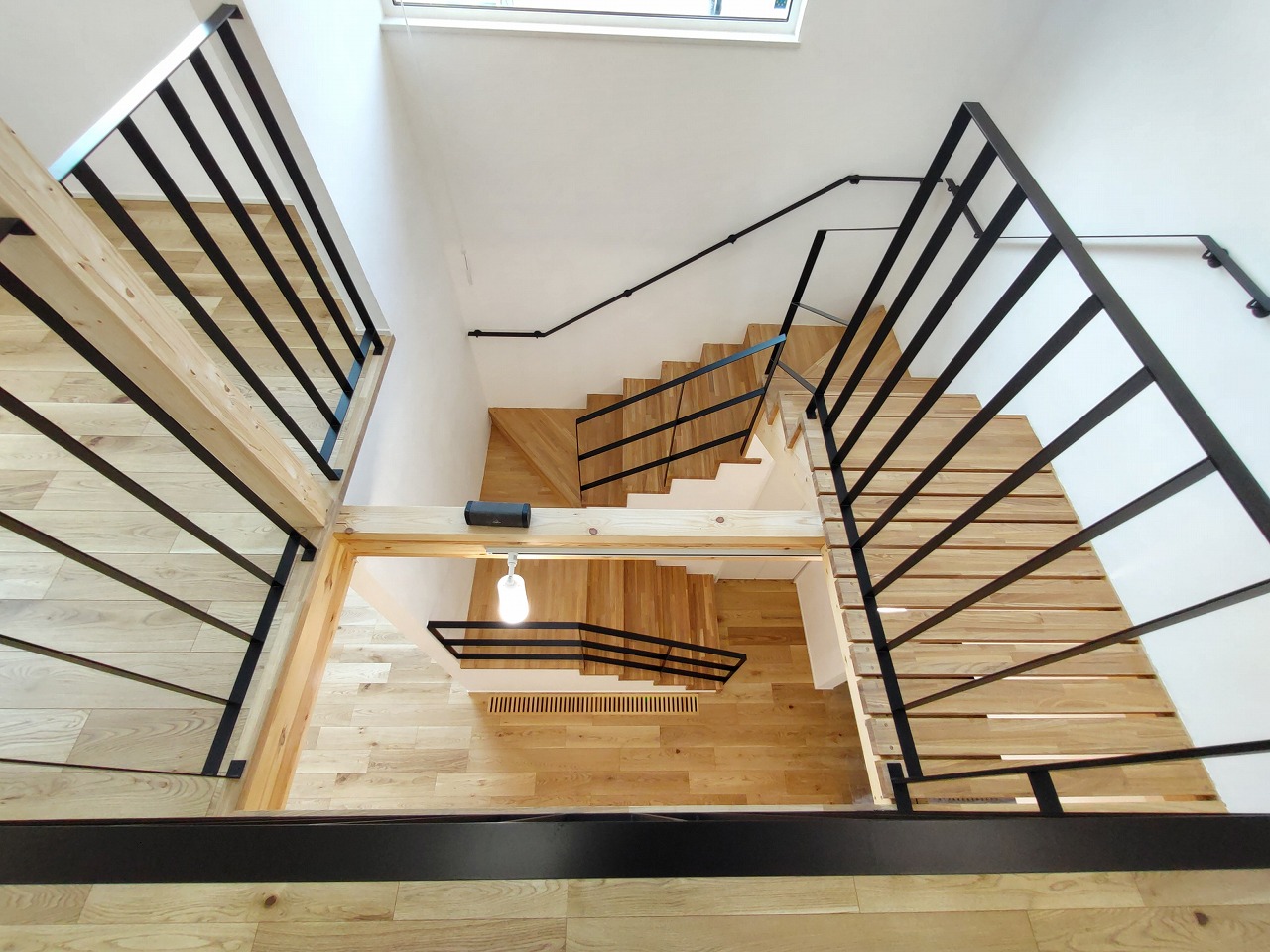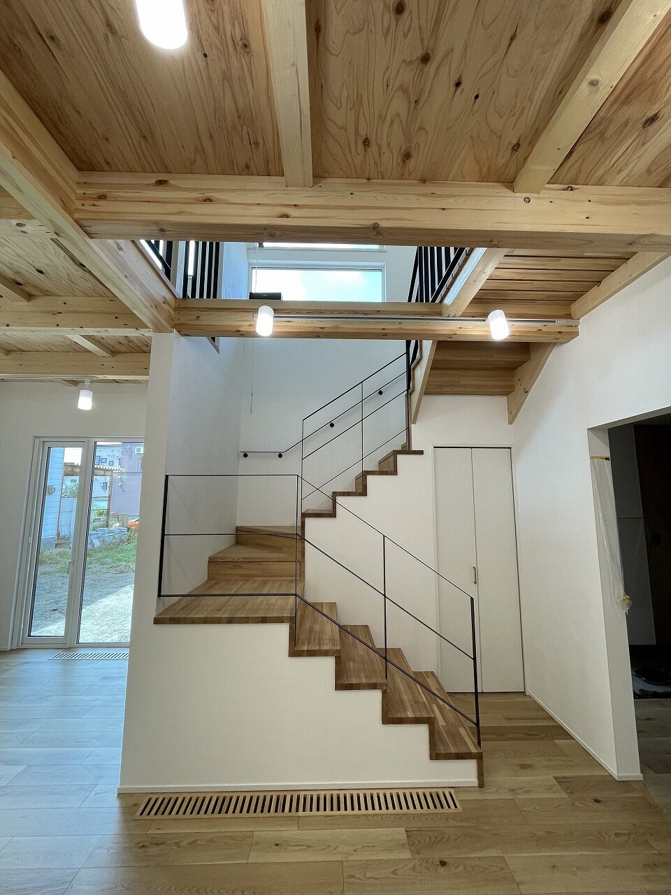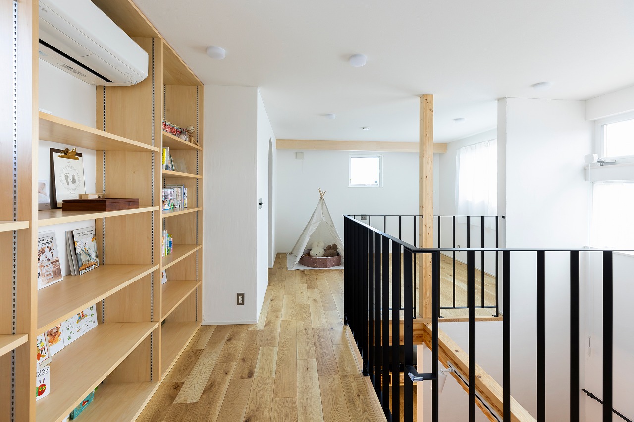 2階、洋室前から全体を見渡す。画像右、南側の窓からは山の稜線が見え、眺めがいい。この家の壁面は全てご主人が塗装したとのこと。家づくりの当初からやってみたいと希望されていたのだとか。質の良い塗り壁をコストを抑えて実現したのはもちろんだが、なにより思い出になった