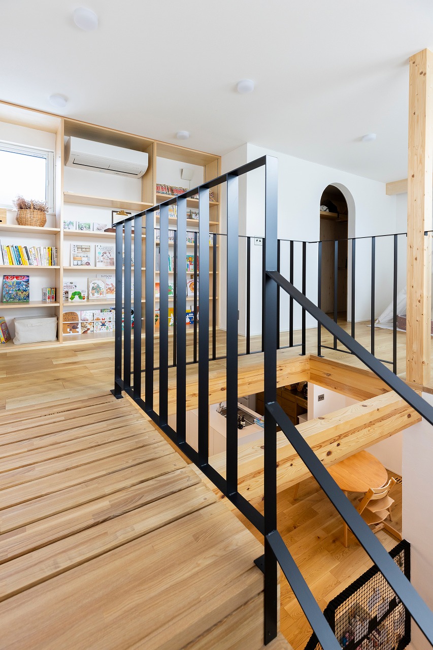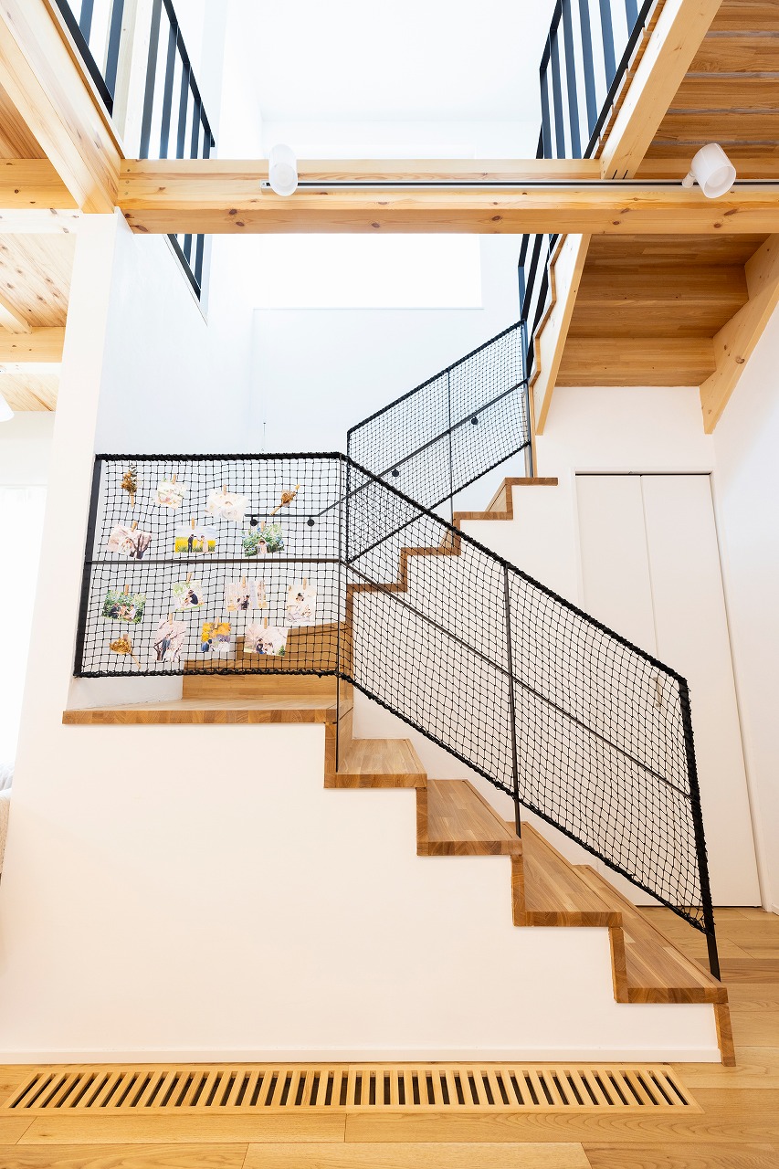 2階吹き抜けから1階を見下ろす。階段と2階を結ぶブリッジは要望から簀の子を採用。視線や光が抜け、縦のつながりが一層感じられるようになった。吹き抜けの上部には開閉できる窓を計画。風が通り、一年を通して快適に暮らせる