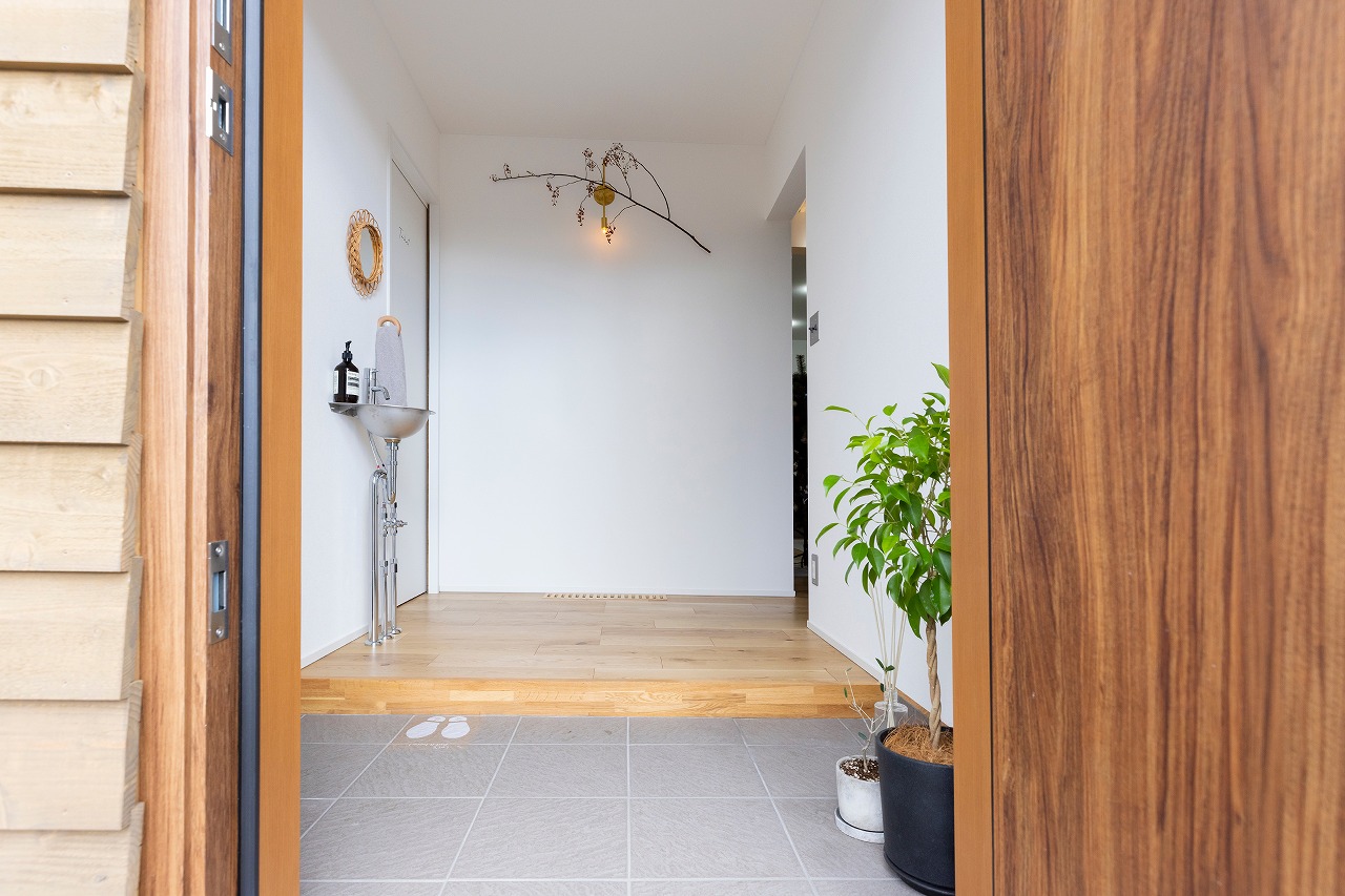 玄関。土間スペースは左に設けられたシューズクローゼットにも伸びる。右奥の開口を進むとLDKがある。あえて仕切り戸を設けず、LDKの開放的な雰囲気を強調した