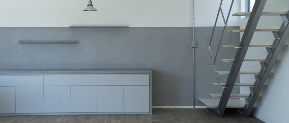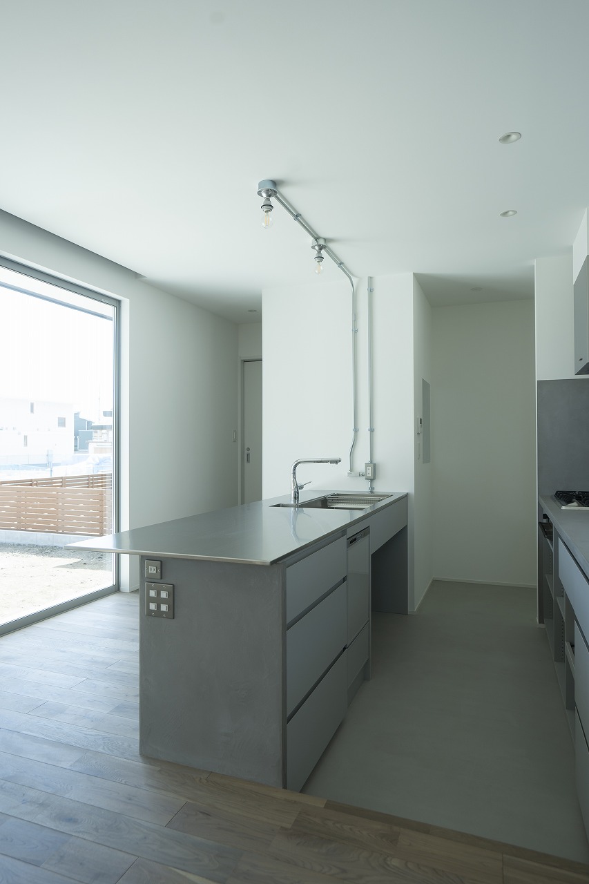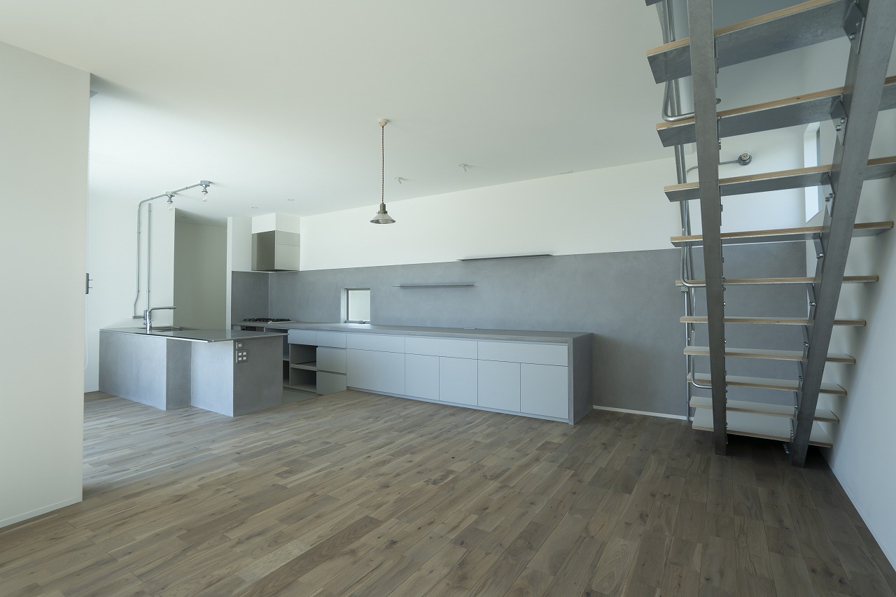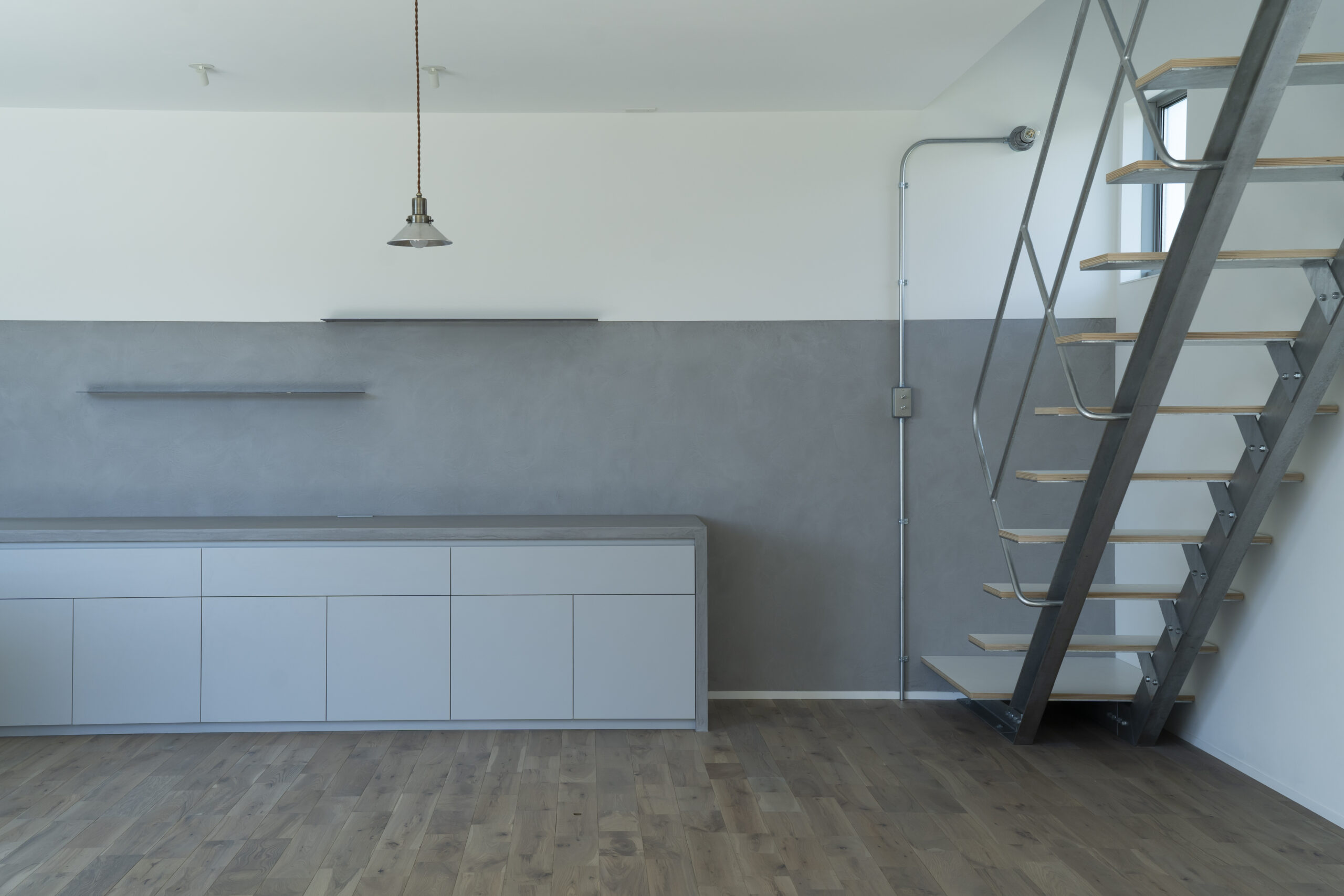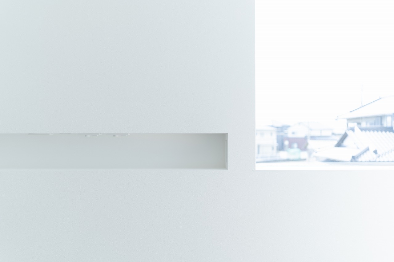 1階LDK。配色を白とグレーに抑えシャープな印象を生み出した。玄関からLDKに入るとまず見えるのがこの風景。ニッチを効果的に使ってほしいと武本さん。視線の高さより上に物を置かなければ空間はシンプルに整えられるため、ニッチの高さも160cm程度にした
