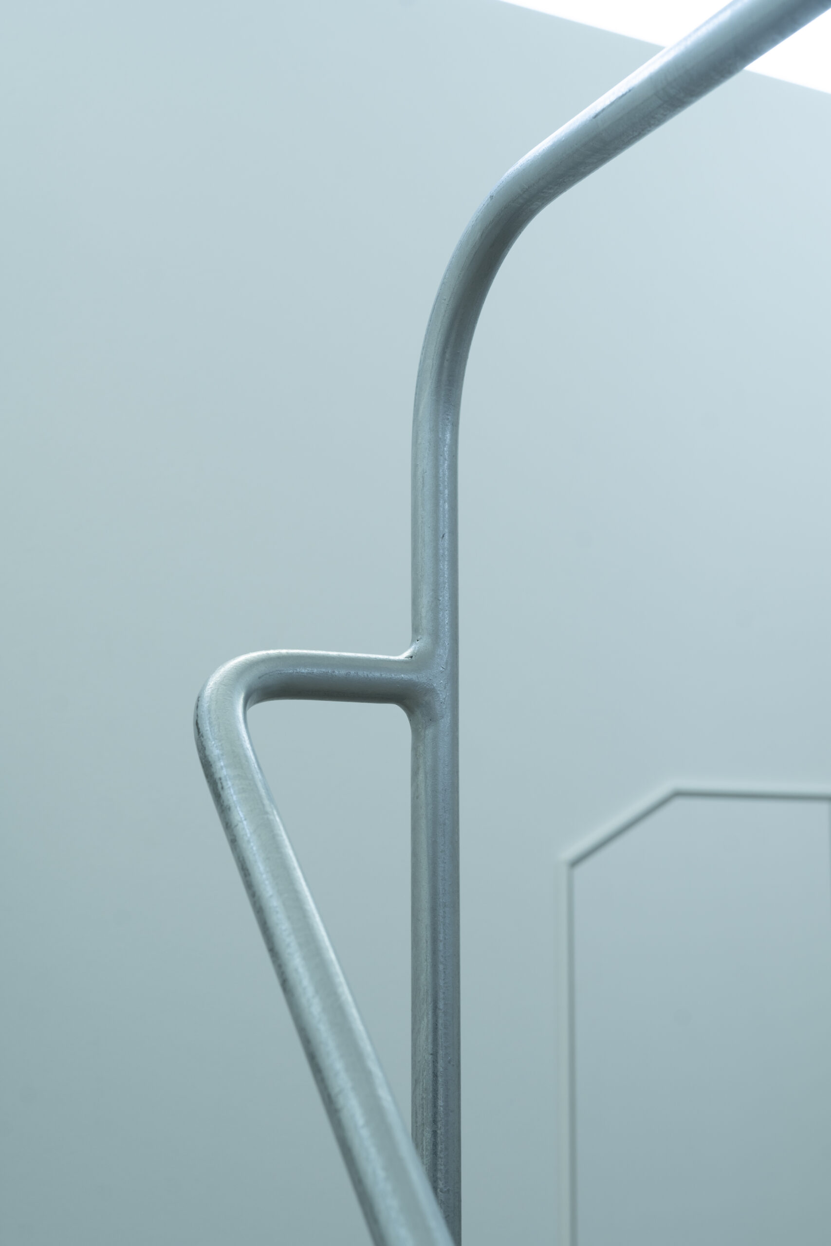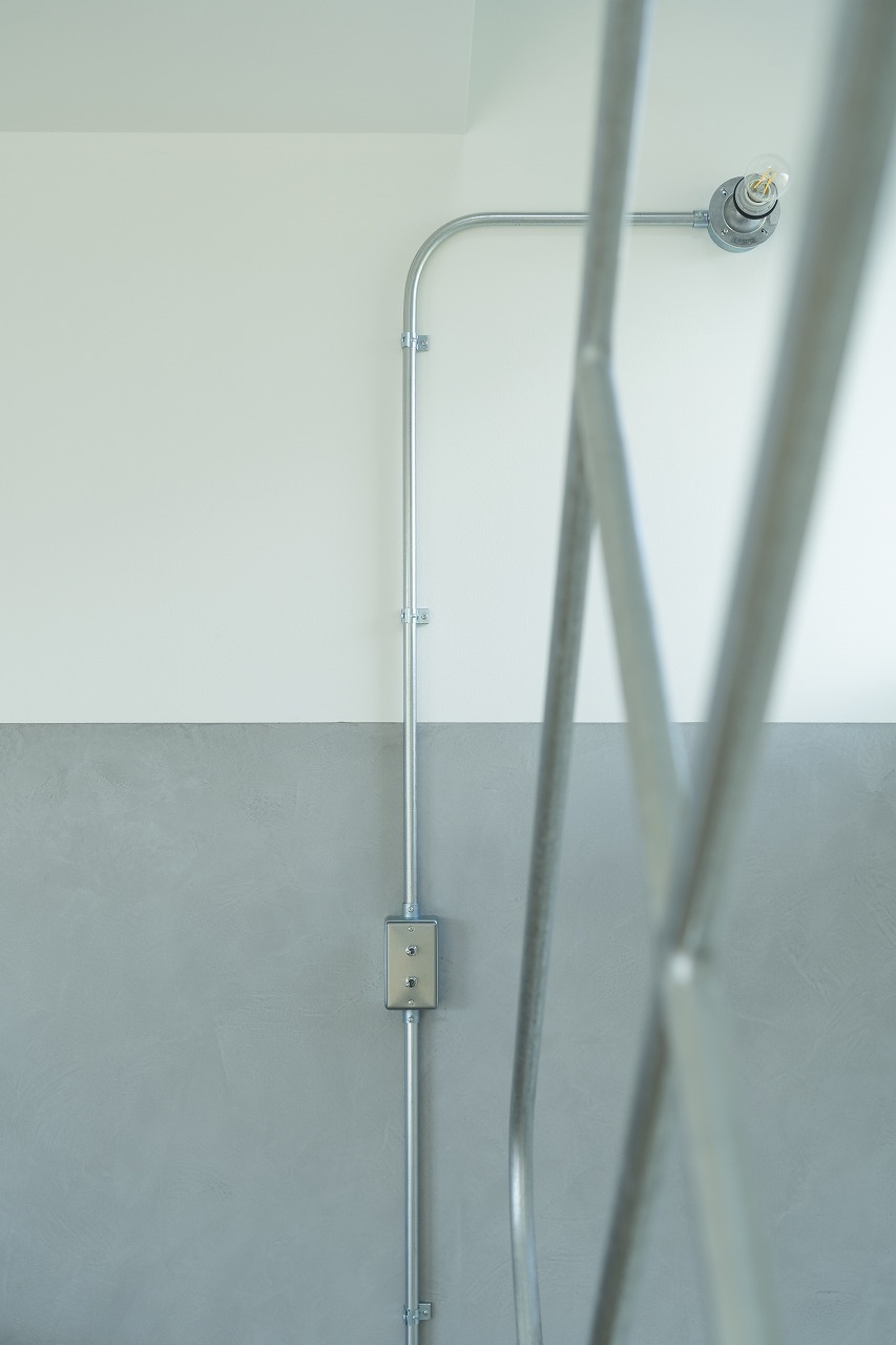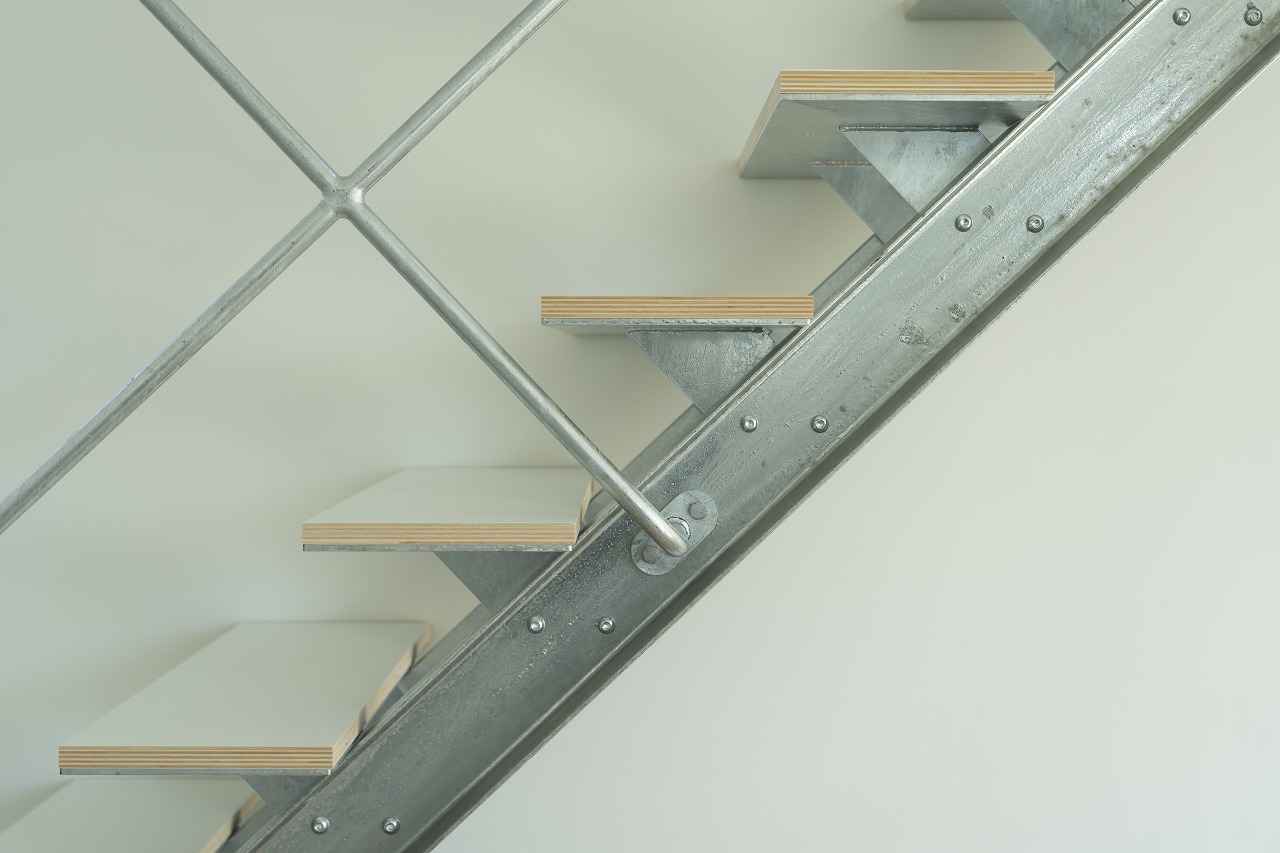階段は、無骨なイメージを表現するため、また印象がシンプルになりすぎないよう、デザインの足し算を施した。ビスは強度的には必要ないが、鉄の質感をより強く押し出すためにつけた。踏板のシナ合板は表面を白く塗装し、側面の共芯の表情は楽しめるようにした