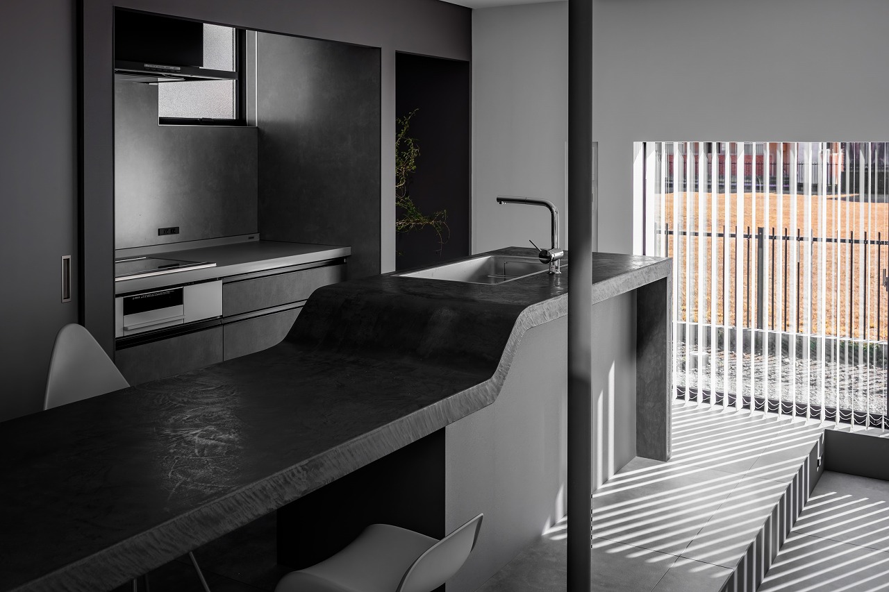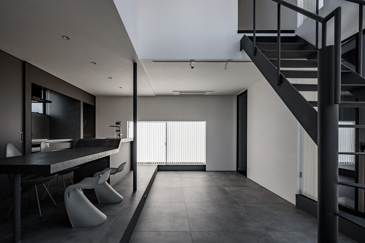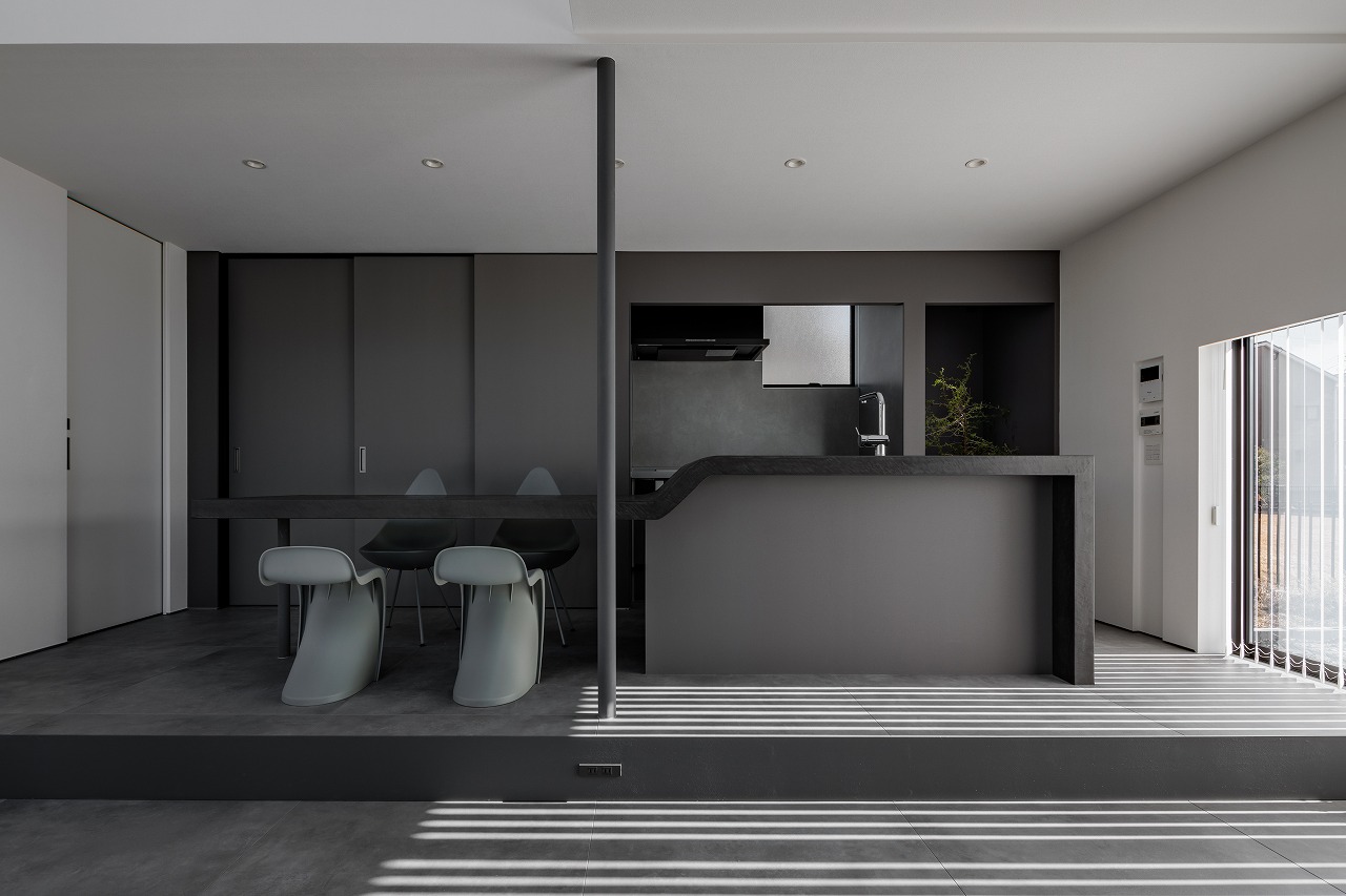 1階LDK。質感が感じられる素材をテーブルや床などに選び、かつ要望のモノトーン配色もグラデーションを取り入れて色味を決定した。おかげで室内に入る光から生まれる陰影が美しく、空間に奥行きが感じられるようになった