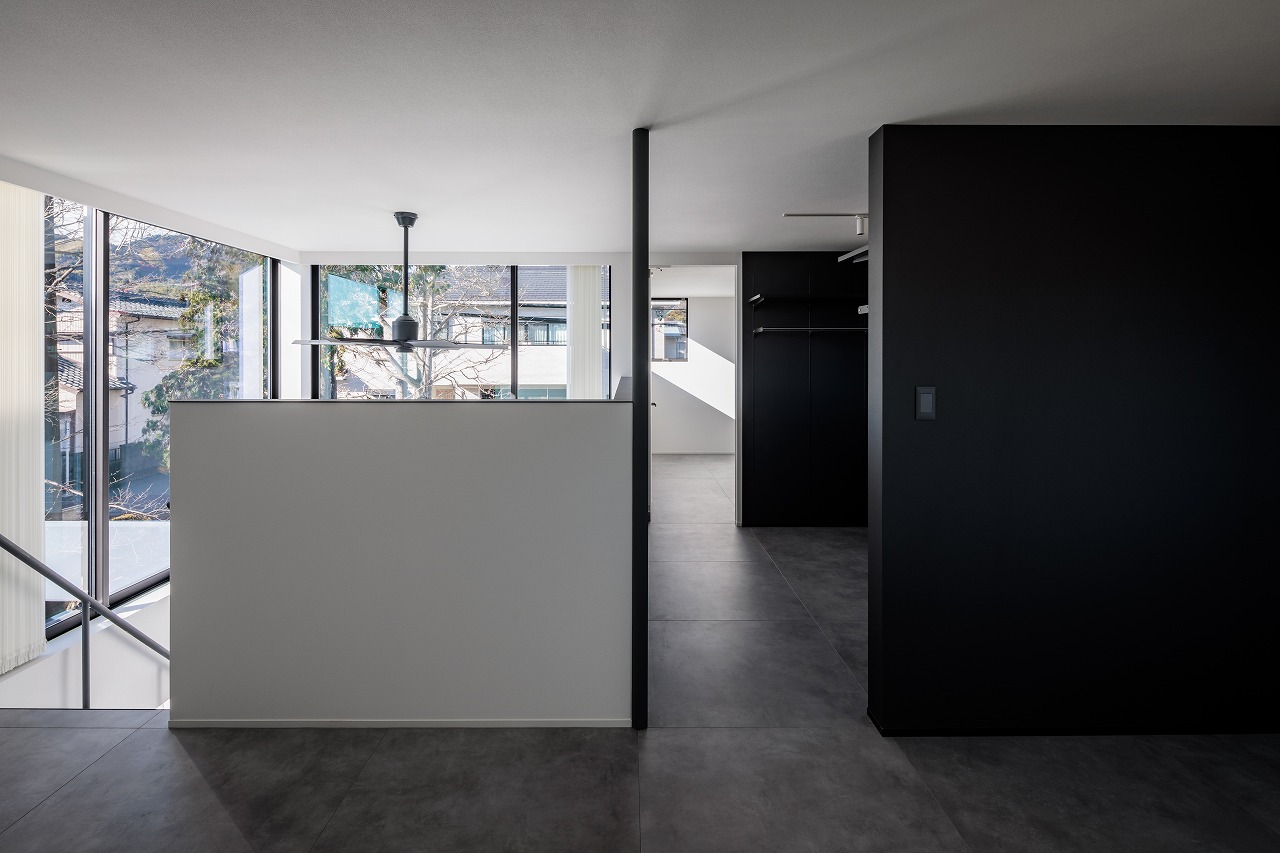 LDKは吹き抜けを活用し2方向を大開口した。記念碑のおかげで隣家まで距離があり、視線は気にならない