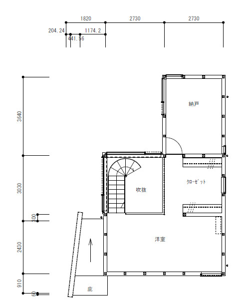 記念碑側、南西から見た外観。吹き抜けの角右側にサウナを設置し、中央のデッキで寛ぐ。さらにデッキから直接出入りできるよう計画した浴室でシャワーを浴びることを想定している