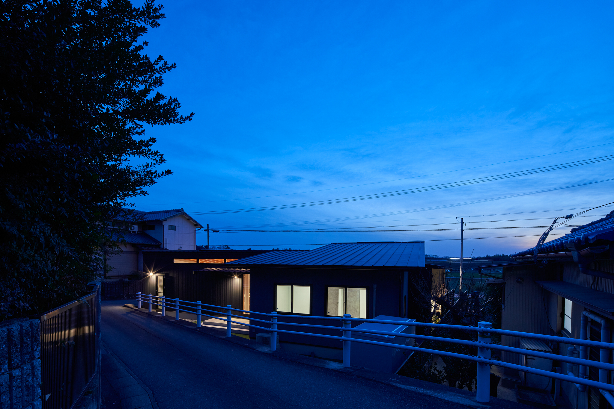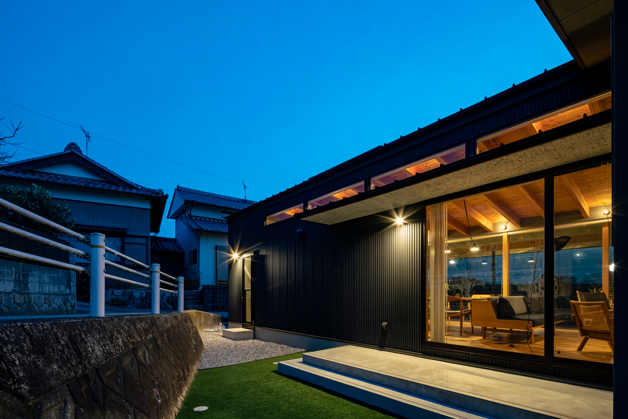 西側外観(夕景)。植栽を照らす照明と、室内から漏れ出る柔らかな光が美しい。この照明を含め、外構もセットで設計されている