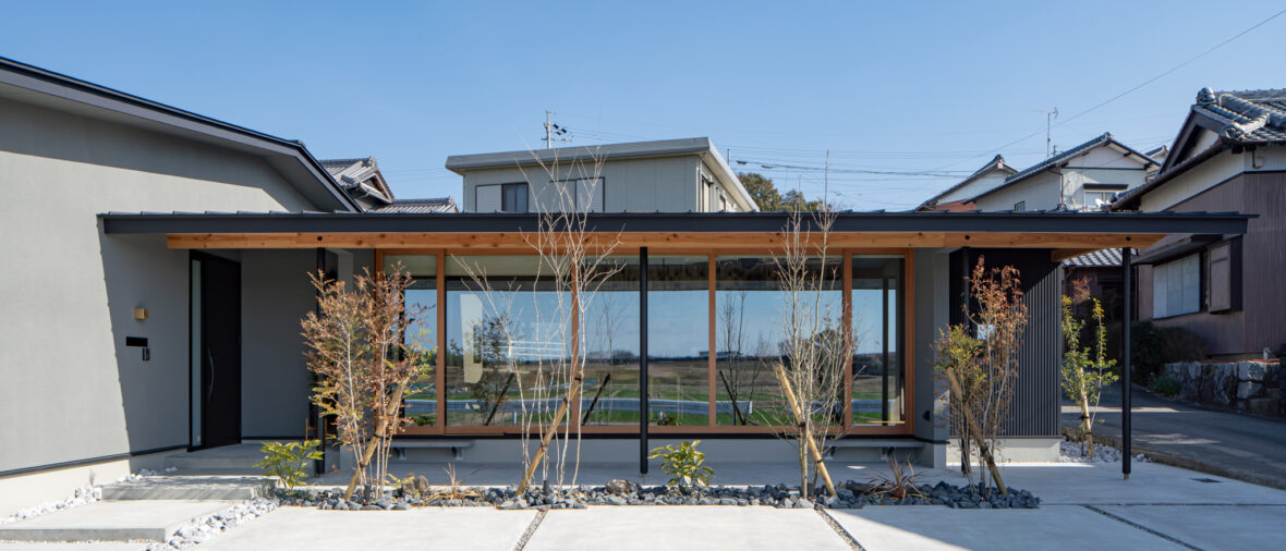 外観(西側正面)。景観が良い西側を大きく開き、そこにLDKを配した(写真中央)。L字型の平屋とし、写真左のエリアには寝室や水回り、子供部屋や収納スペースを集中的に配置。効率的な導線となるプランとした。平屋としたことで、背後の家からも田園風景を眺めることができる