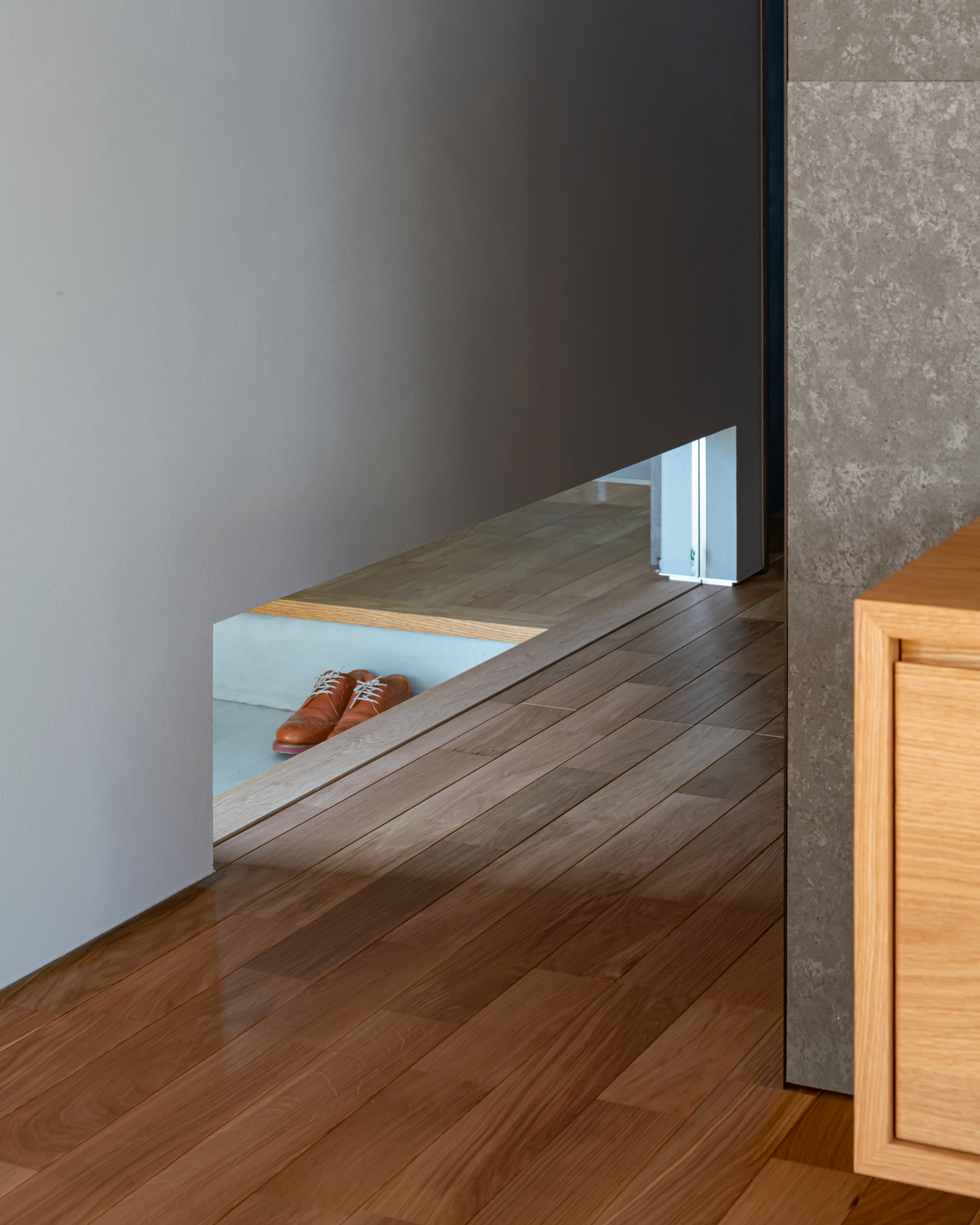 リビング入口に設けられたローサイドライト。光を取り込むだけでなく、帰宅した家族の気配も感じられる