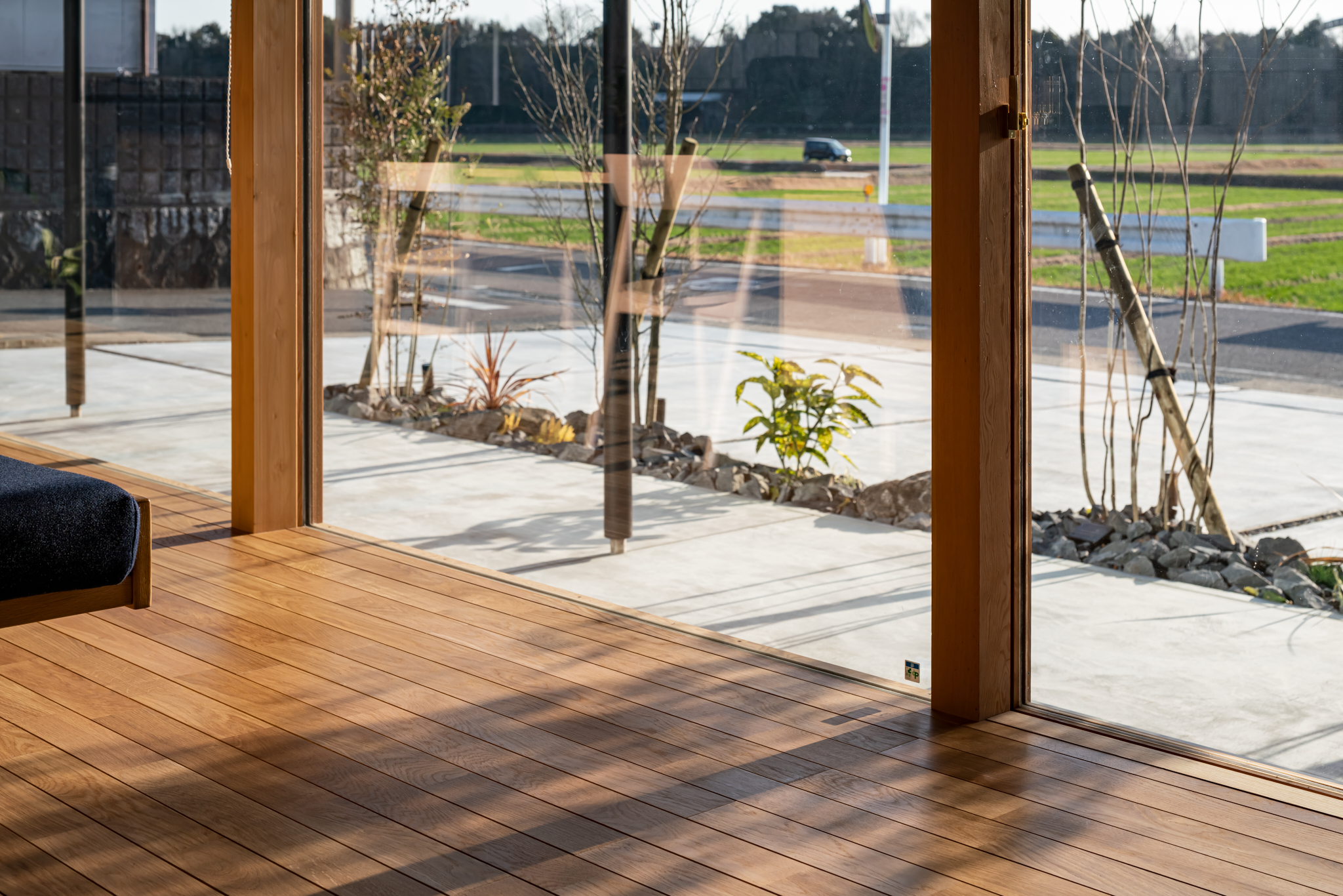 西日対策で植えられた植栽。冬以外の時期には葉が茂り、強い日差しを遮ってくれる。柔らかな樹木の影が作り出す陰影も美しい。西側のほぼすべてを開口部としたため、窓は特注で幅広の木製サッシを採用した