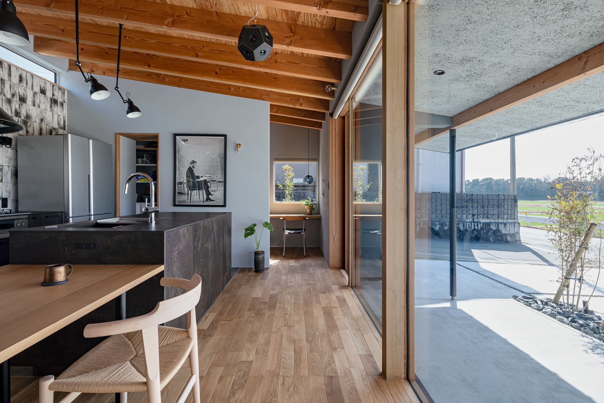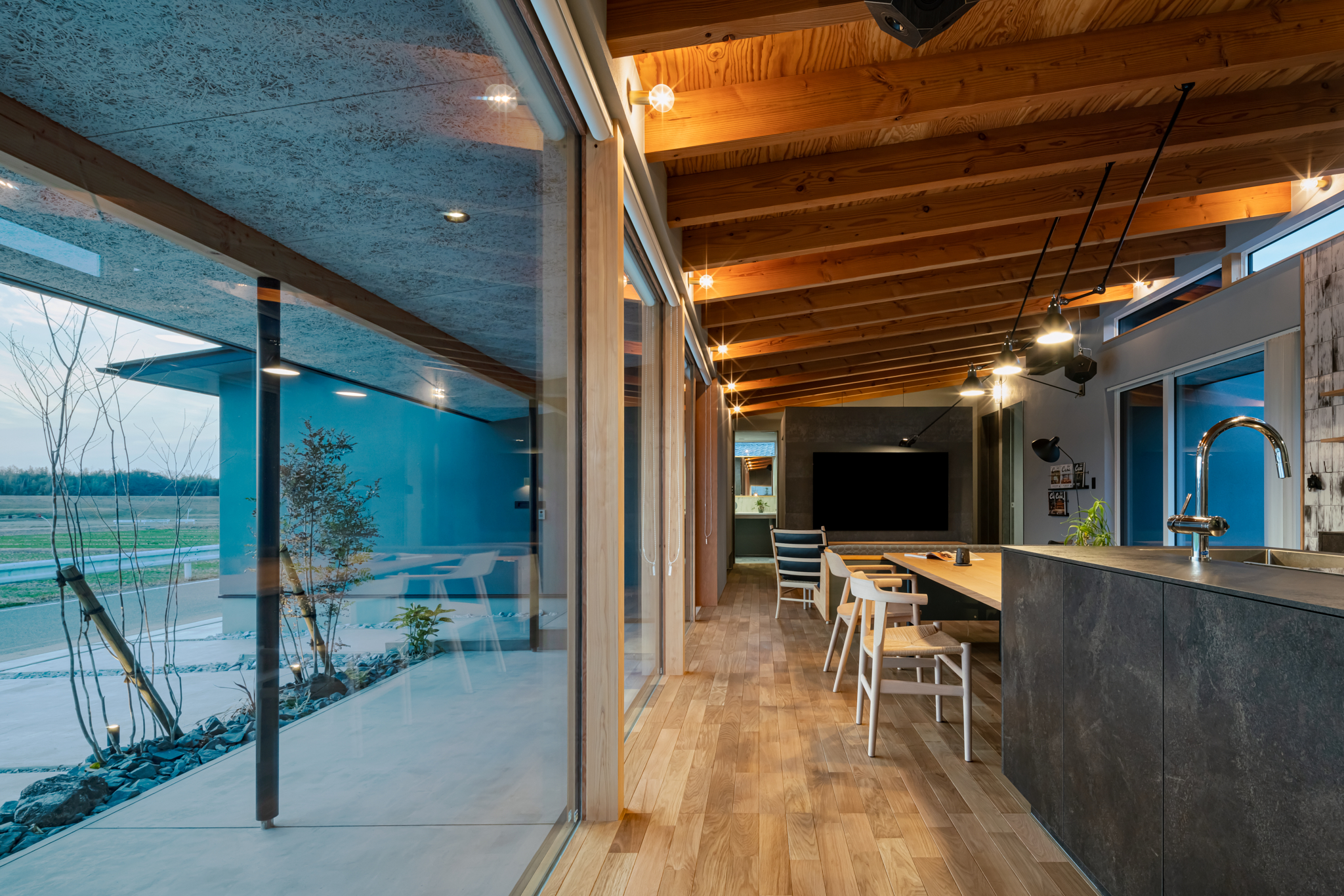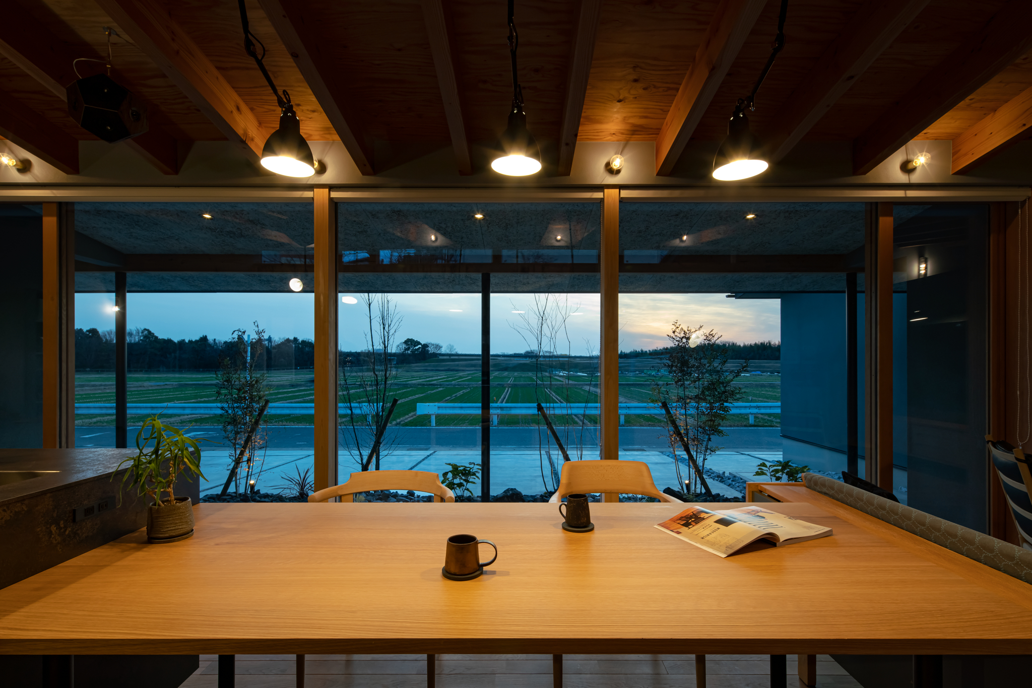 ダイニングから見た田園風景。法規制のおかげで、この先に家が立つことは長期間ないことが予測される。この風景をLDKのどこからでも満喫できるよう、開口部を最大限に広げて確保。照明もすべて、同時に手がけた
