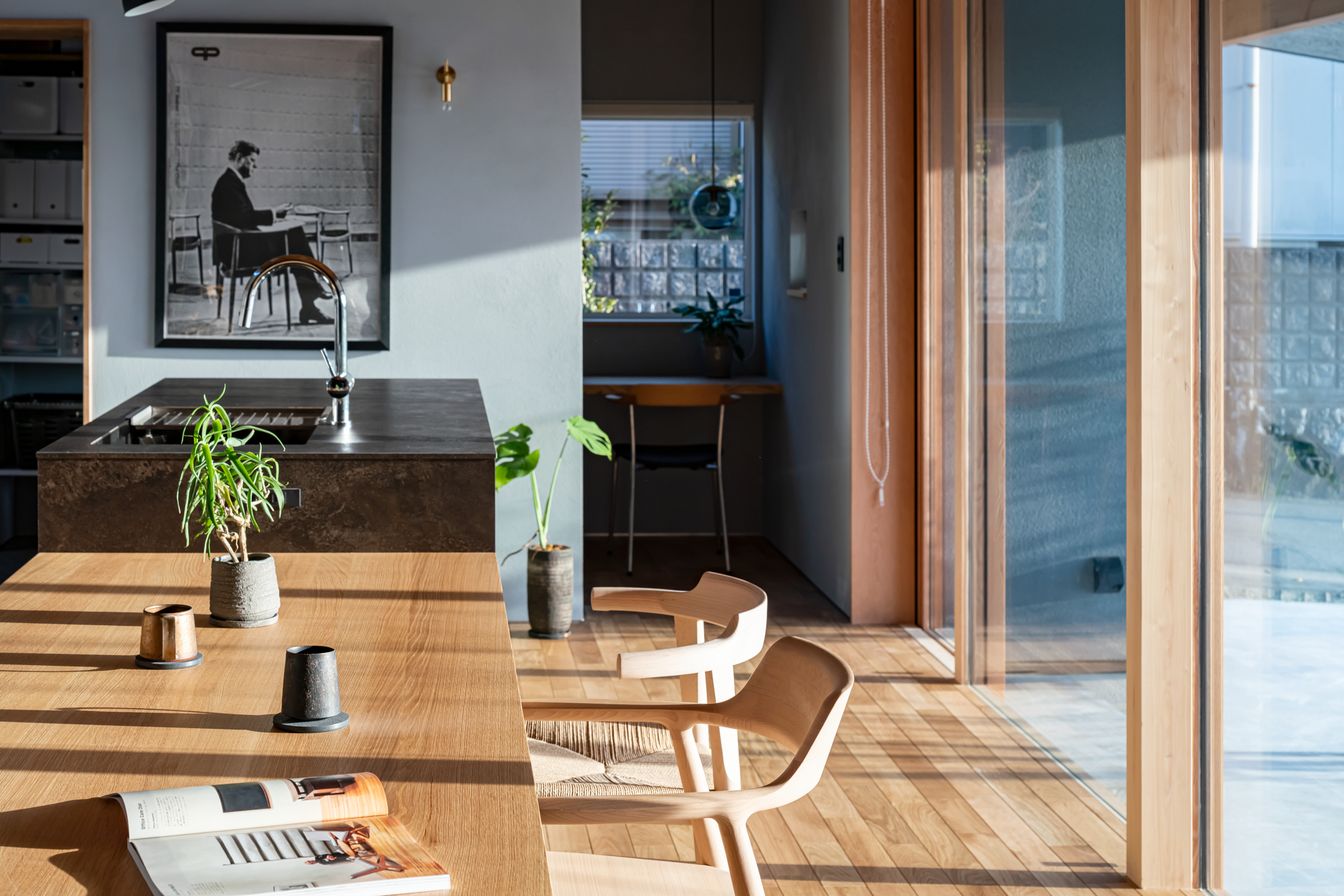 お施主様こだわりの家具が並ぶダイニング。ケネディー大統領が座っている椅子と同じものが、室内で使われている