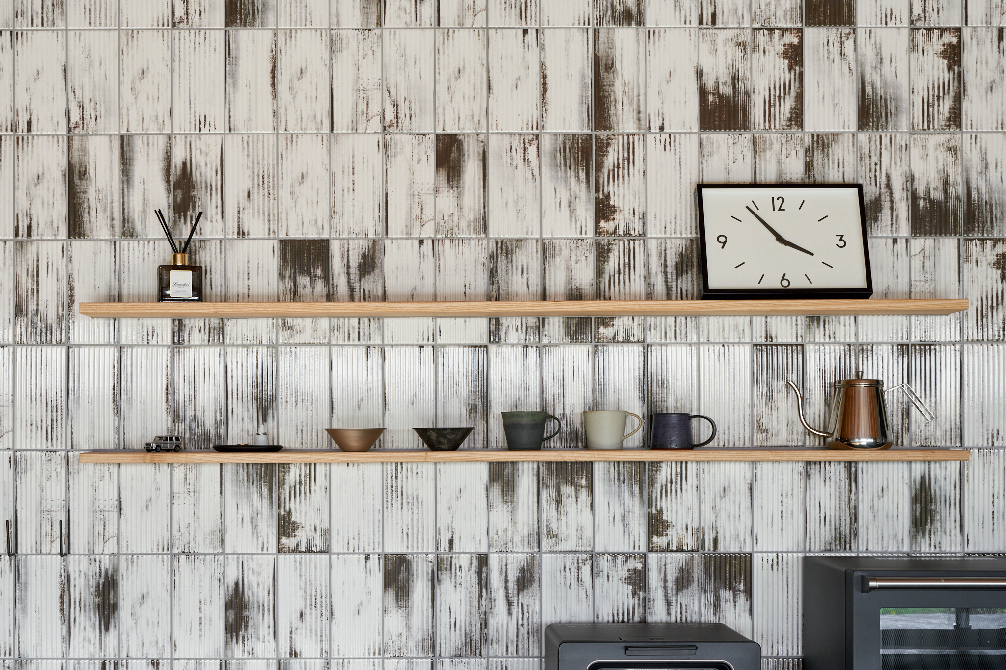 お施主様が一つ一つ丁寧にレイアウトしたという、キッチンの壁面タイル。インテリアにこだわりがあるお施主様ならではのエピソードだ