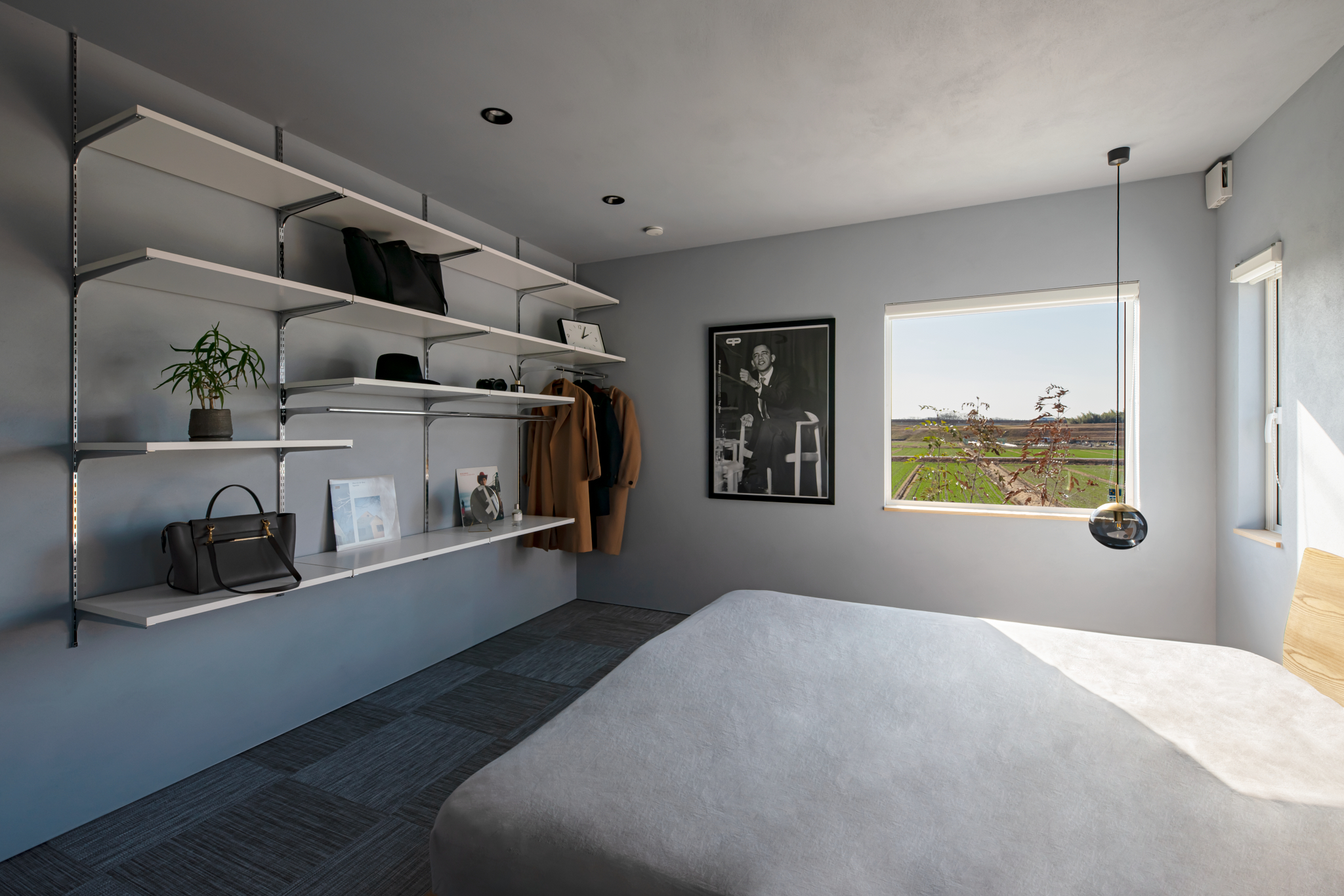 寝室。こちらの窓からも田園風景を楽しむことができる。オバマ大統領が座るポスターに映っている椅子を、お施主様は所有しているそうだ。棚は収納用ではなく、ディスプレイ用。厳選されたものが飾られている