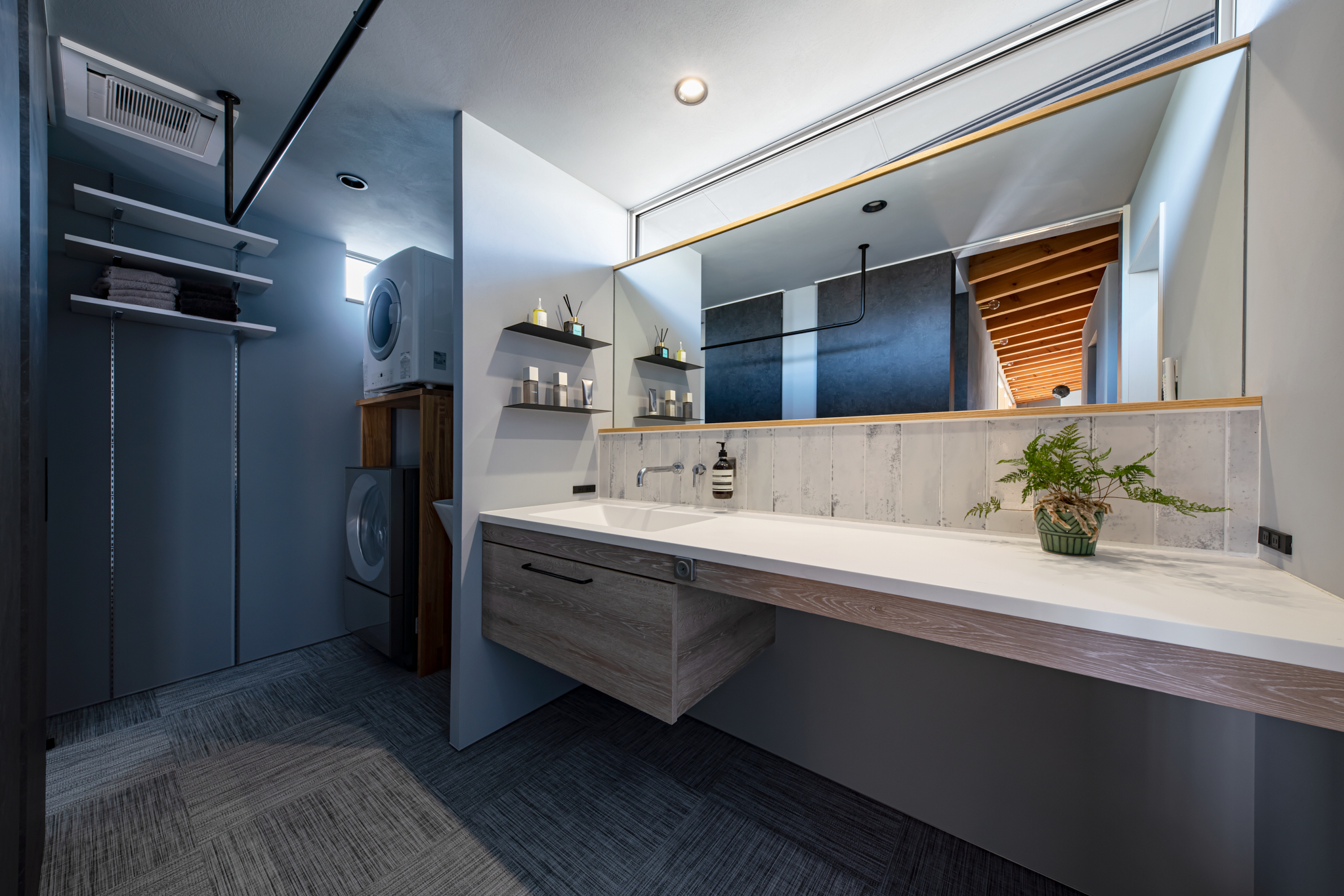 水回り。洗面台は広さを重視し、効率的な家事動線にも気を配った。奥の洗濯機・乾燥機と洗面台の間には、スロップシンクも設置されている。北側に位置するが、洗面台の幅と同じ長さのハイサイドライトにより、十分な明るさを確保している