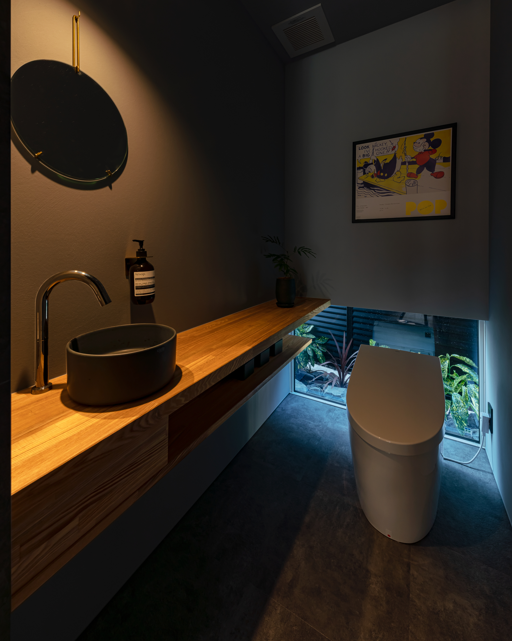 トイレや浴室には坪庭を眺められる窓を設置。外とのつながりを感じることができる