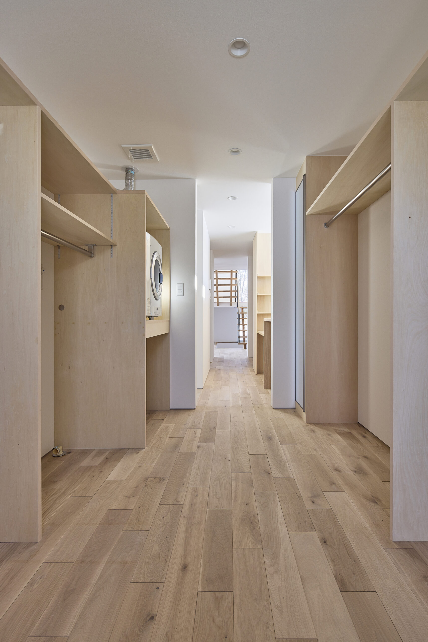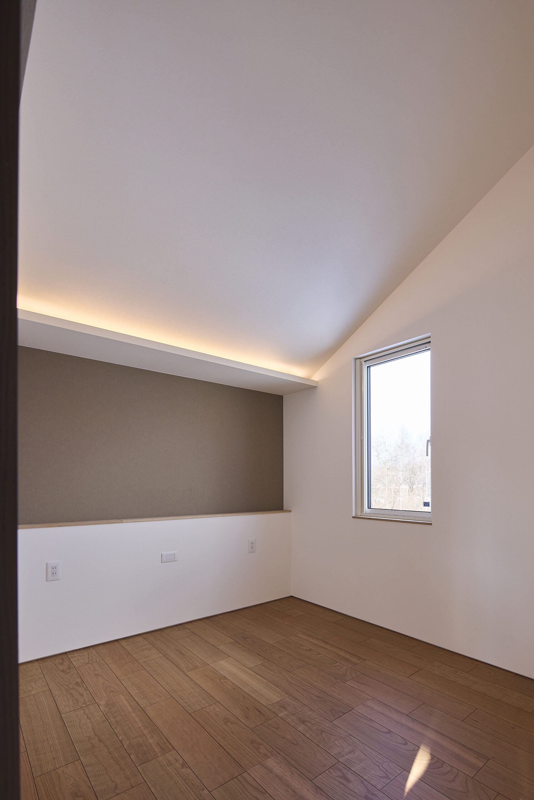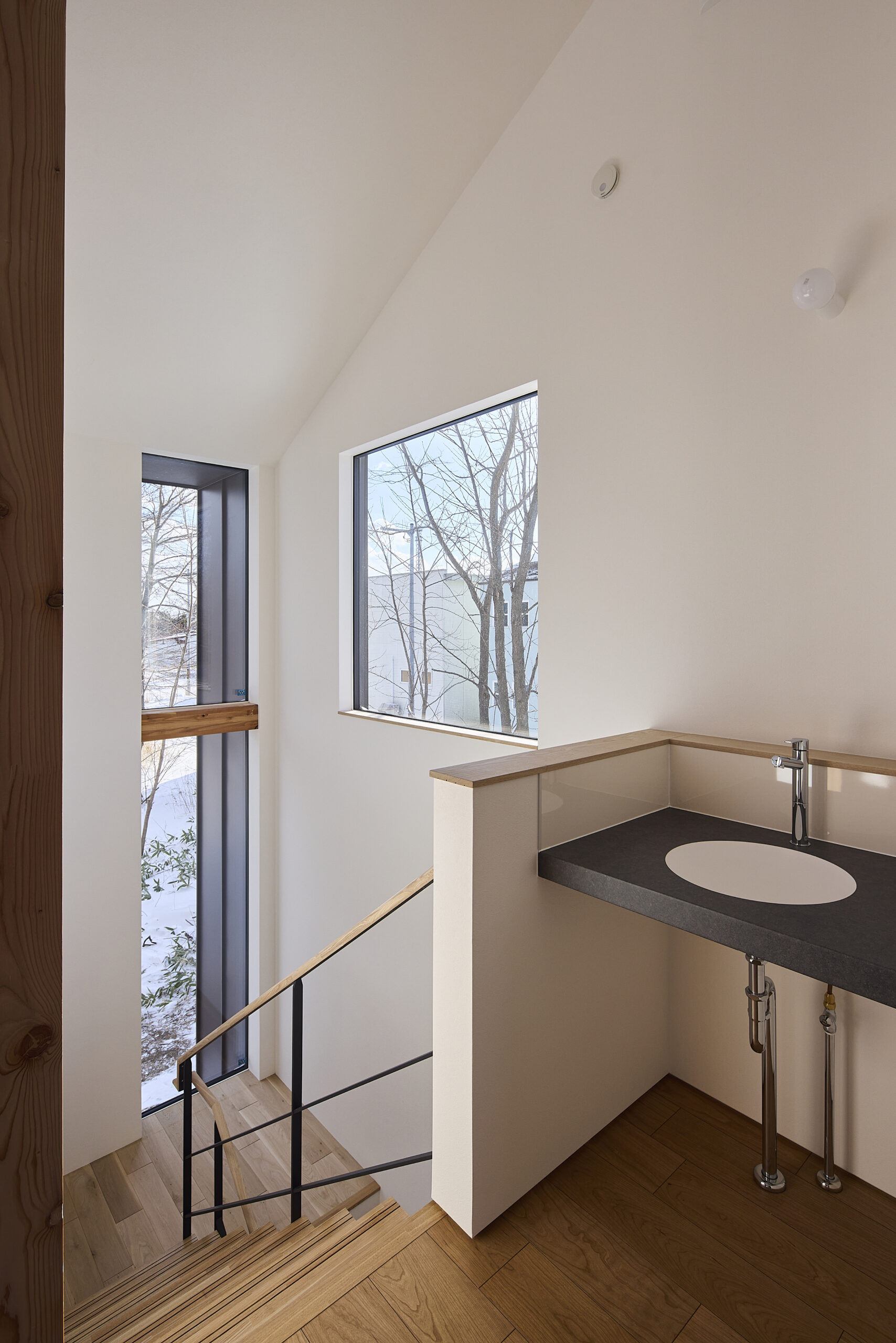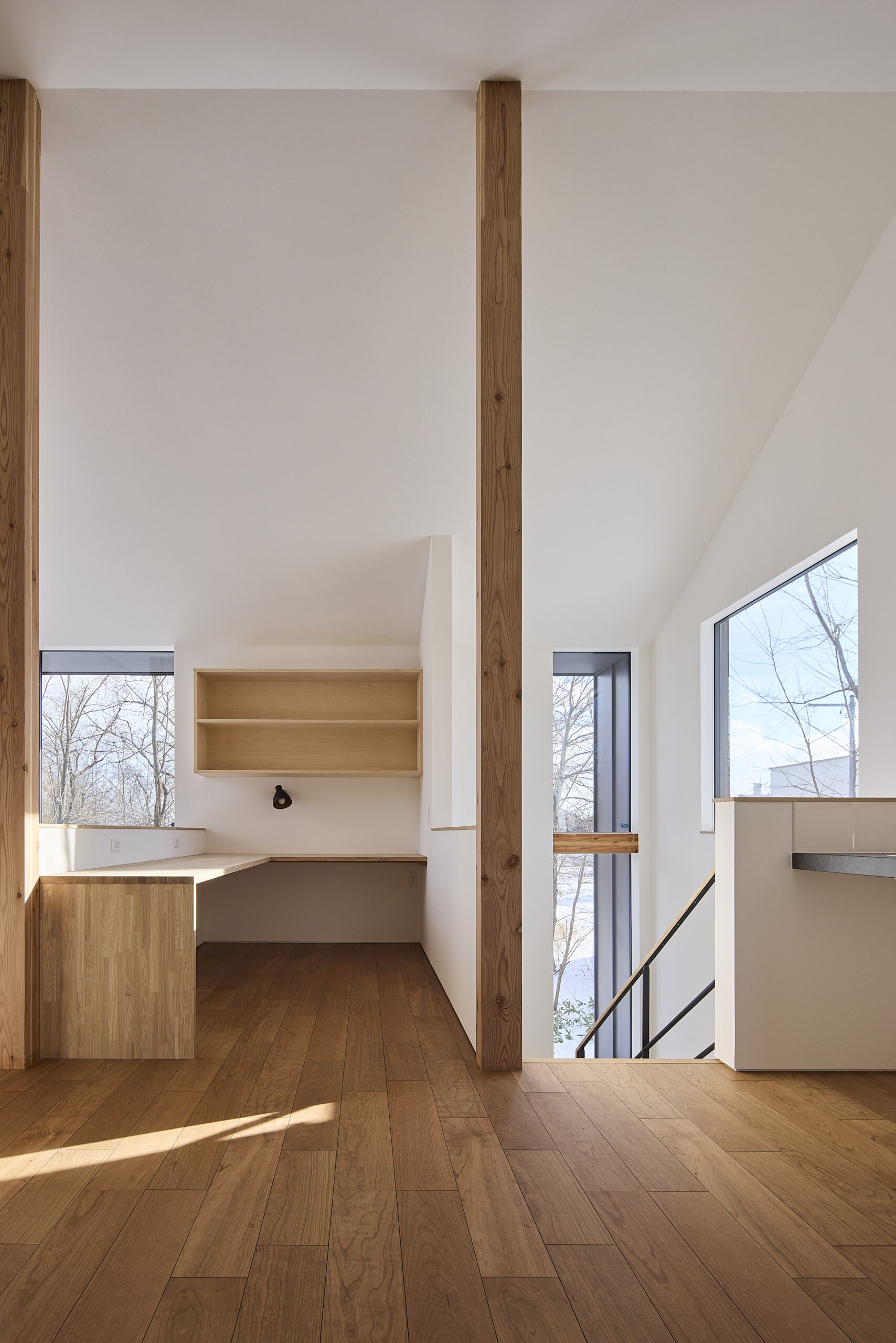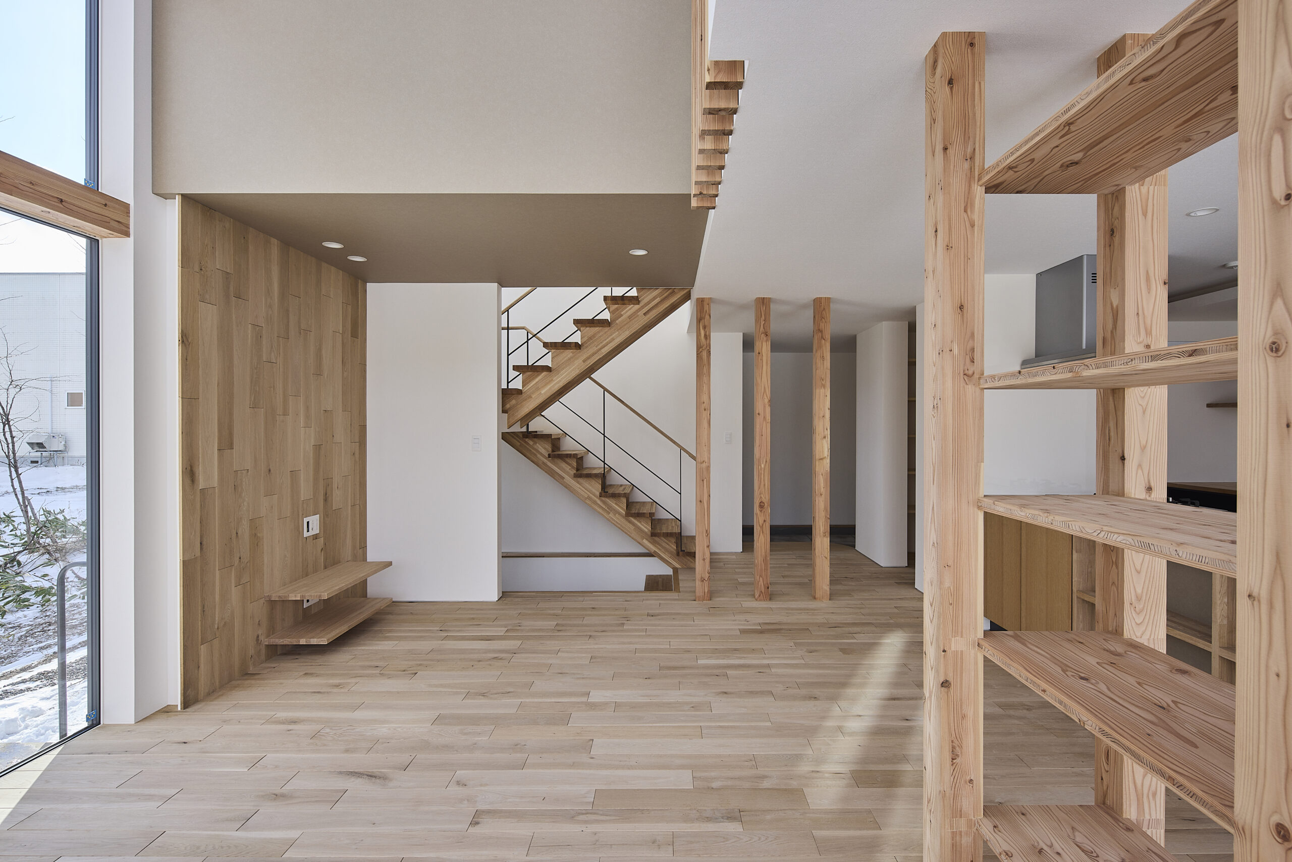 吹き抜けも含めた大開口から天空光を採り込むことで、南側を閉じていても主室(LDK)はこの明るさ。東向き・北向きの窓を設けても寒くならないよう、断熱・気密もしっかり計画されている