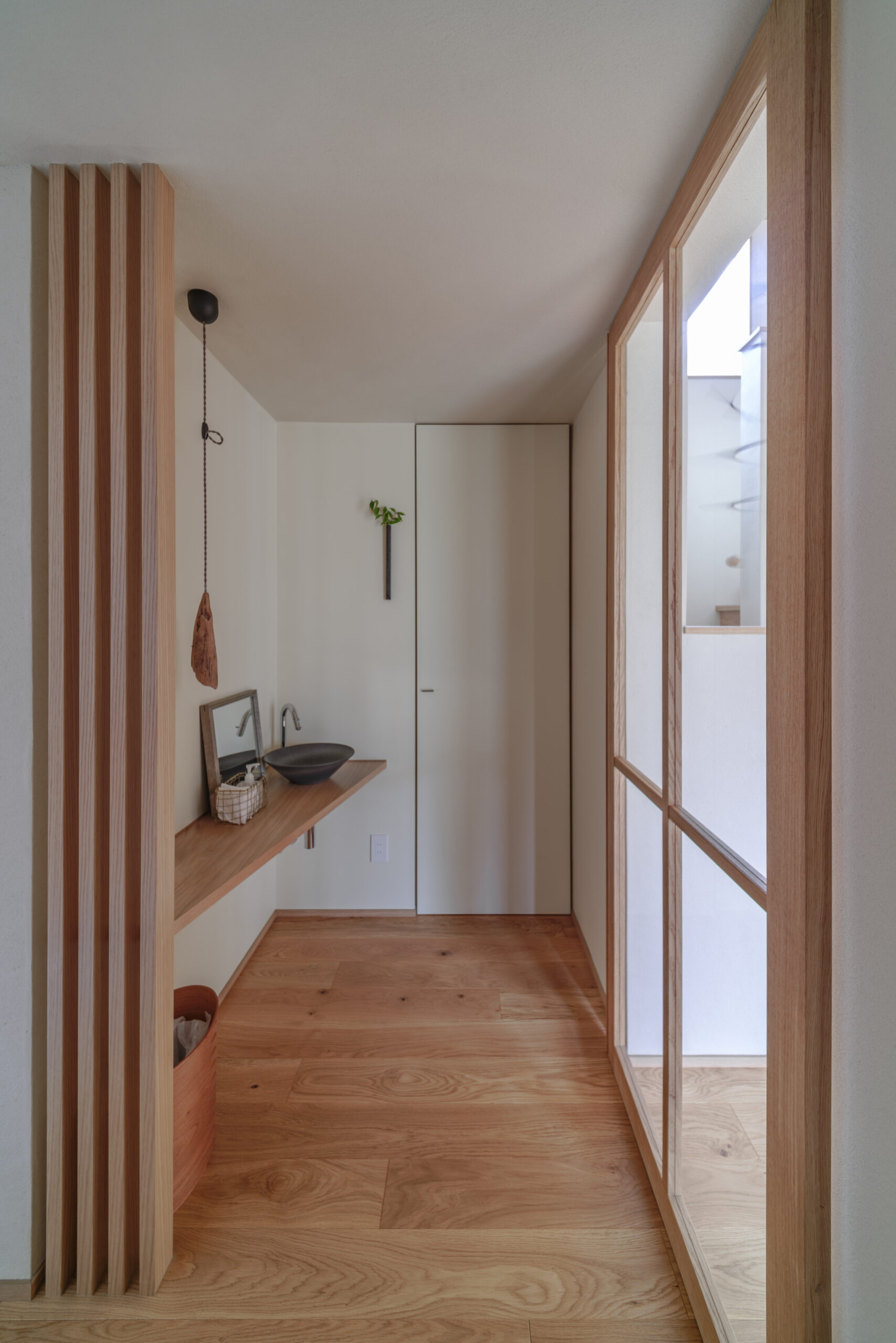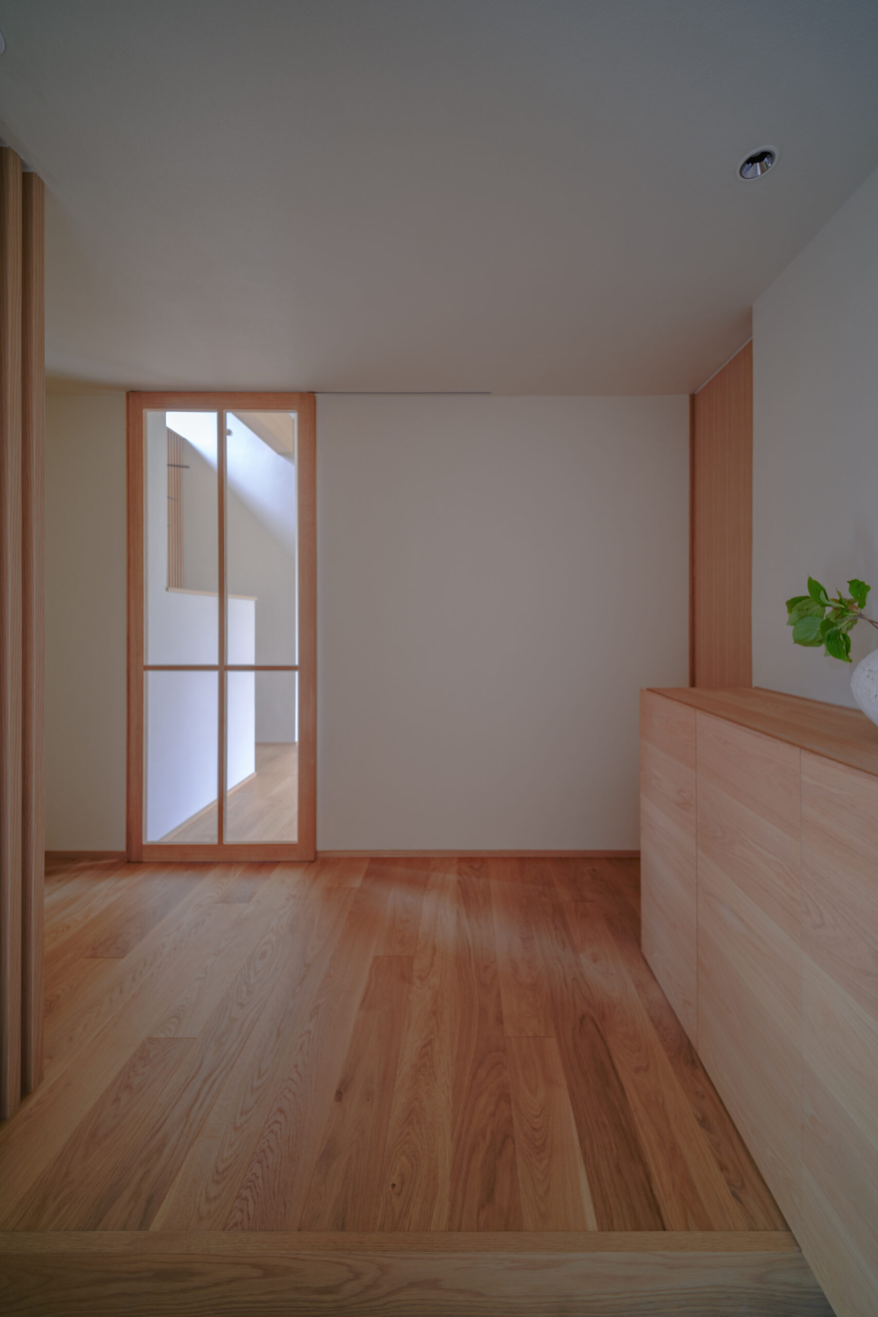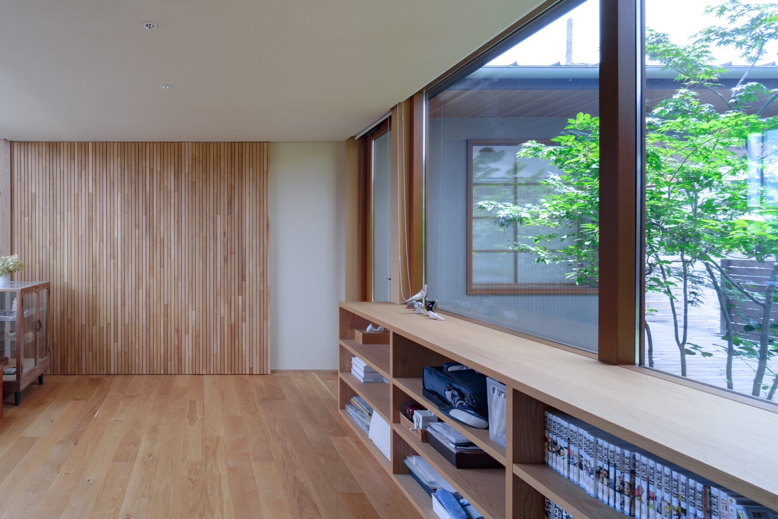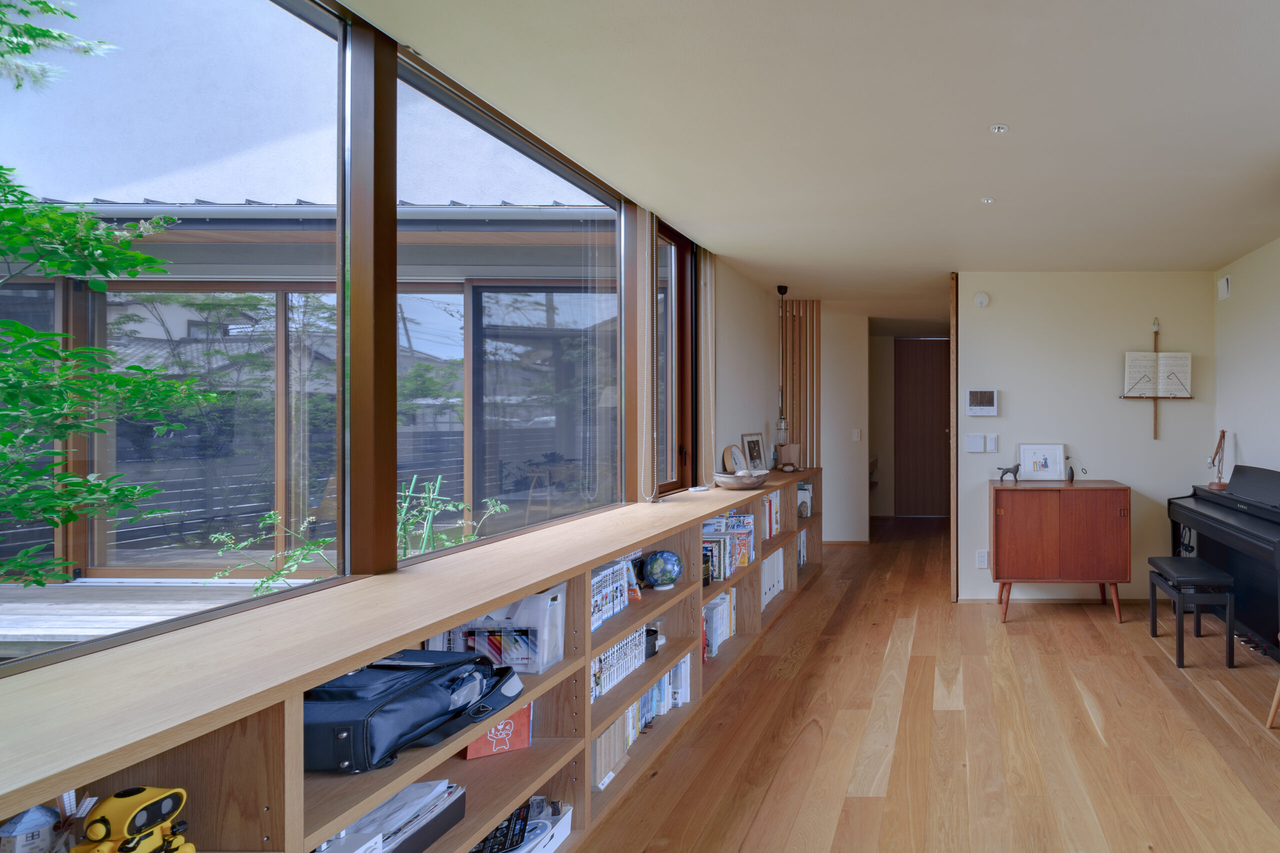 中庭を囲む空間の1つであるフリースペースは、お子さんのピアノやHさん所蔵のコミック本を置く場所が欲しいとの要望に応えてつくった。2階に子ども部屋はあるものの、お子さんたちはここで過ごすことが多いそう。中庭を挟んだはす向かいはLDKで、家族の距離感もほどよい