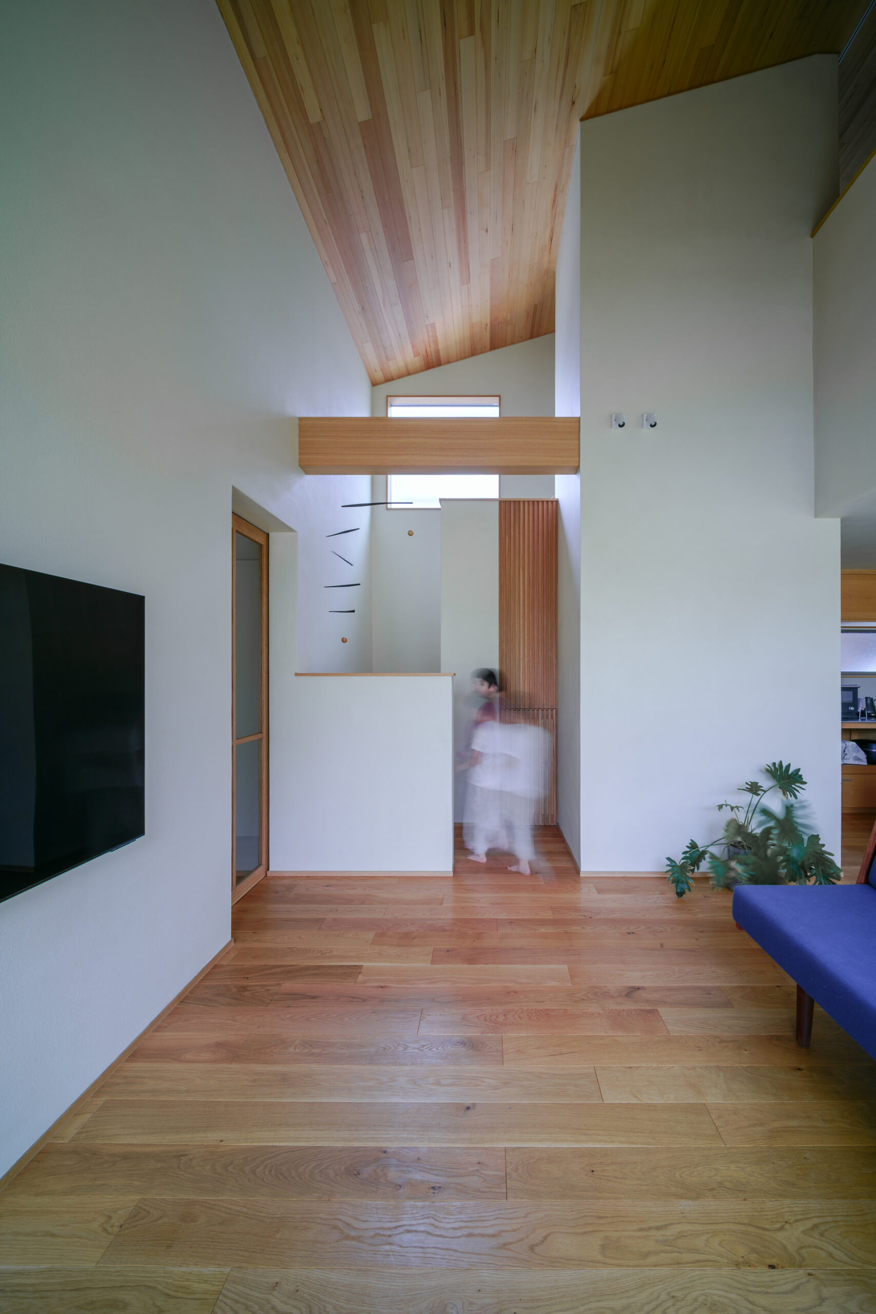 写真奥はリビング内階段。その脇にある縦格子の一部は奥村さんデザインの隠し扉で、中にはAV機器を格納