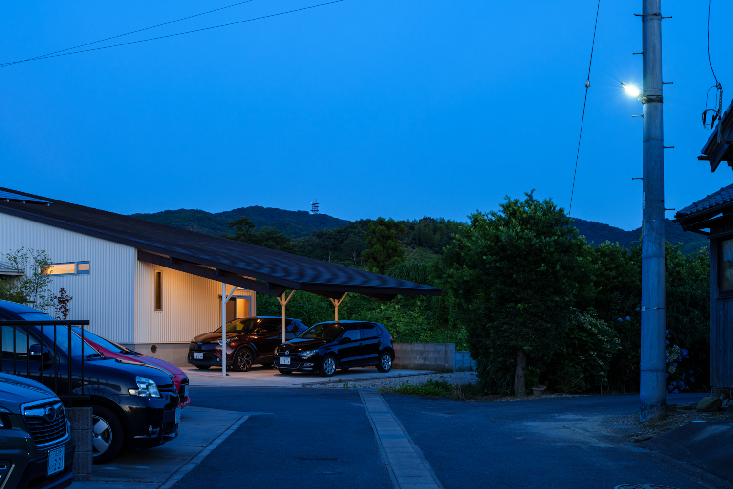 今回の作品は、片流れ屋根の先に山が自然と見えるよう、視線の動きを考えた屋根の傾斜角度をとっている。また、1番手前の道路側には、その山に生えているものと同じ樹木を植えた。道路から見えるこの樹木の先にこの作品があり、さらにその先に山がある。道路から山へのつながりを考えているのだ。駐車場の後ろの壁は取り払い、そこからも景色が見えるという徹底ぶりだ。そのおかげで、近隣住民はこれまで通り、山や自然を眺めながら帰宅することができる。