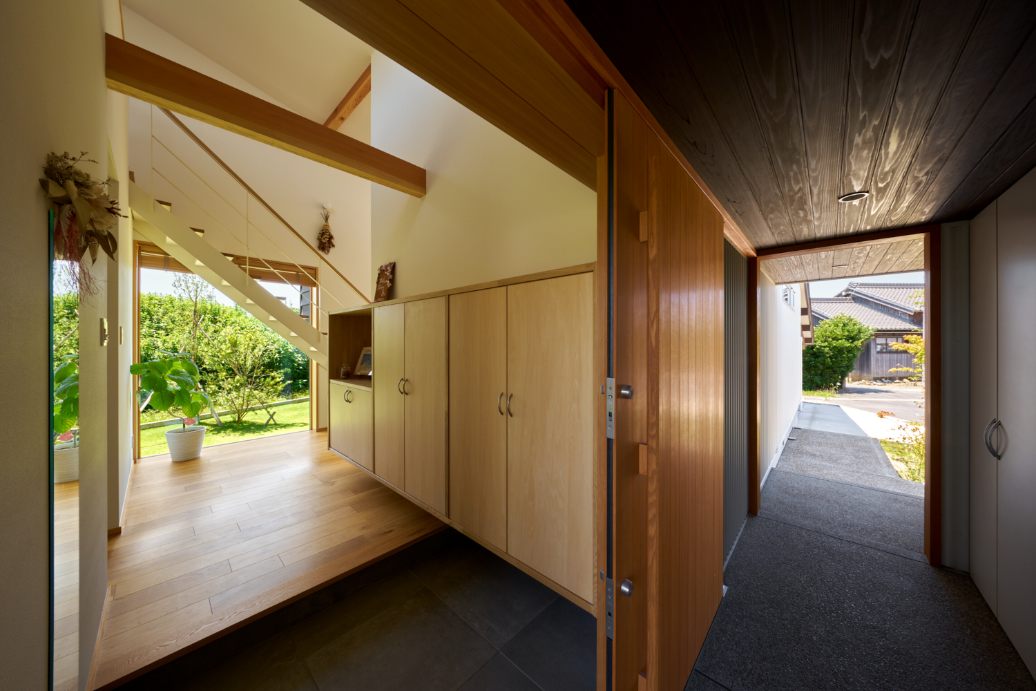 • 玄関から駐車場へ続く通路。右は収納スペース、左に玄関扉。近隣の風景を切り取るフレーミングを意図した