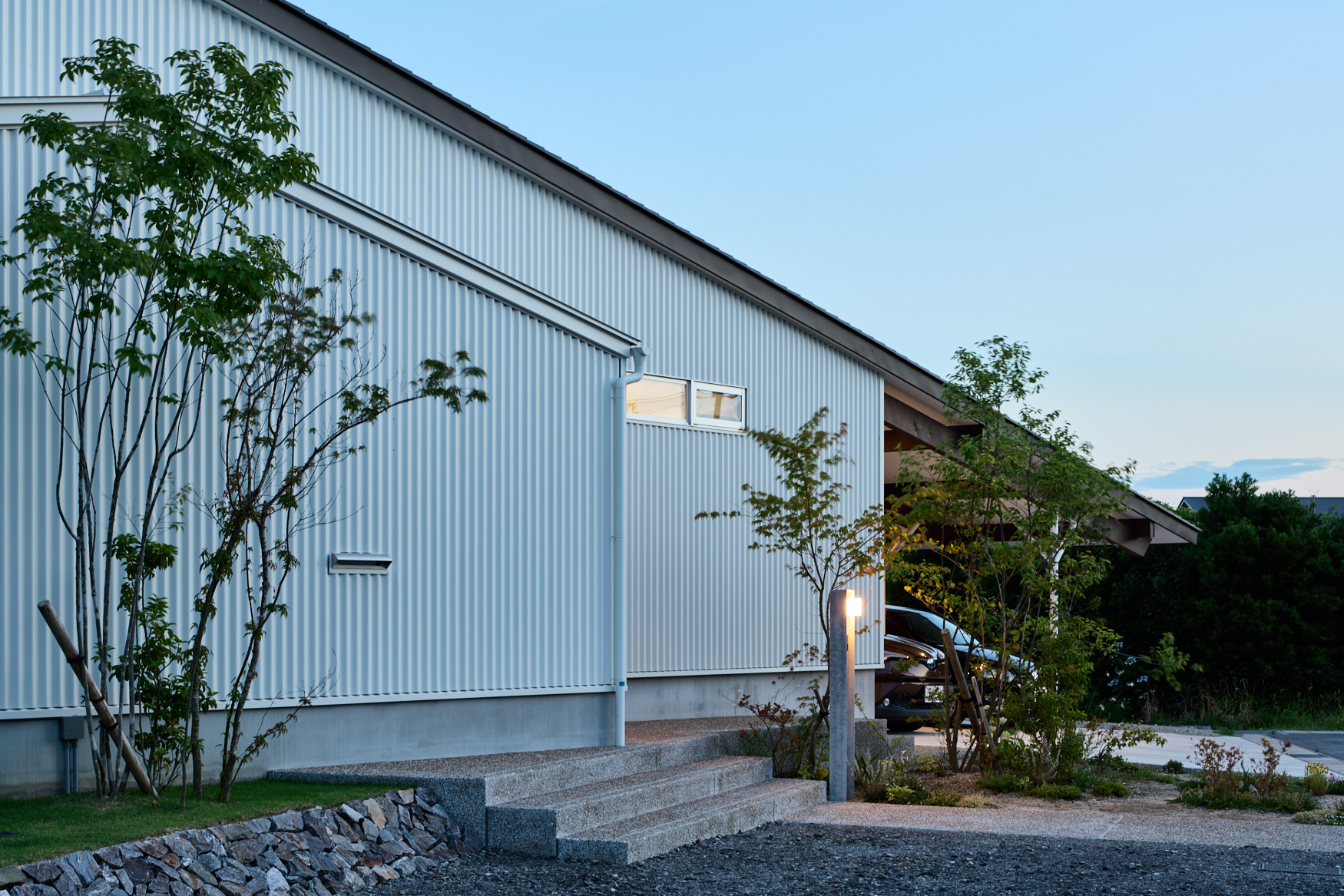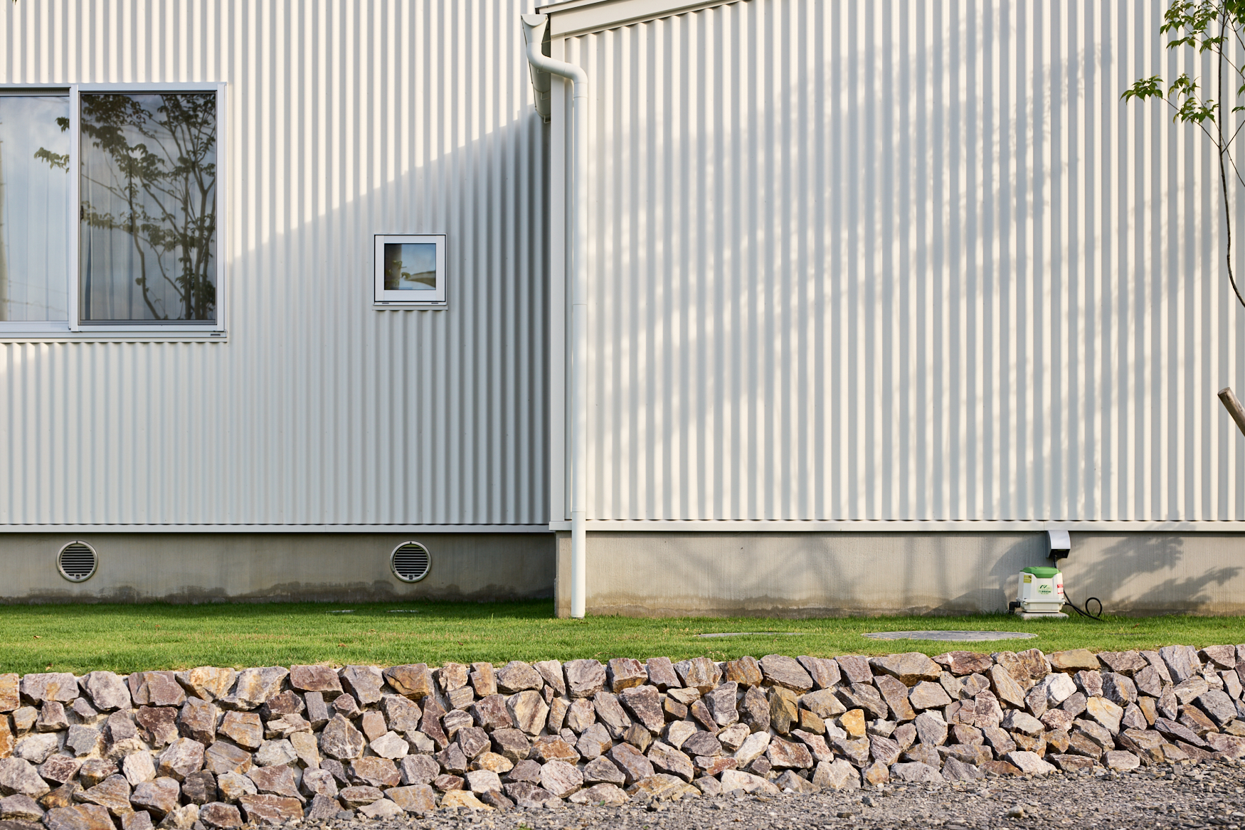 • 集落側から見た外壁。基礎の丸い穴が、エアサイクルの通気口だ。庭の木の影がガルバリウムの外壁に柔らかに映る