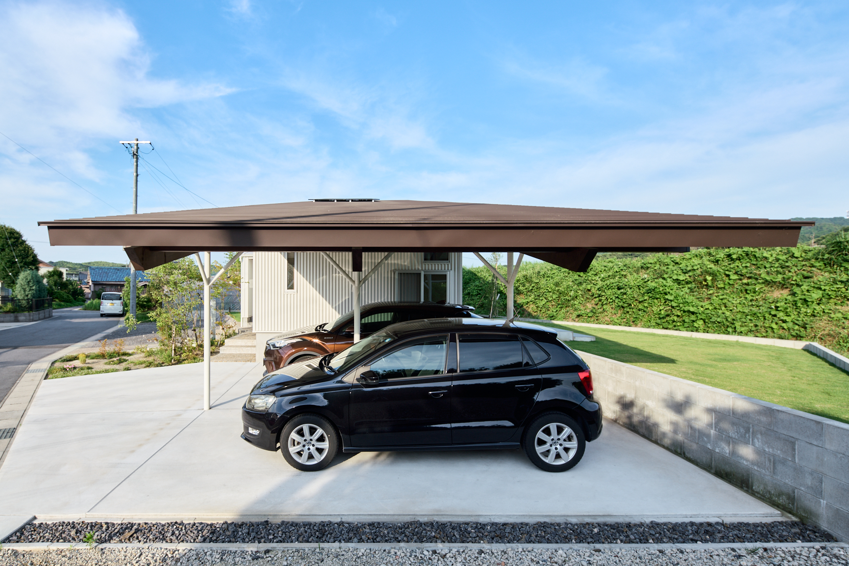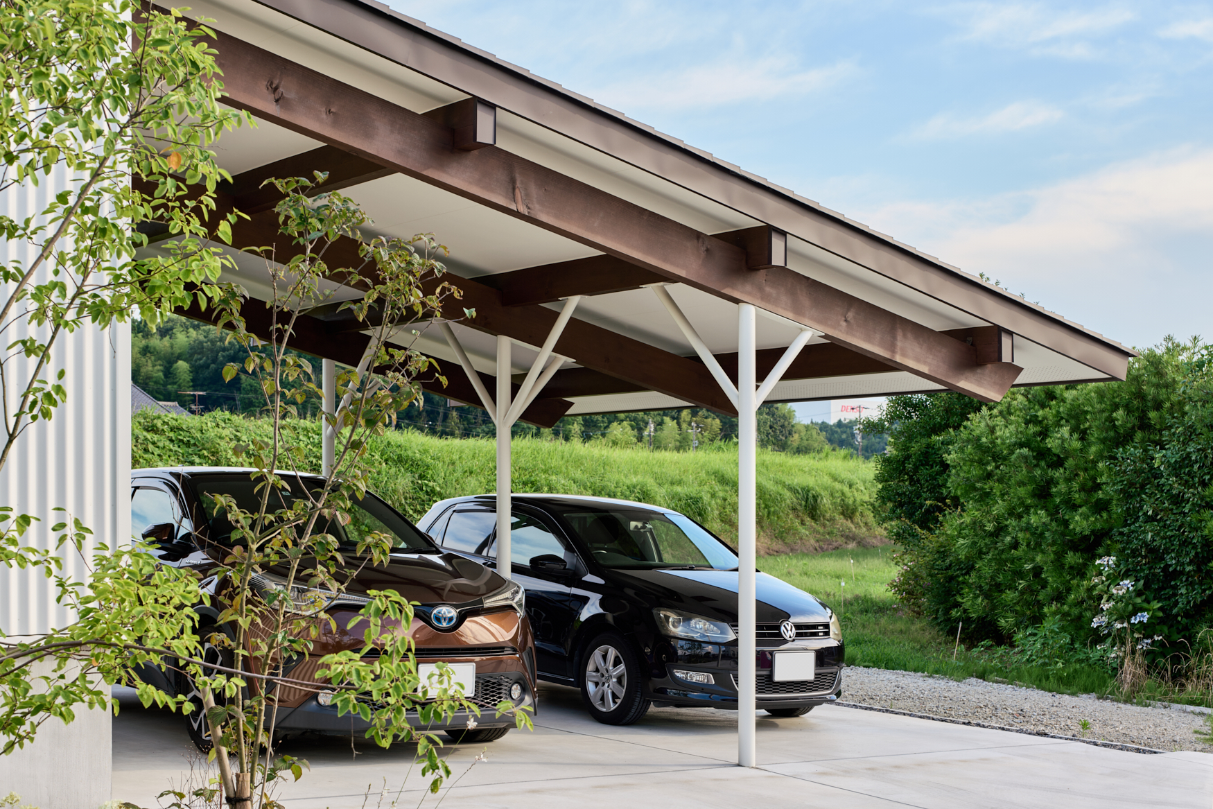 片流れ屋根のもっとも低い部分。屋根付き駐車場や作業などのフリースペースとして使われている。車を2台停められる、広大なエリアだ。長い張り出しなので、鉄製の支柱で強度を確保した