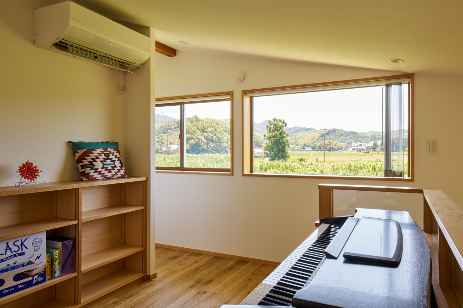 2階に配されたフリールーム。この窓から見える山々が、お施主様の奥様が幼い頃に見ていた景色だ。大のお気に入りで、趣味のピアノを弾いたり、窓からの景色を楽しんでいるという。この家唯一のエアコン(左上)で、家全体の空調が可能だ