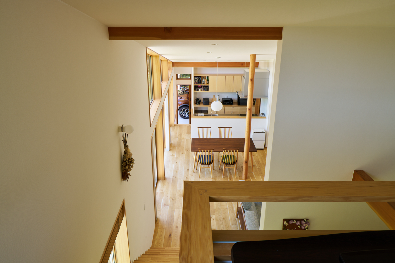 ダイニングから見たリビング方向。正面奥は一部2階となっており、フリースペースと個室が配置されている。大きな窓とハイサイドライトの効果で、室内はとても明るい