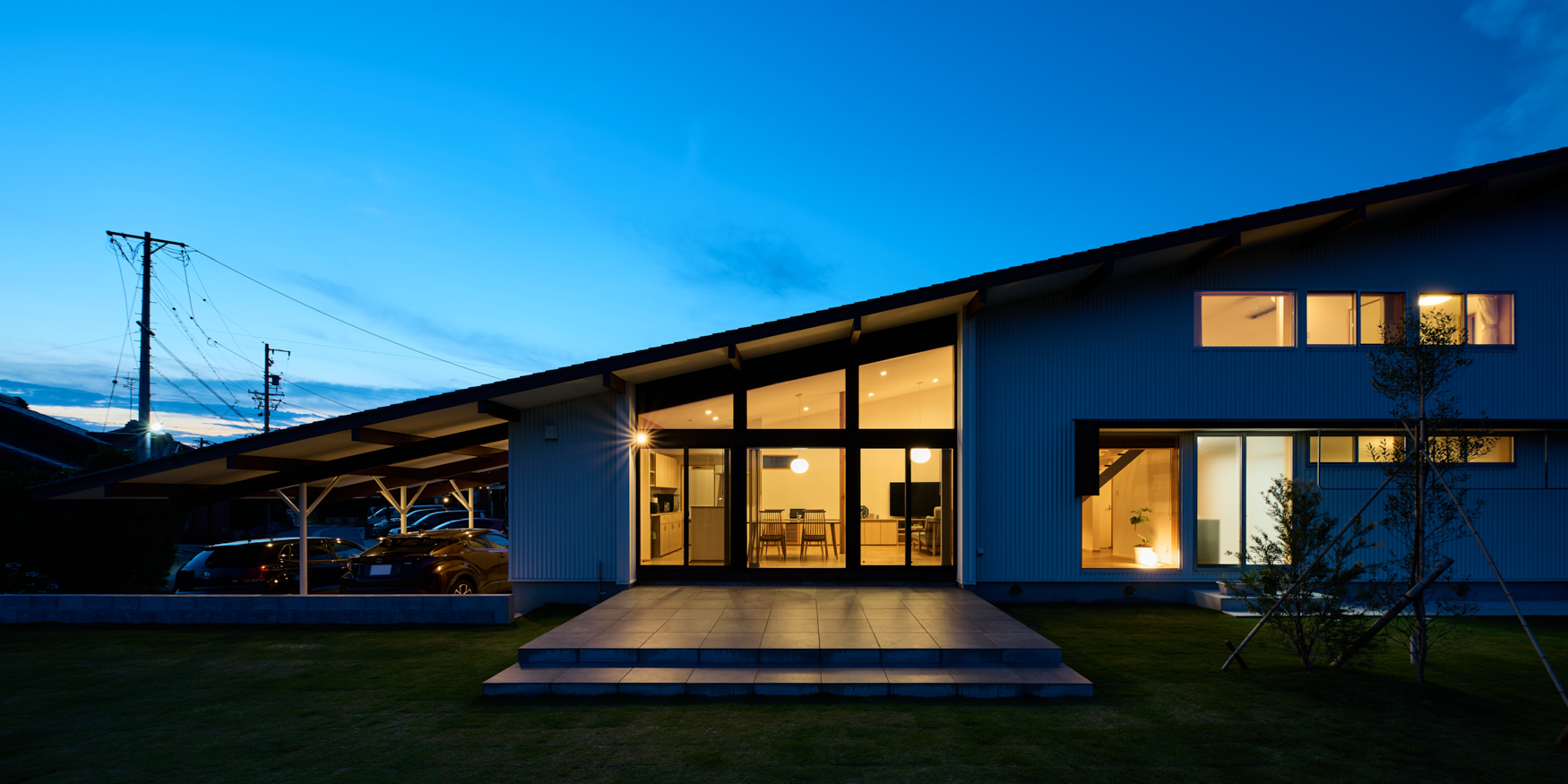 • 夕景外観。26mの長さを持つ片流れの屋根形状がよくわかる。屋根が高い部分のみ、一部2階建て。手前の広い庭には広大なテラスで、仲間と集まりBBQなどを楽しむための場所だ。手前が川で人通りもないため、カーテンなどを閉めずに、常にこの状態で景色を楽しんでいるそうだ