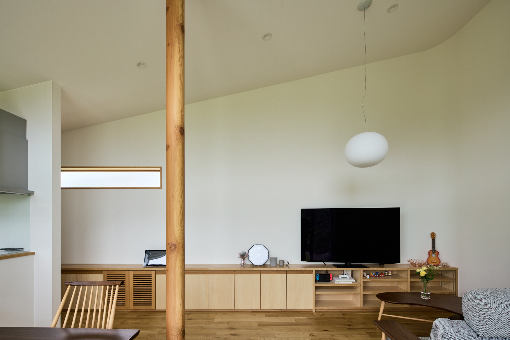 • リビング。LDKは吹き抜けのため、屋根が高い側には巨大な壁が出現することとなる。その圧迫感を減らすために、壁の角(写真右)を曲線とすることで柔らかな印象を与える工夫がなされている。正面の壁は季節や時刻によって色が変わる。外の緑や太陽光の反射が美しい