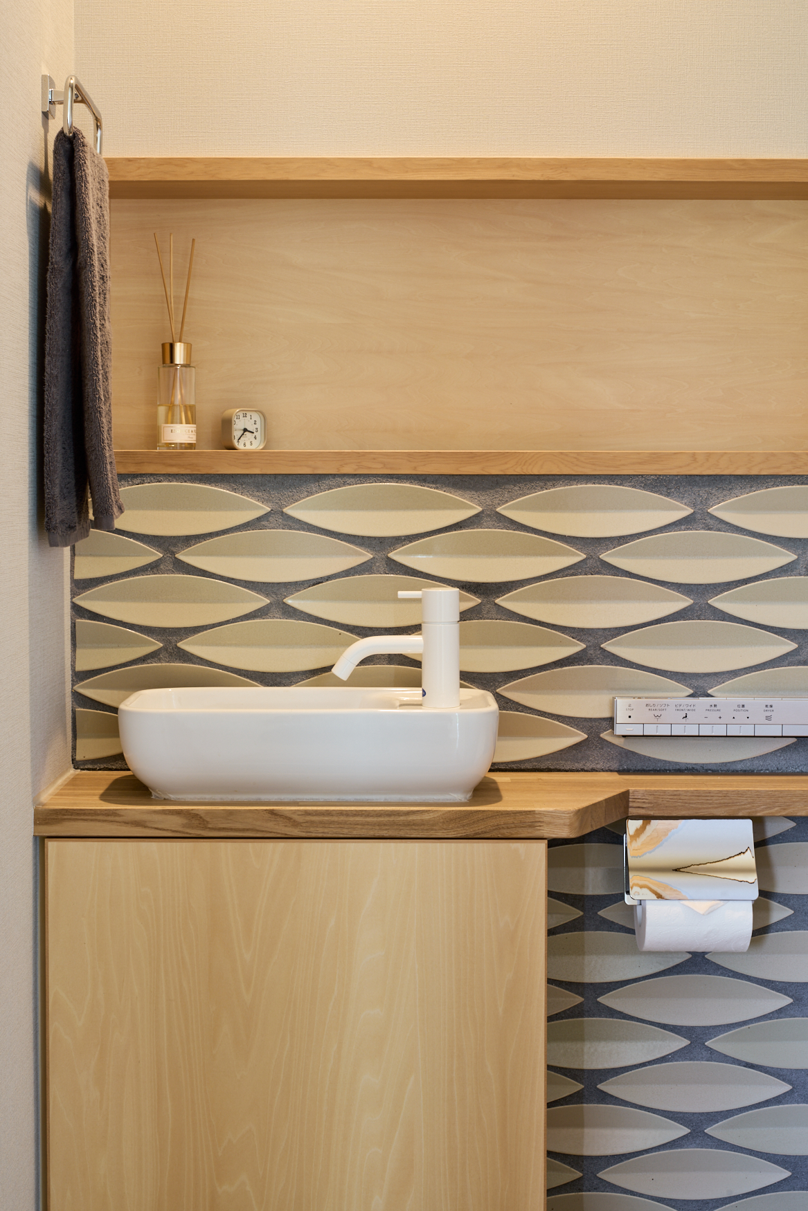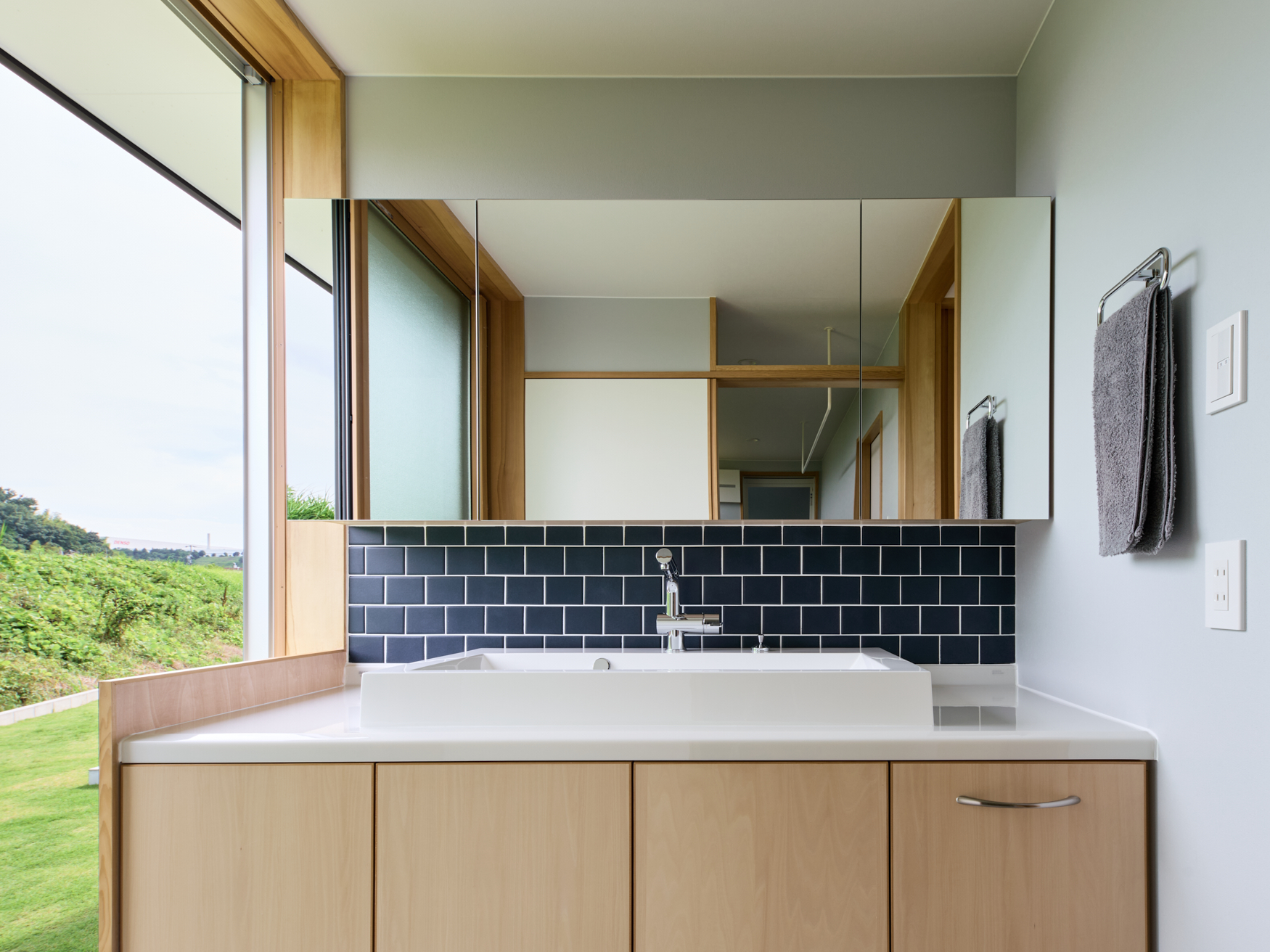 • 洗面。お客様も使うため、リゾート感あふれる、開放的な空間とした。脱衣スペースと洗面をゾーニングで分けることで、大きな窓を使用することが可能となった