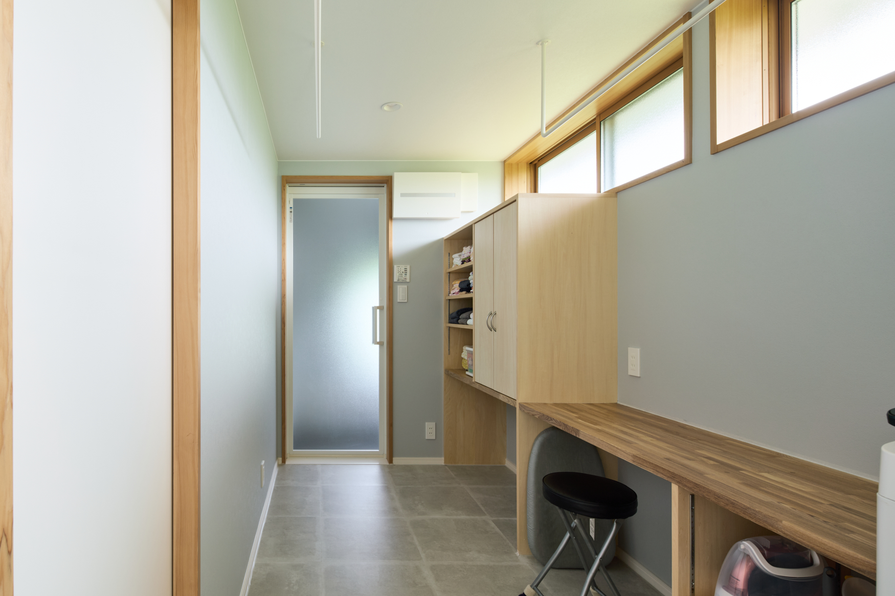 • 浴室(正面奥)へつながる脱衣所は、ランドリースペースと家事コーナー、衣類の収納スペースを兼ねている。ハイサイドライトの効果で明るい空間だ。左手前のドアは寝室につながっており、効率的な動線が考えられている