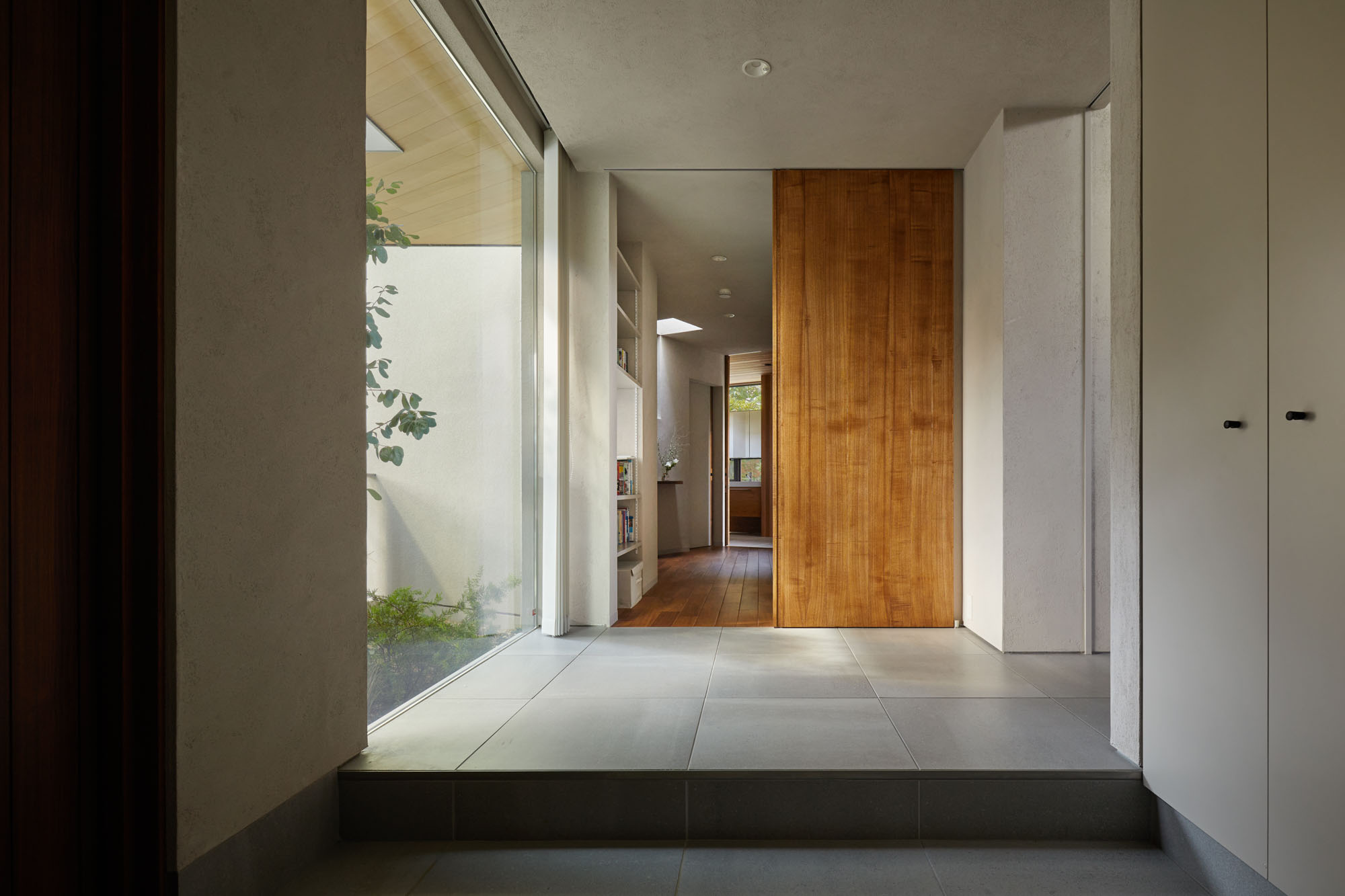 玄関。正面に進むと個室や水回り、右に入るとLDKがある。ところどころにハイサイドライトを設け、大きな家でも家中を明るくしている。画像奥に見えるハイサイドライトは、廊下だけでなくトイレに自然光を入れる役割も果たす
