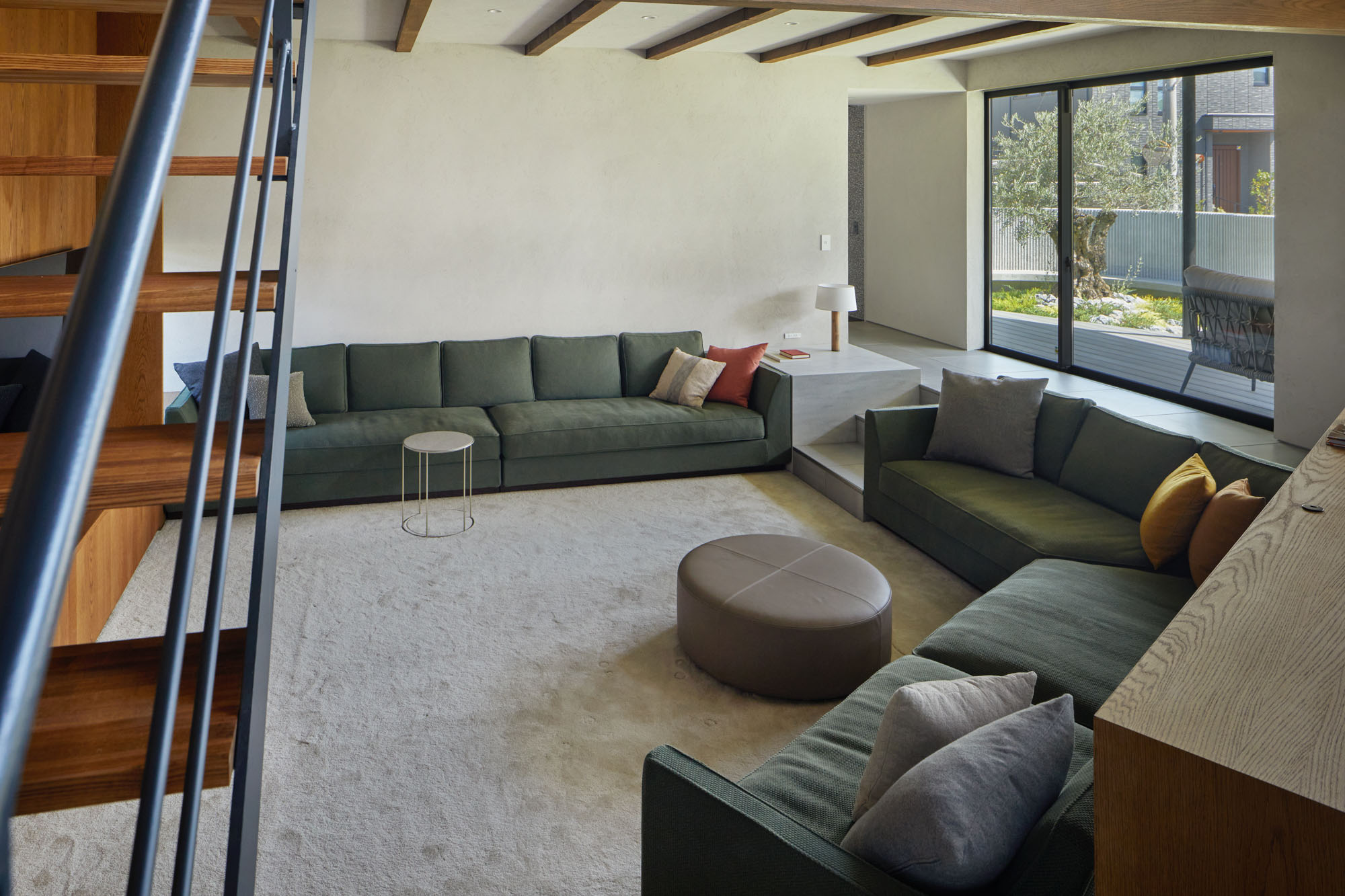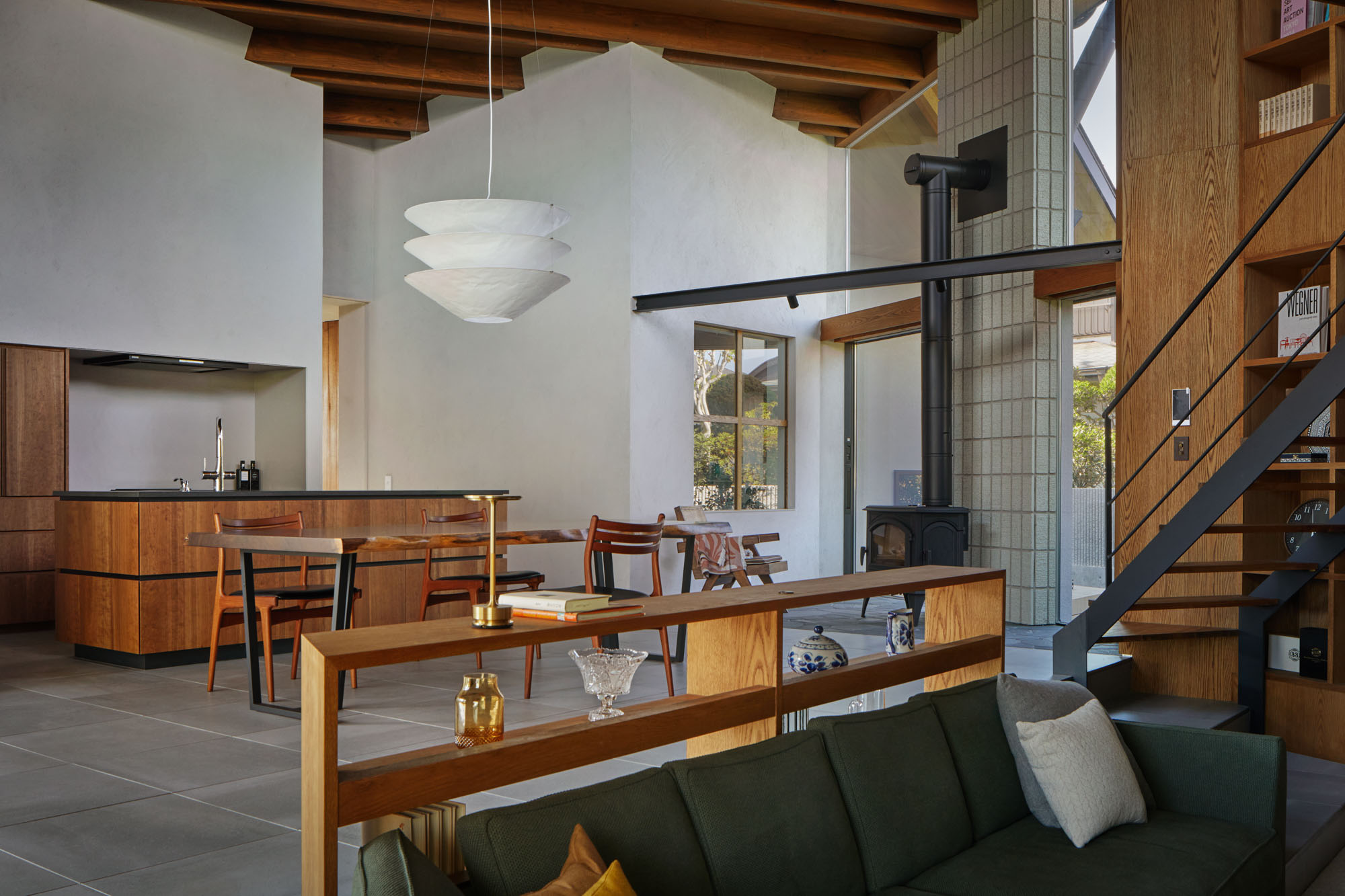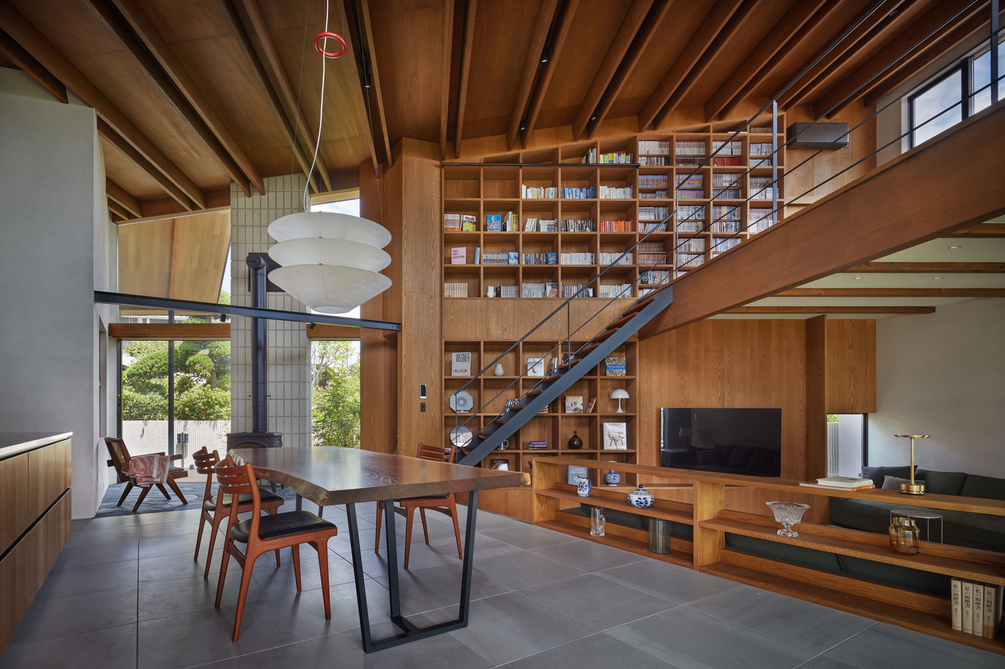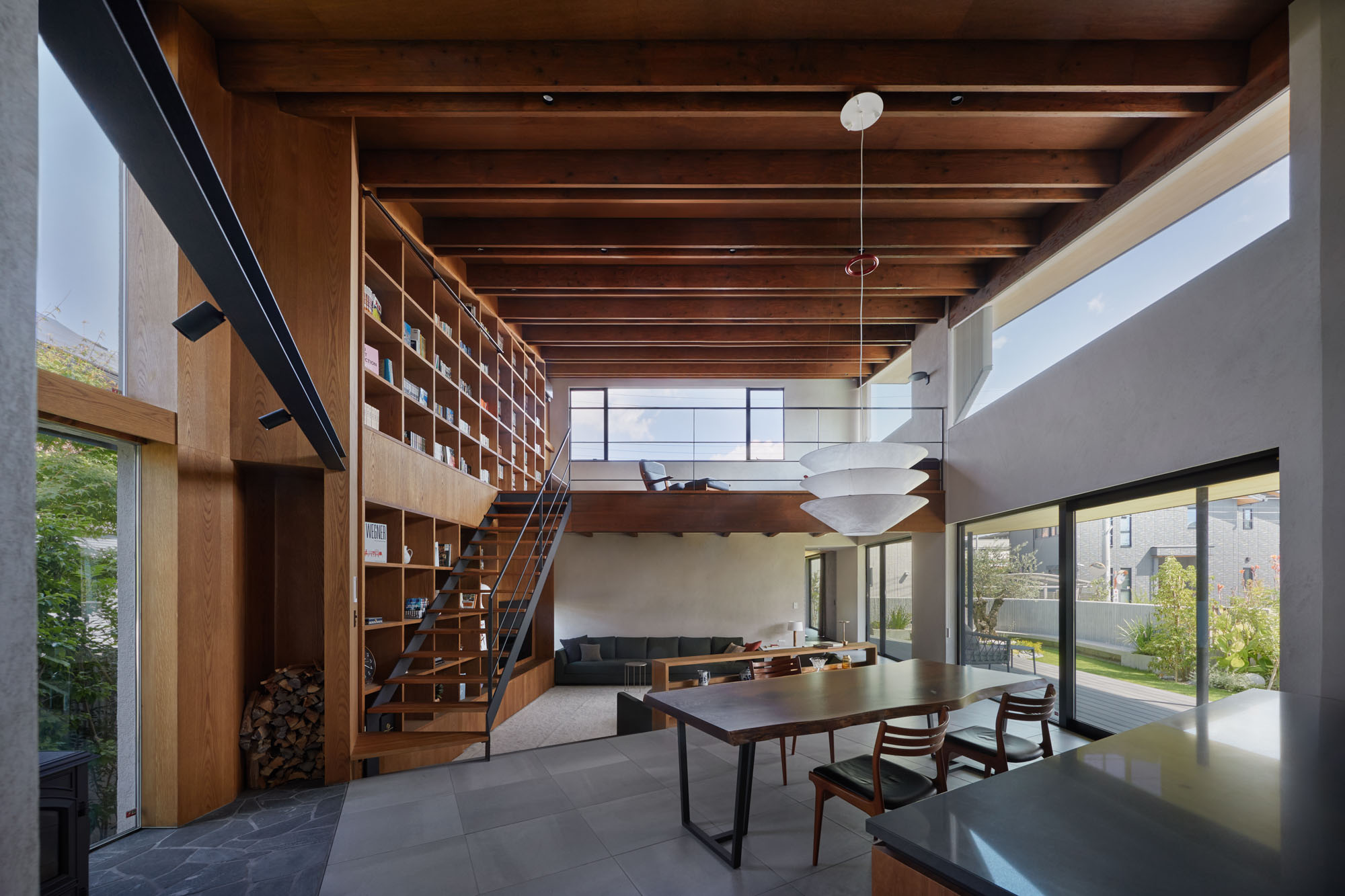 キッチンからダイニング、一段下がったリビング、2階のロフトを見渡す。画像右が南に続くデッキから庭と、画像左の暖炉テラスが建物のラインに対して斜めに交わるため、より強く空間の広がりを実感できる。画像右奥の通路の奥にラウンジとシアタールームを設けた