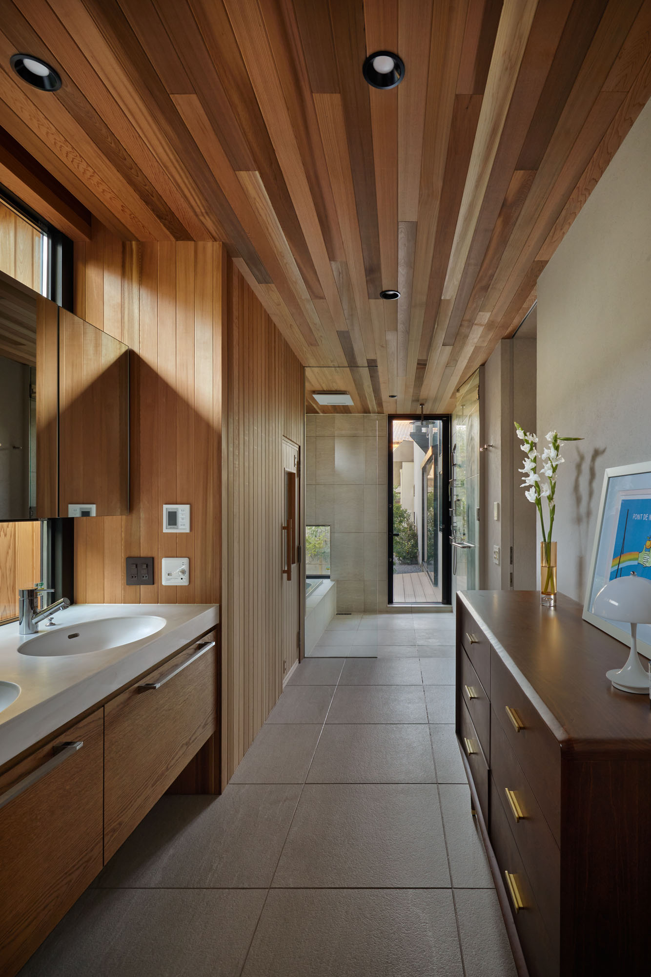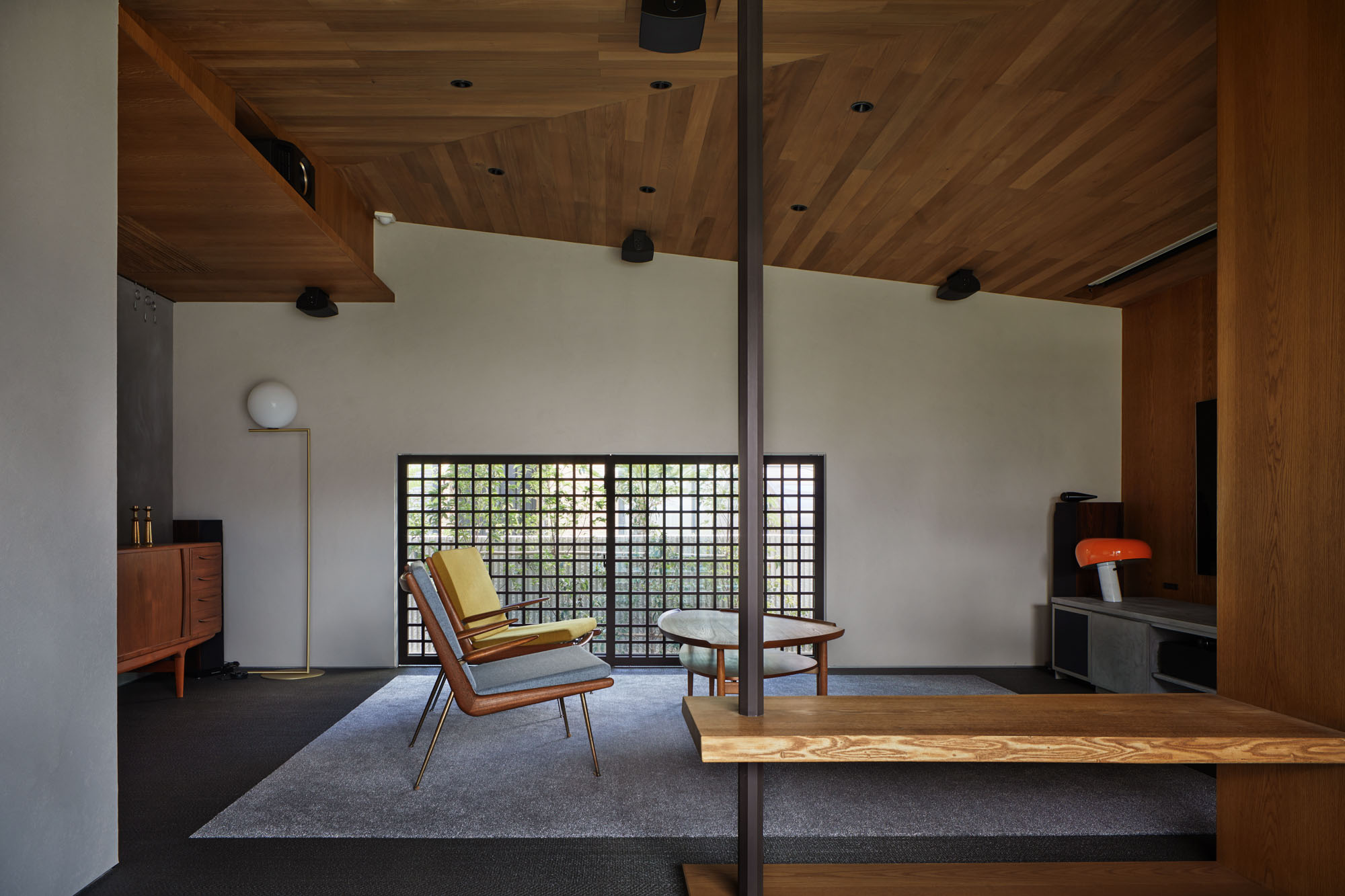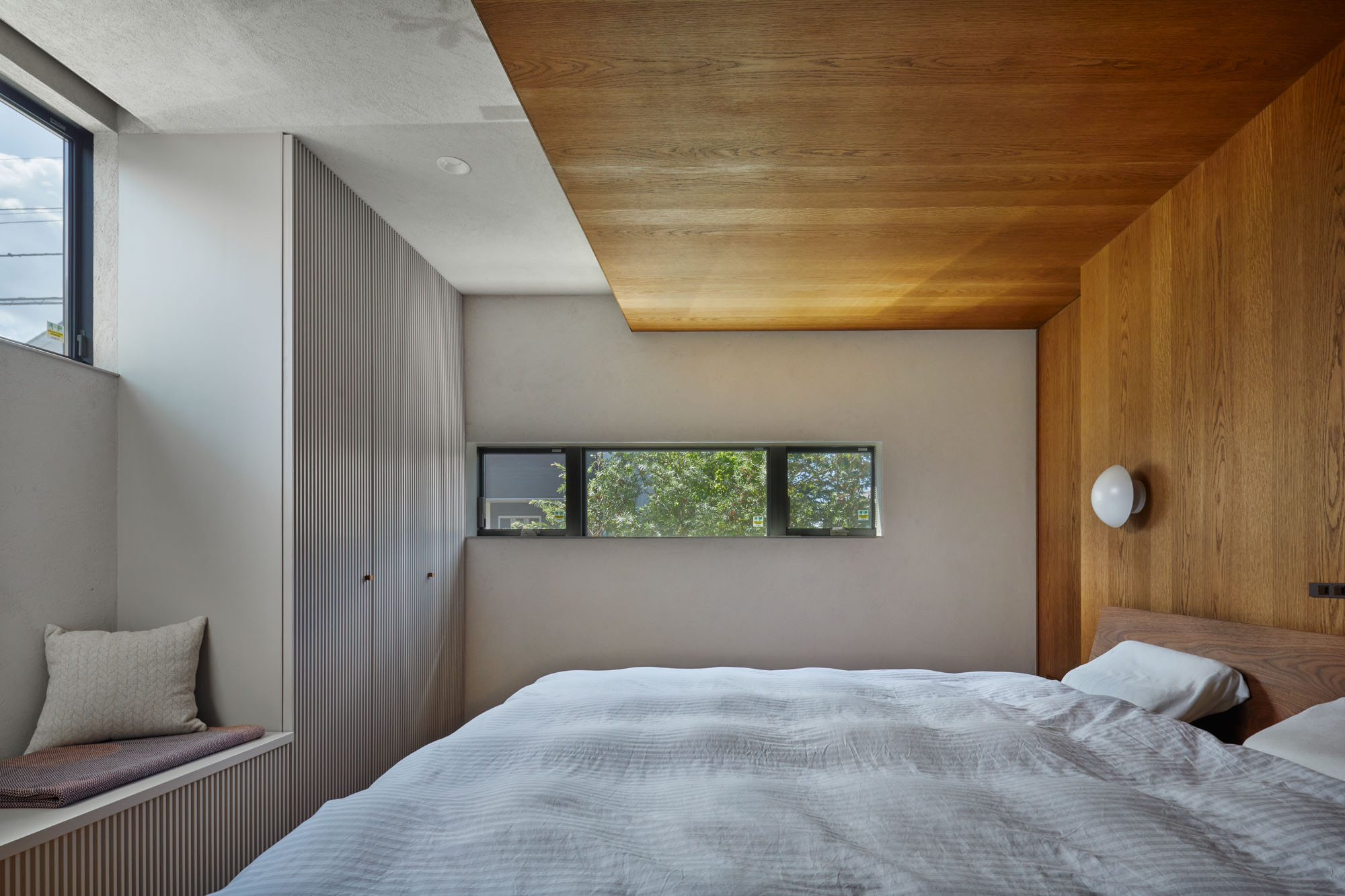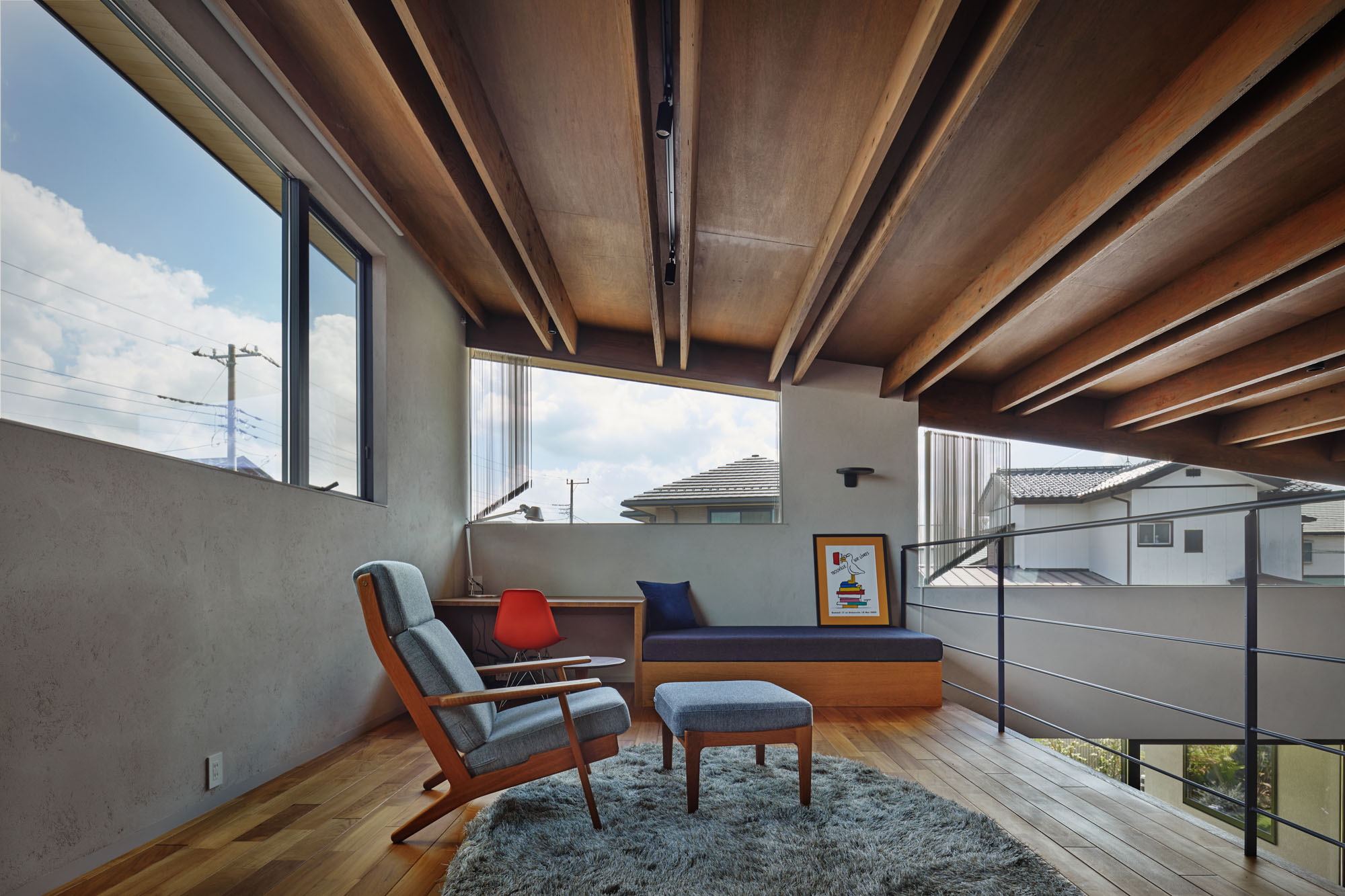 2階ロフト。木天井は強固に加工された建材を組み合わせ、梁成の細い、モダンな梁を実現した。2枚組み合わせた中にダクトレールを取り付け、天井の美しさは損なわずに明るさを確保。家の構成上斜めになった窓には縦型のブラインドを使い、日射や視線をコントロールする