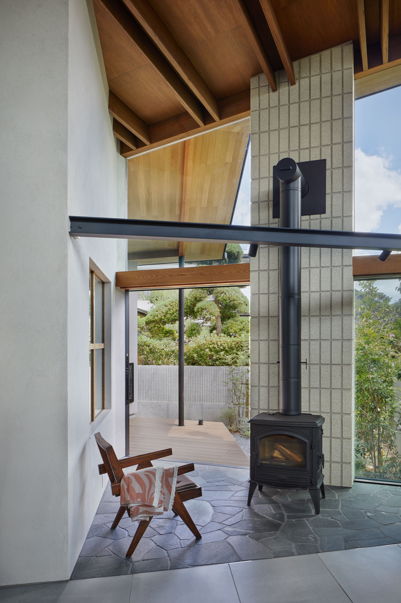 暖炉テラス。LDKと一続きながら、床に石を用いるなどして外部的な居心地も演出した