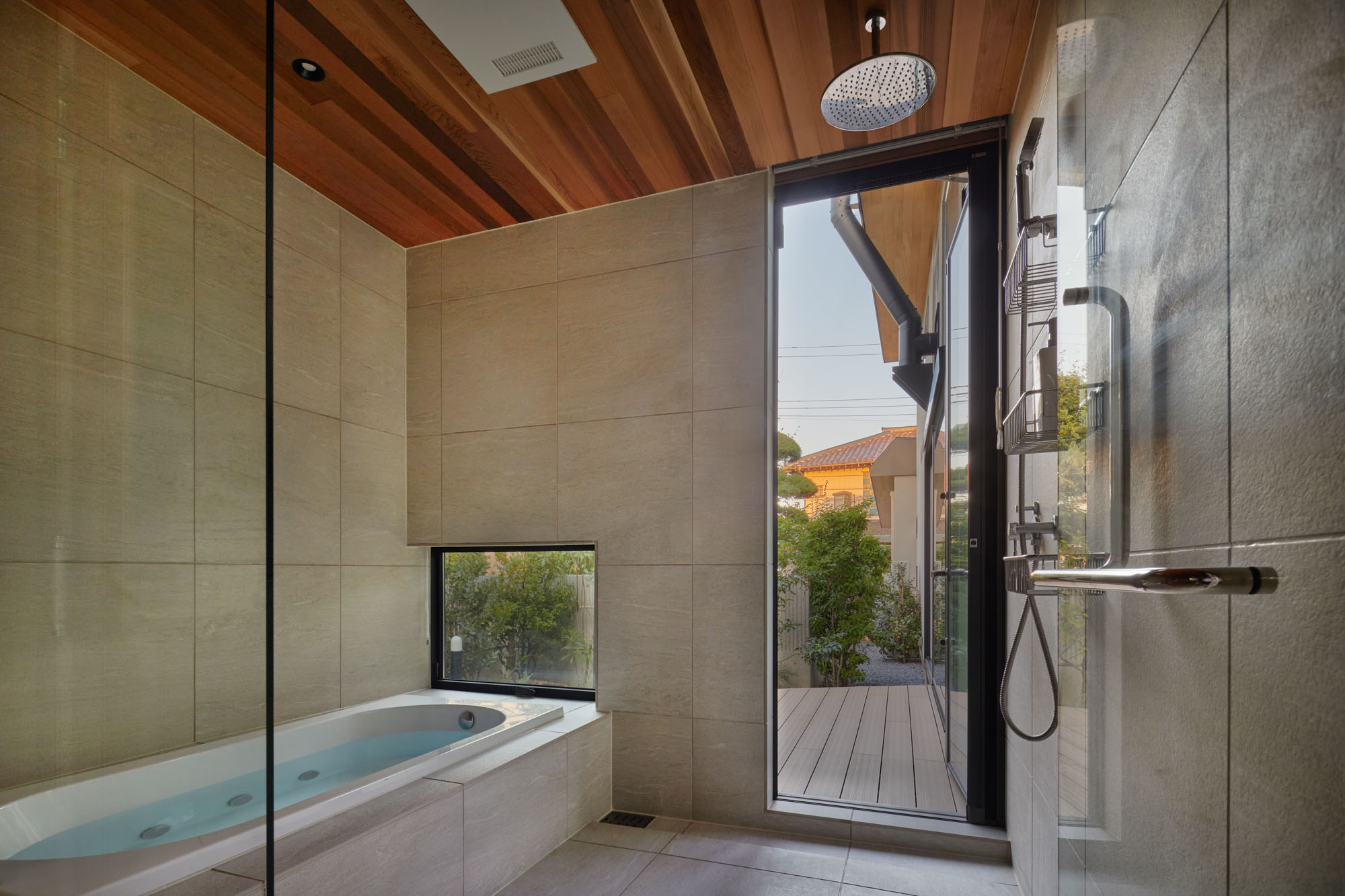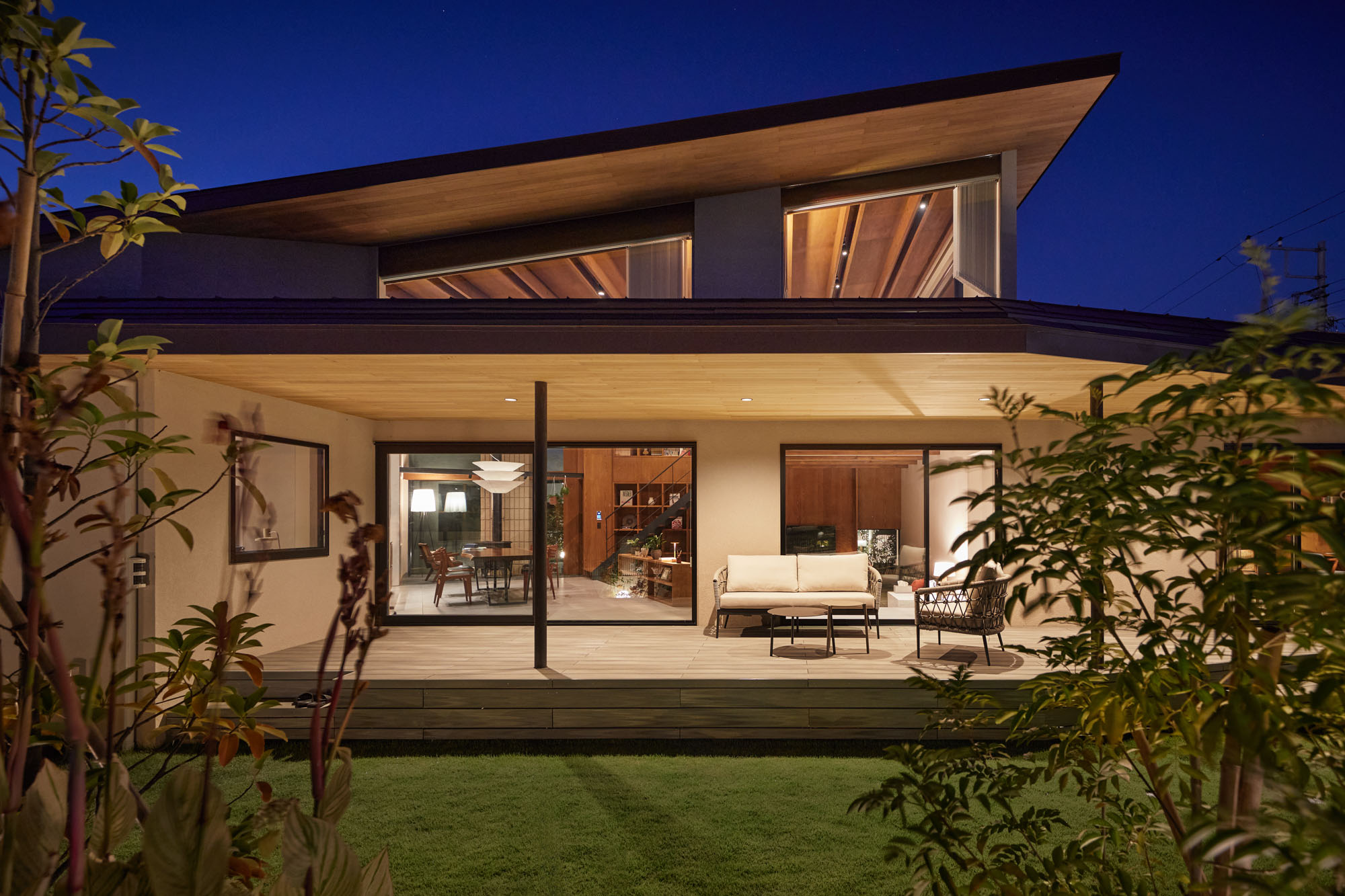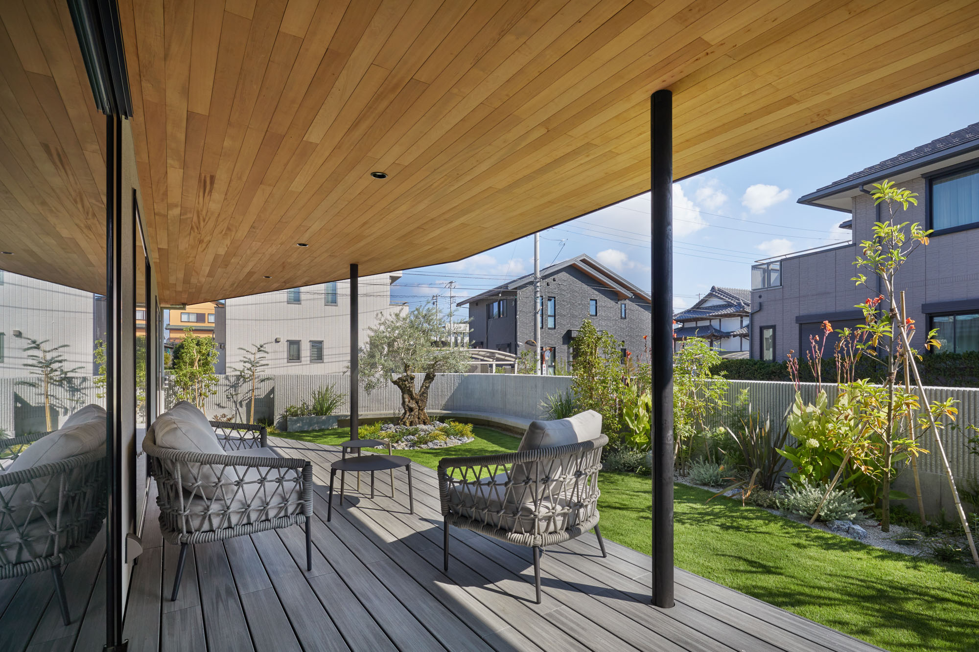 南側デッキと庭。要望からデッキは広めに計画、軒も深く出した。おかげで現在も存分に活用され、庭とを繋ぐ大事なバッファとなっている。要望から庭はお施主さまが旅行先のアメリカで見た庭を思い描き、さまざまな樹種を取り入れ野趣に富む雰囲気で計画した
