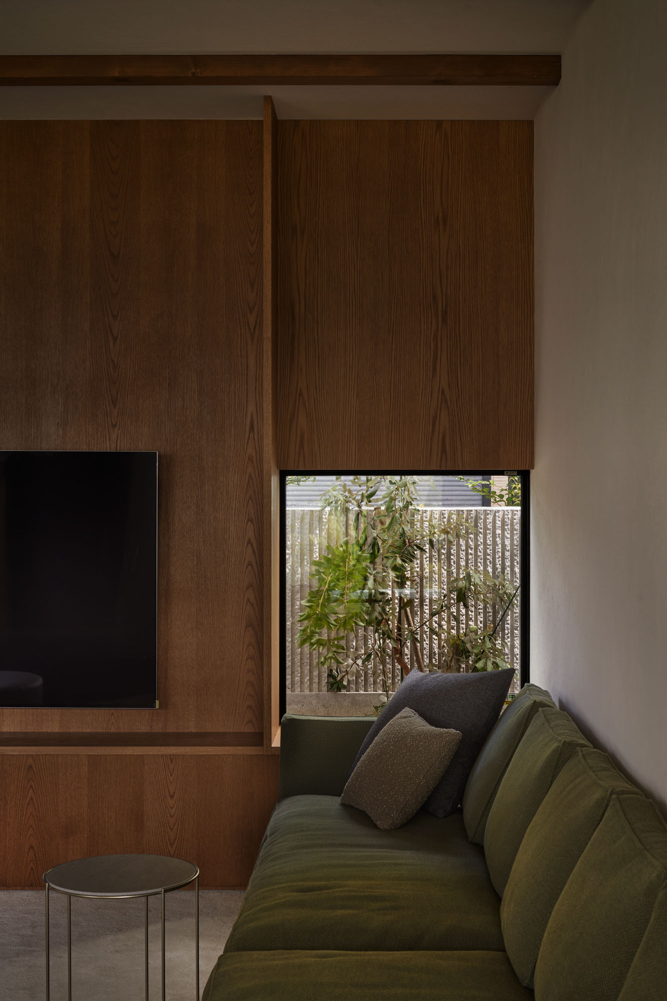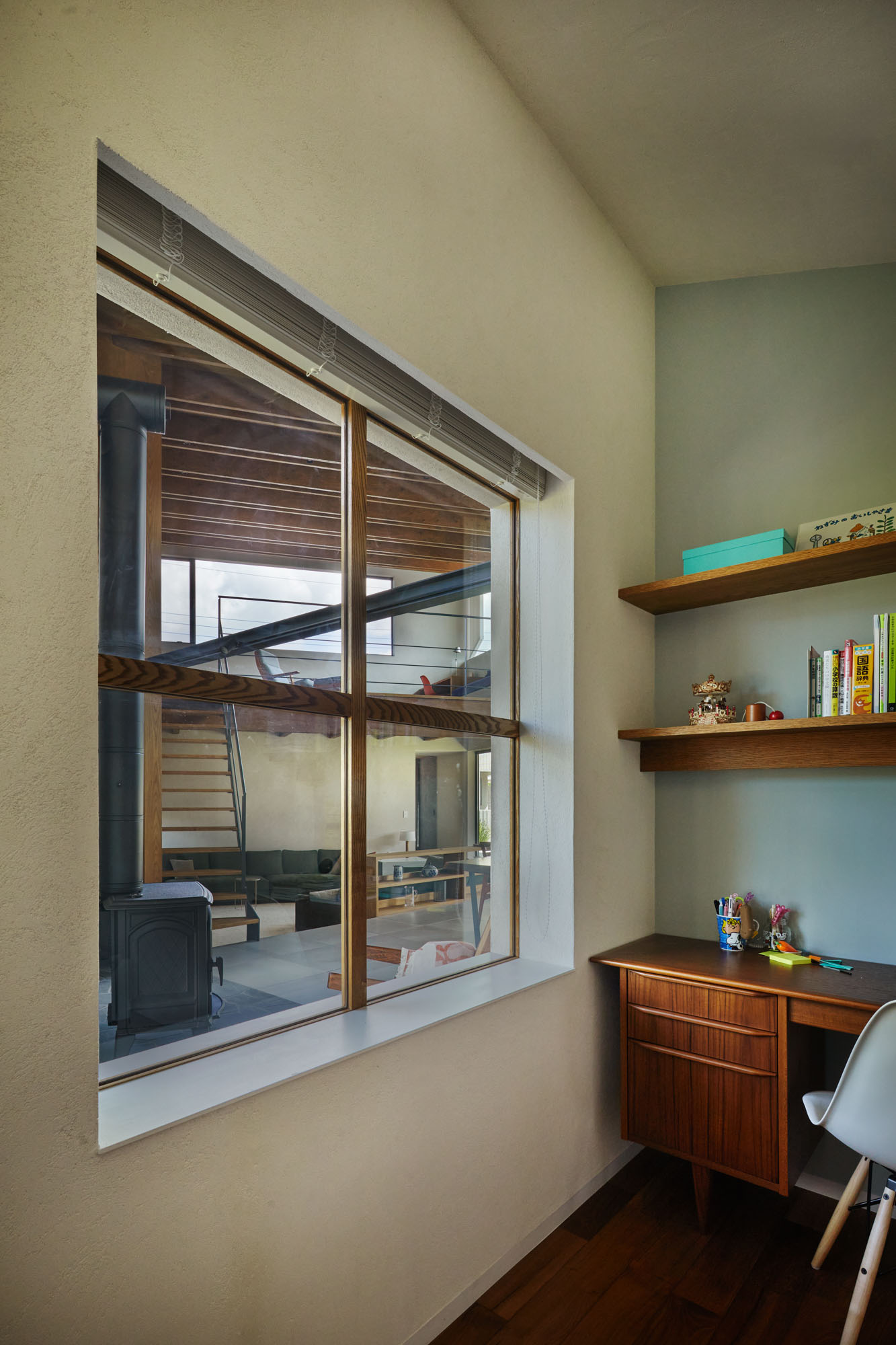 リビングからキッチン方向を見る。中央の窓の裏は子ども部屋。視線が交わることは少ないが様子はわかる、適度な距離感を実現。窓の前に設けられた暖炉テラスは、北側のデッキにと接しており外部の空気感も楽しみながら、落ち着いた時間を過ごせる