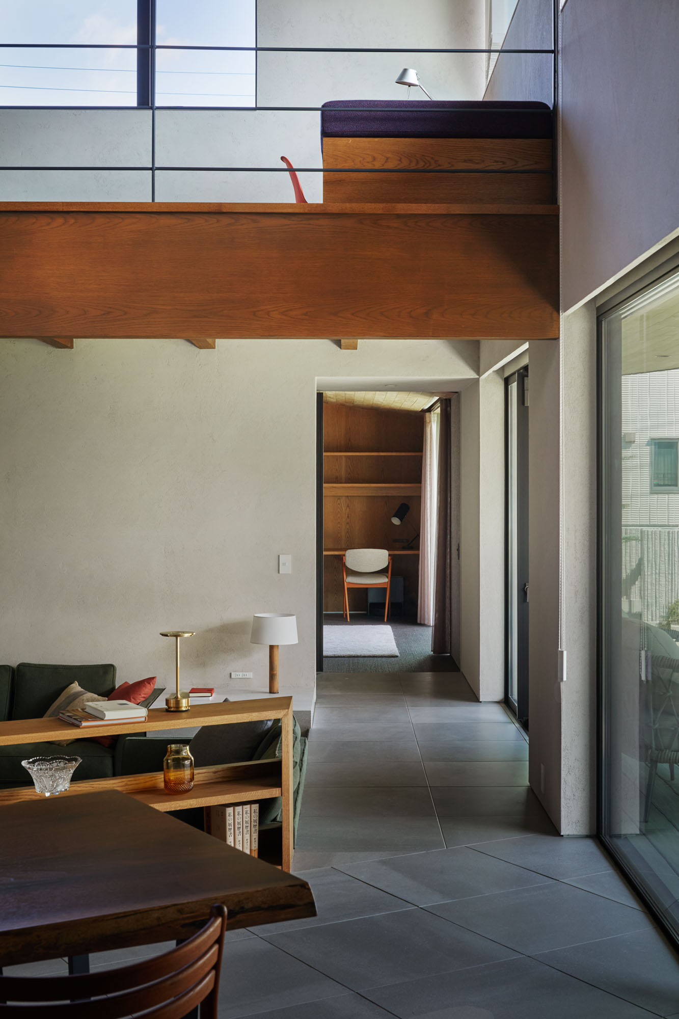 LDK。リビングとロフトが繋がる壁面を活用し本棚を造作。これからも増えるだろう蔵書にゆとりをもって対応できたうえ、家族皆が気軽にいつでも本を手に取り、気の向くまま場所を見つけて読書ができるようになった