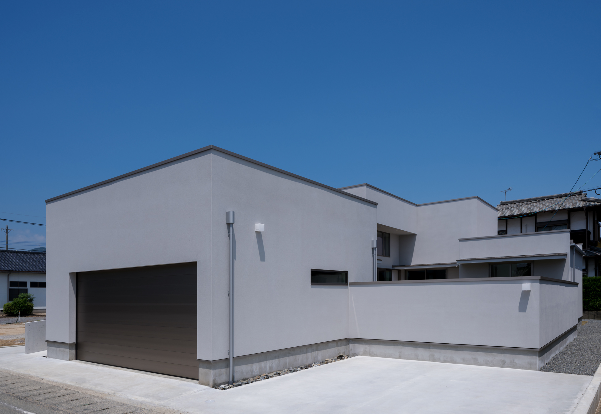 熊本市の熊本新港からほど近く、田園風景が広がる一角にN邸は建つ。周囲には純日本風の家屋が並ぶ中、コンクリート打ちっ放しを思わせる都会的な雰囲気が目を引く。まさに邸宅と呼ぶに相応しい佇まいだ。