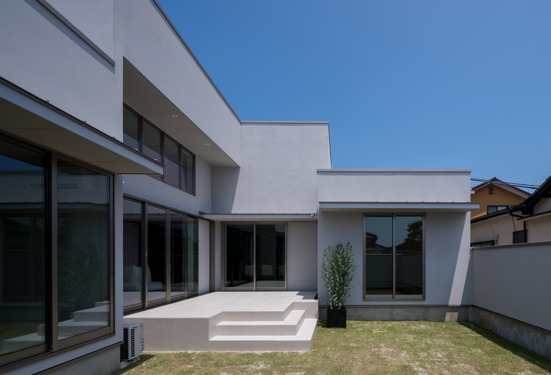 プライバシーを確保しつつゆったりとした空間の中庭。窓の位置や大きさ、庇の張りだし具合を巧みに計算し、雨の日でも濡れにくい他、夏の太陽は遮り冬の日差しは導く。