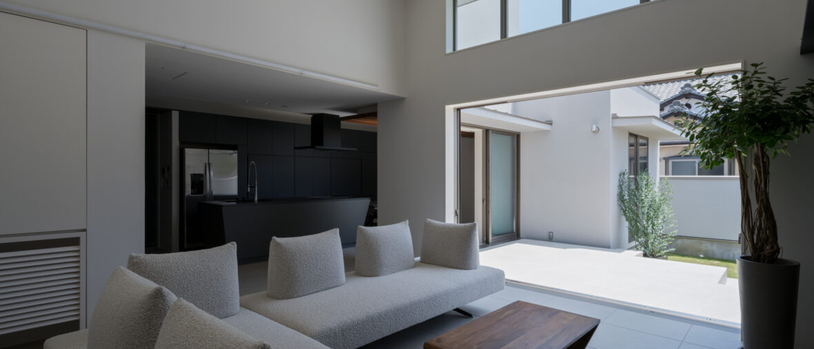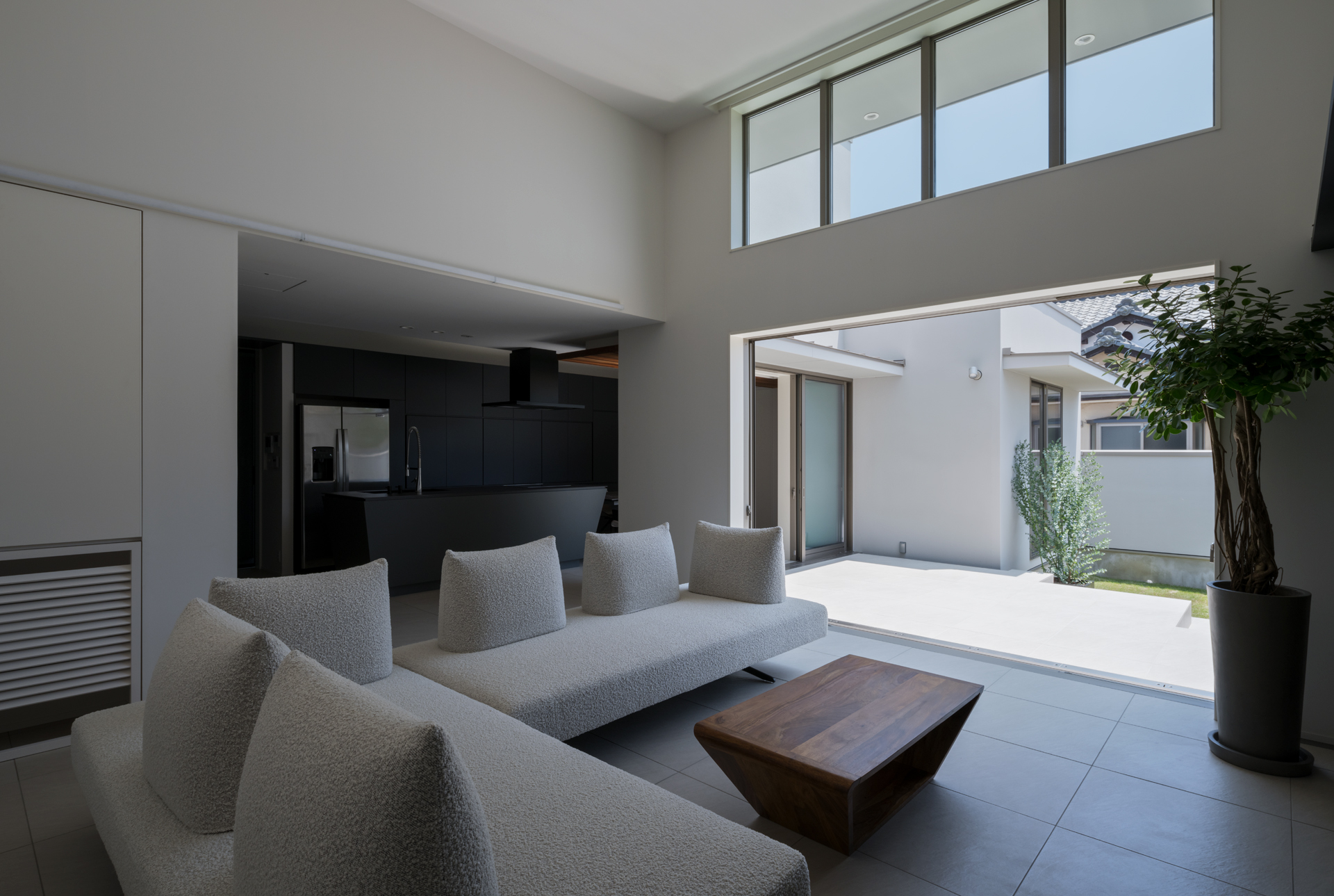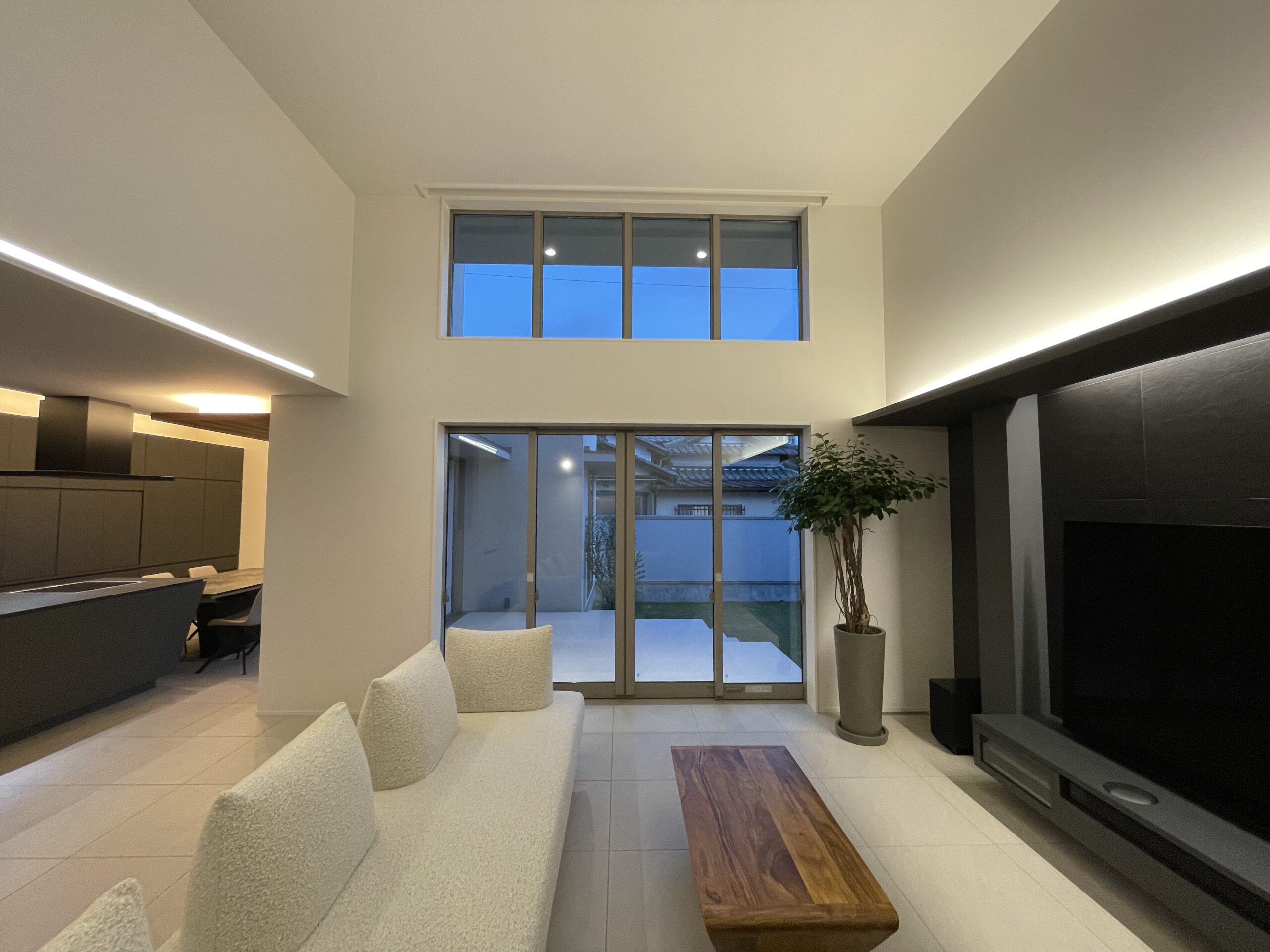 天井の低い玄関から一転、高さ4mの天井、大窓・高窓がもたらす抜群の開放感。まるで高級リゾートのヴィラのような佇まい。