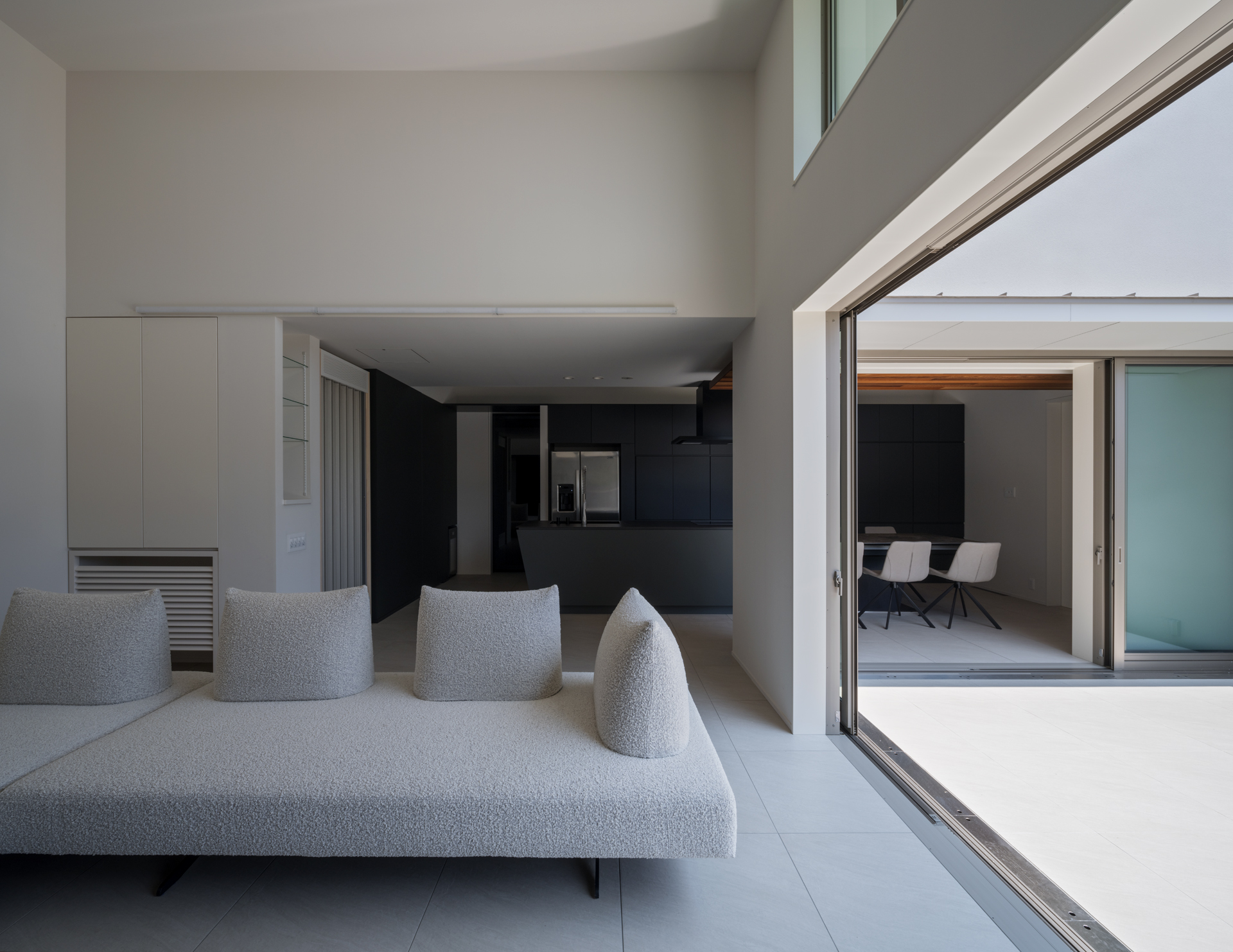 また建物は平屋だが、用途ごとに天井高を少しずつ変えた。部屋ごとに見える景色も天井高も異なり、奥へ進むにつれて、パブリックからプライベートへとグラデーションのように変化していく。単なる「平屋」の枠を超えた、豊かな空間体験を生み出す設計だ。