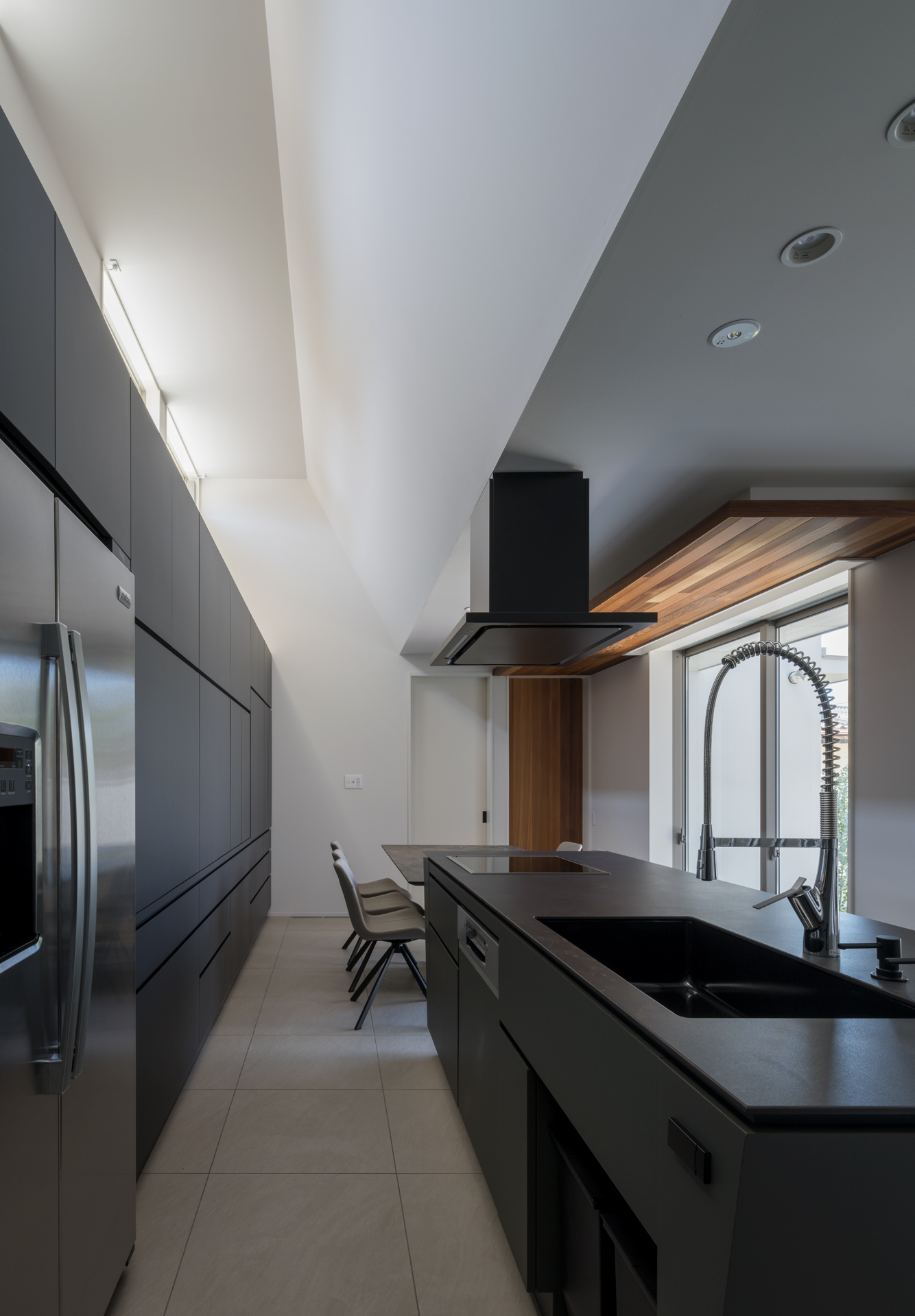 リビングの先には、ブラックで統一されたシックなキッチンが続く。キッチンや収納棚は堺さんの手による造作だ。東側上部に設けられた高窓から差し込む朝の光が、壁に反射しキッチンを照らすとともに、換気口の役目を果たすよう設計されている。