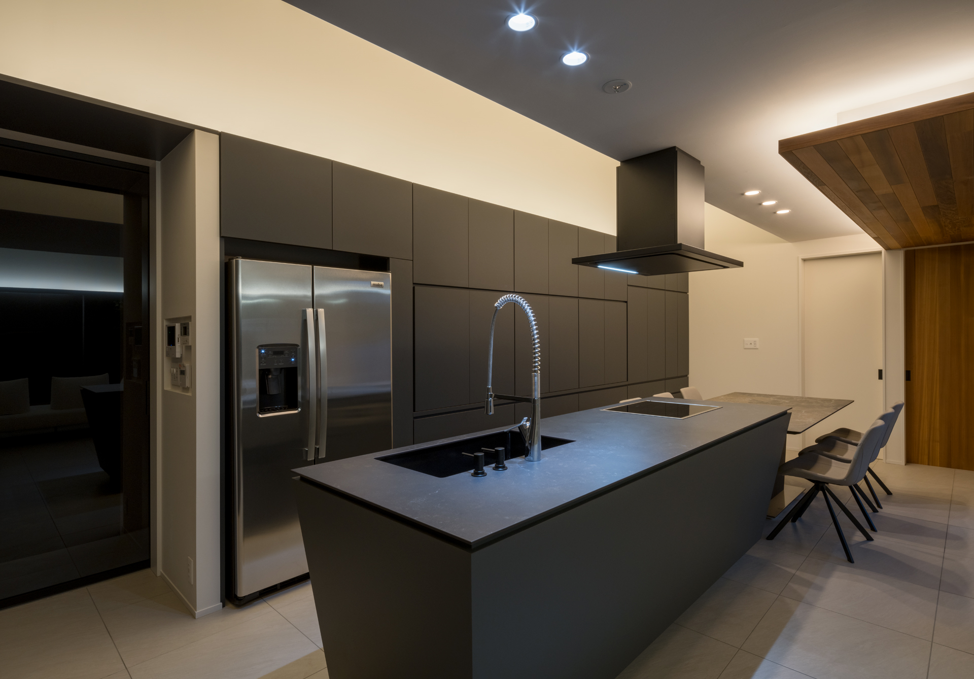 天井高を低くしたキッチンはブラックで統一されたシックな装い。堺さんが設計した収納棚は、使用時に開いた扉が邪魔にならないよう収納できるよう(垂直収納扉)になっているという。