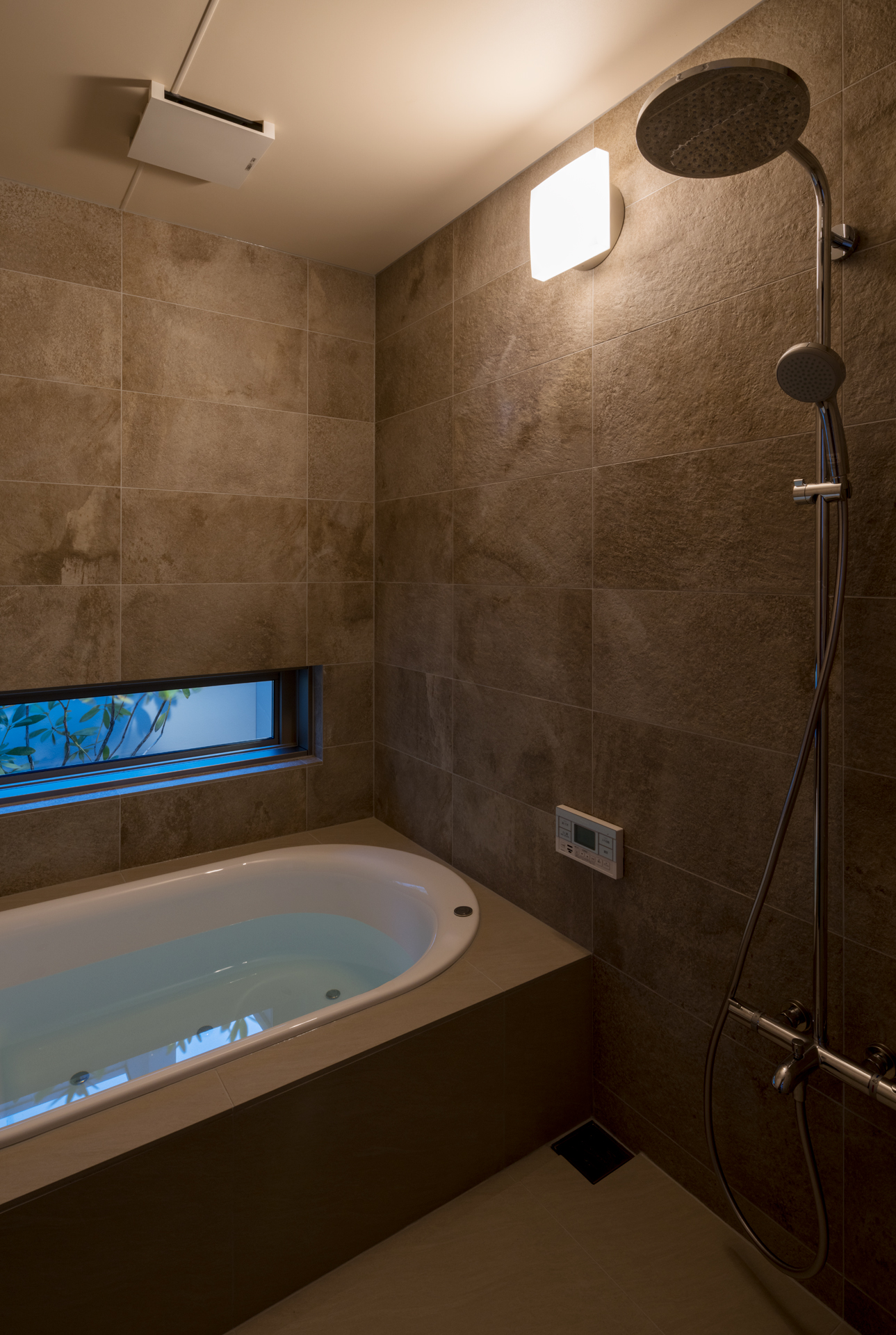 シックなバスルームは、ホテルライクな仕様。坪庭の景色を眺めながらプチ露天風呂気分。