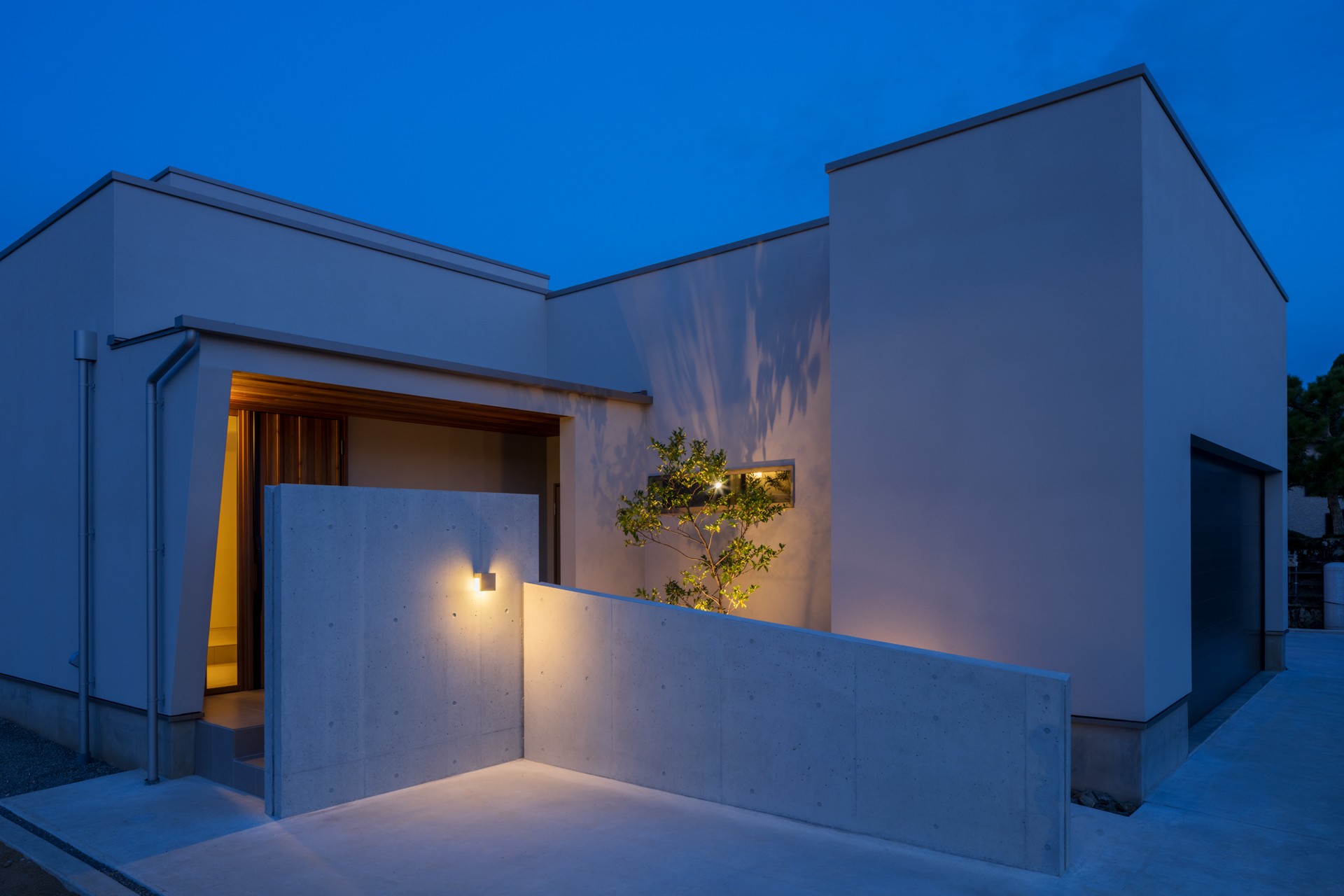 道路から玄関が丸見えにならないようコンクリートの壁で目隠し。ライトアップされた木の陰がシックな雰囲気を醸し出している。