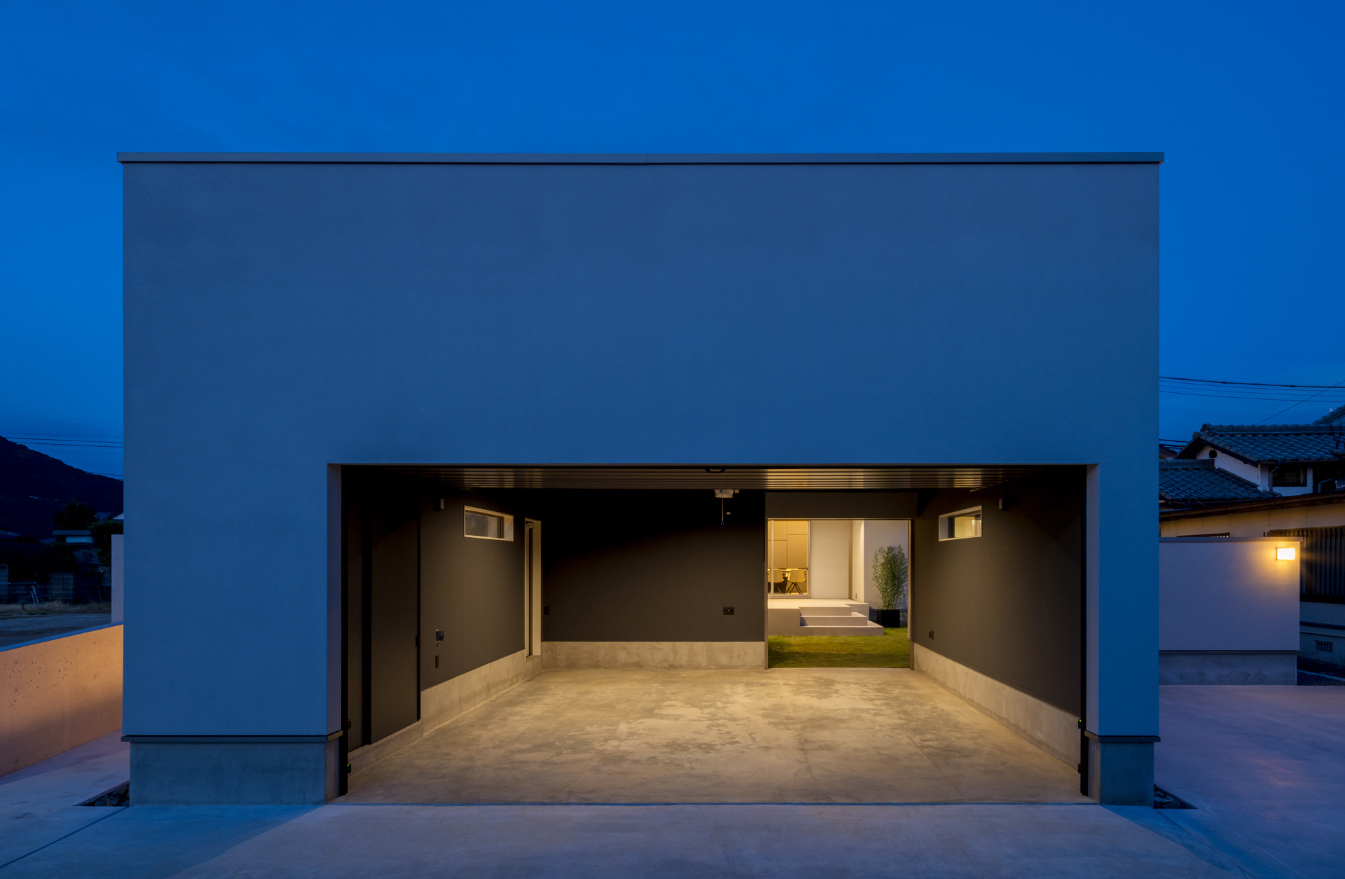 車2台が余裕で納められるガレージ。右奥に、中庭に続く開口を設けている。隣には来客用の駐車スペースも確保した。