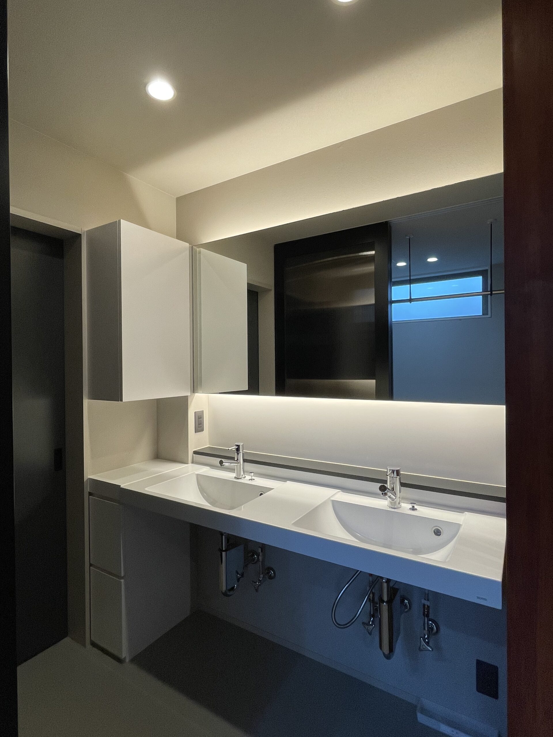 洗面は同時使用が可能な2ボウルに。床面を広く使うためにあえてシンク下をオープンにしたという。