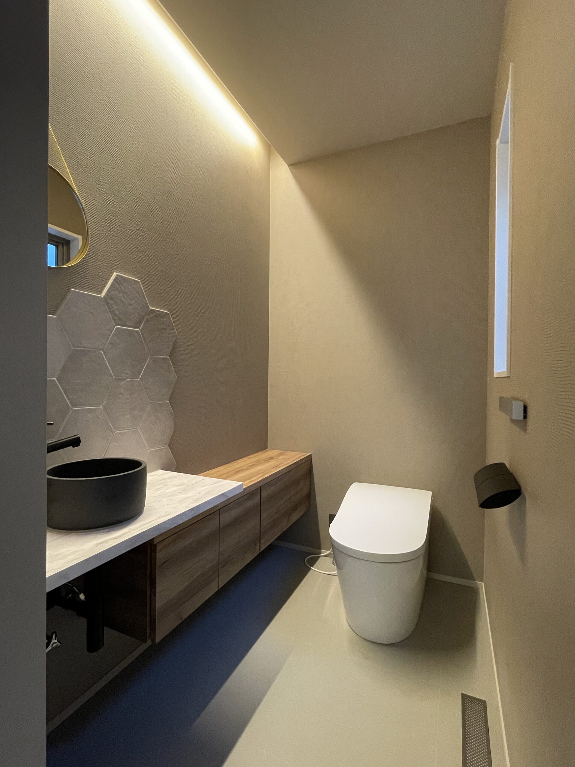 落ち着いた雰囲気のトイレ。奥様が選んだという六角形のタイルが良いアクセントに。