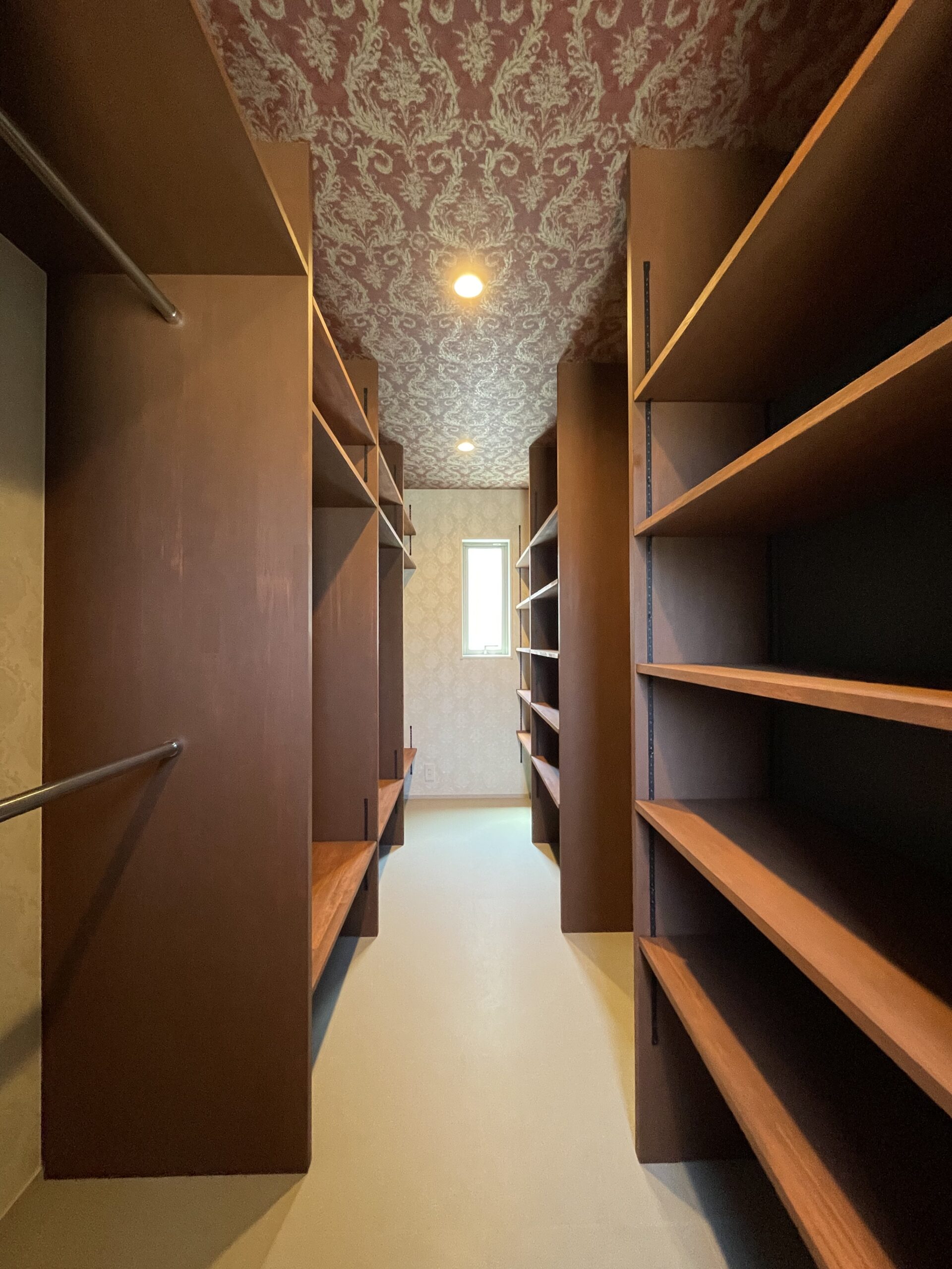 棚やハンガーラックが並ぶ大容量のWIC。天井には高級感ある壁紙を採用した。